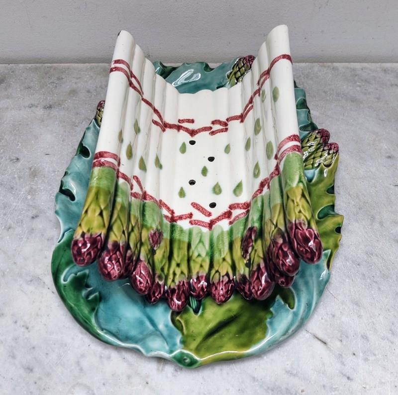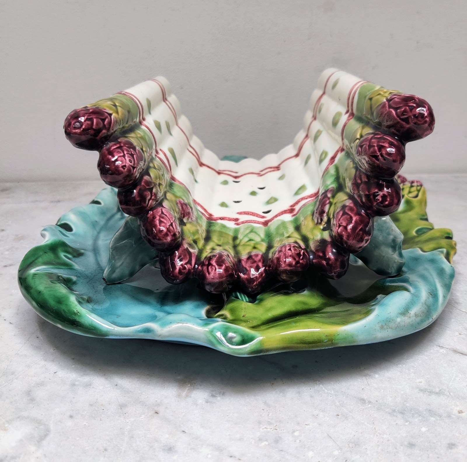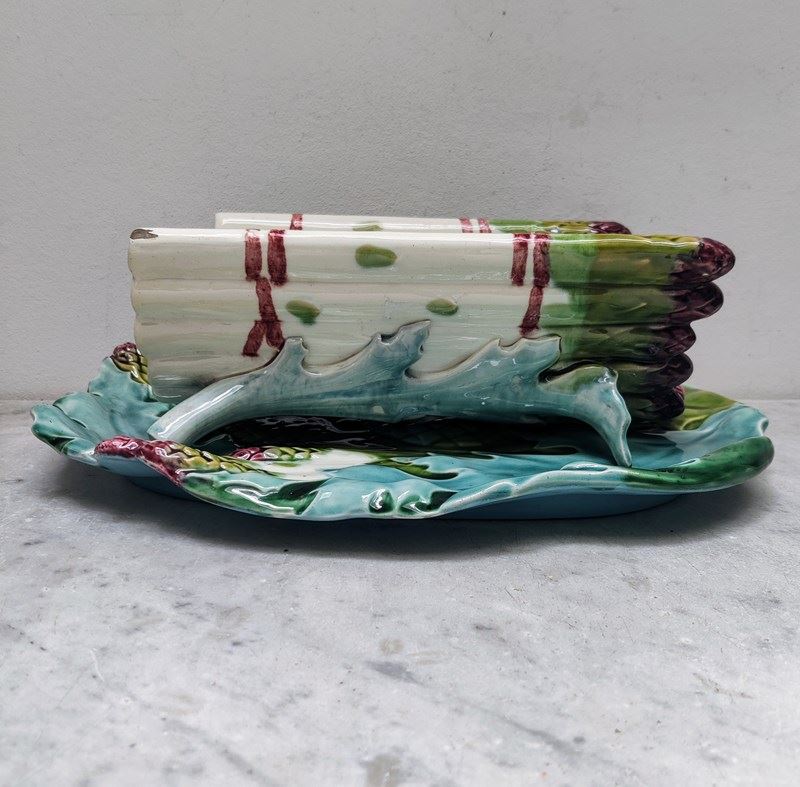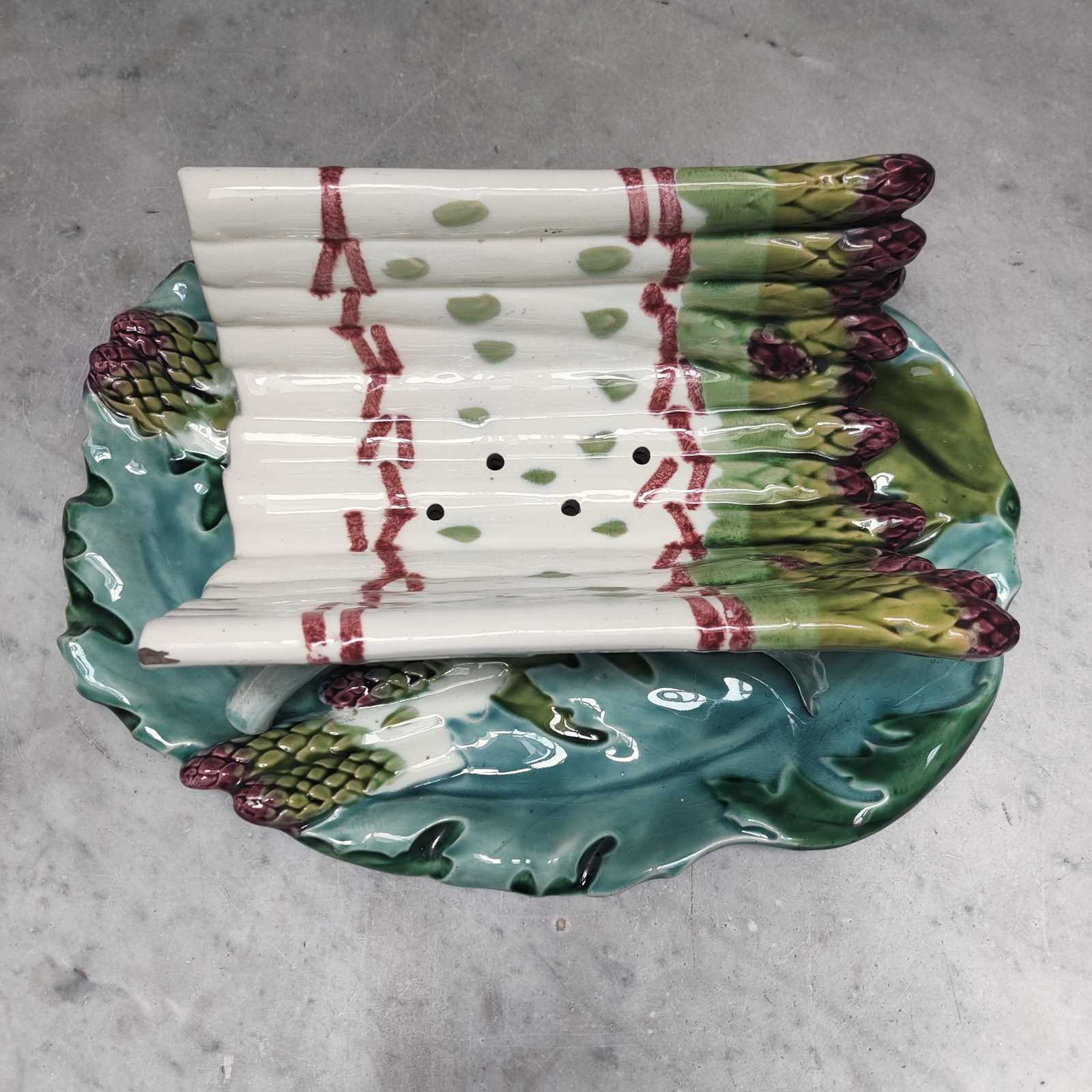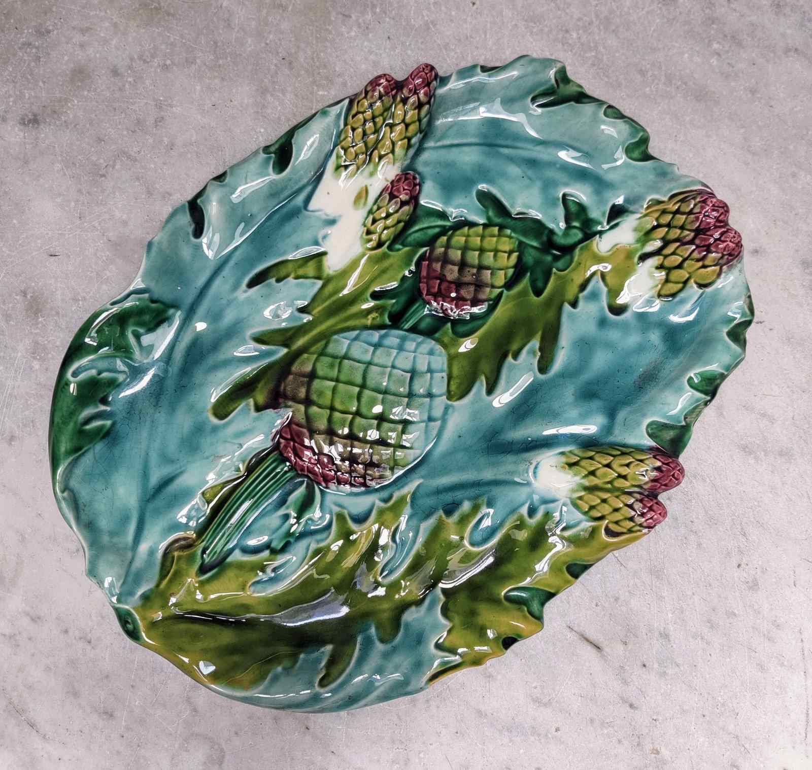 'Barbotine' or Majolica, a heavily moulded Asparagus platter and Asparagus serving dish, manufactured by Luneville