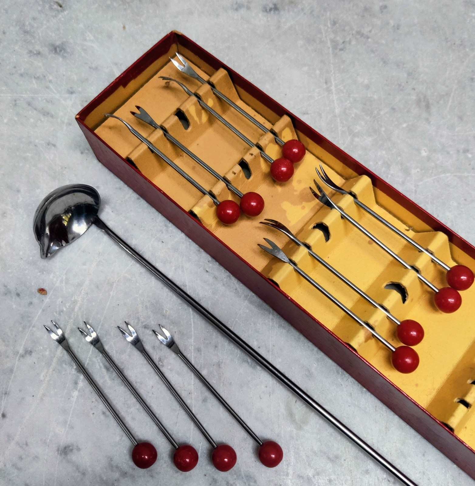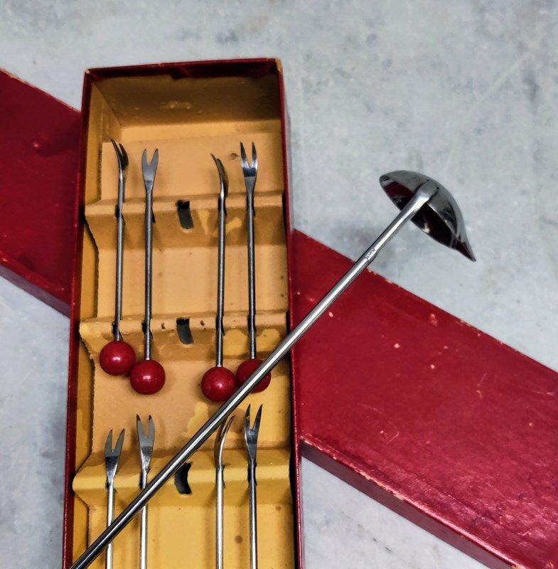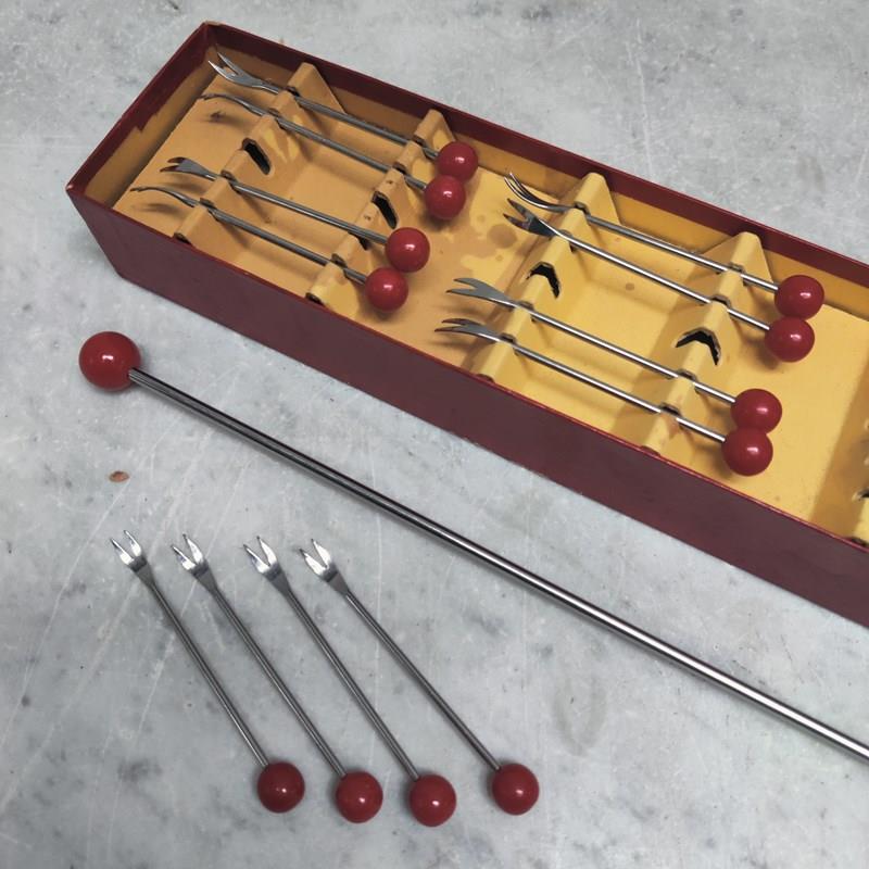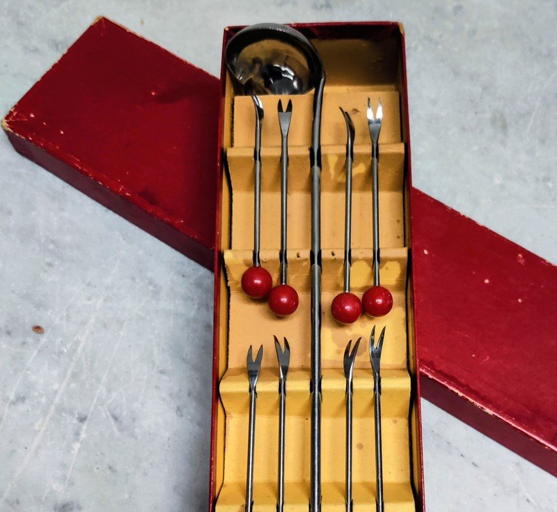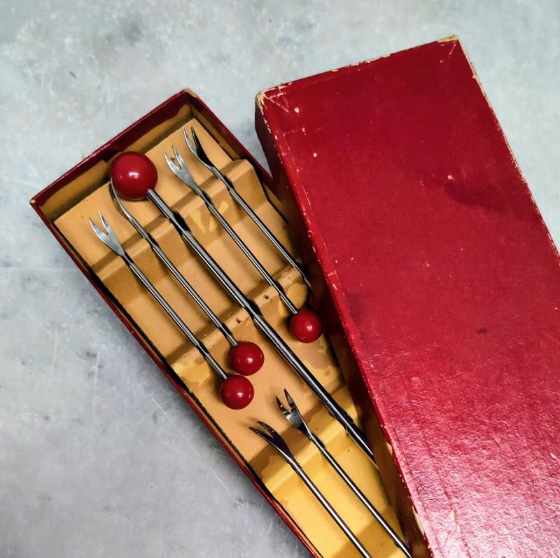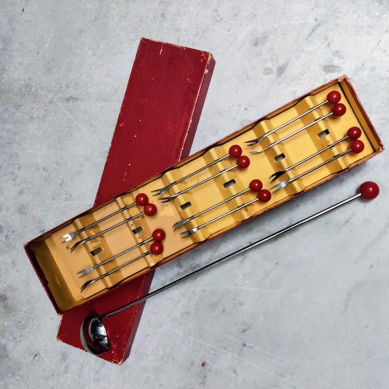 French 'Art Deco' Cherry Bakelite Cocktail Forks & Ladle