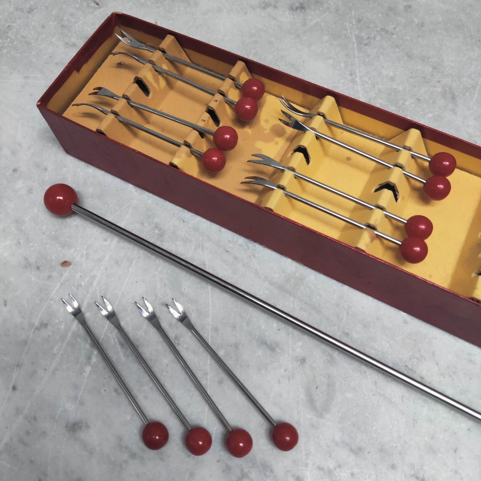 Stylish set of French Cocktail forks and large spoon, in original crimson box