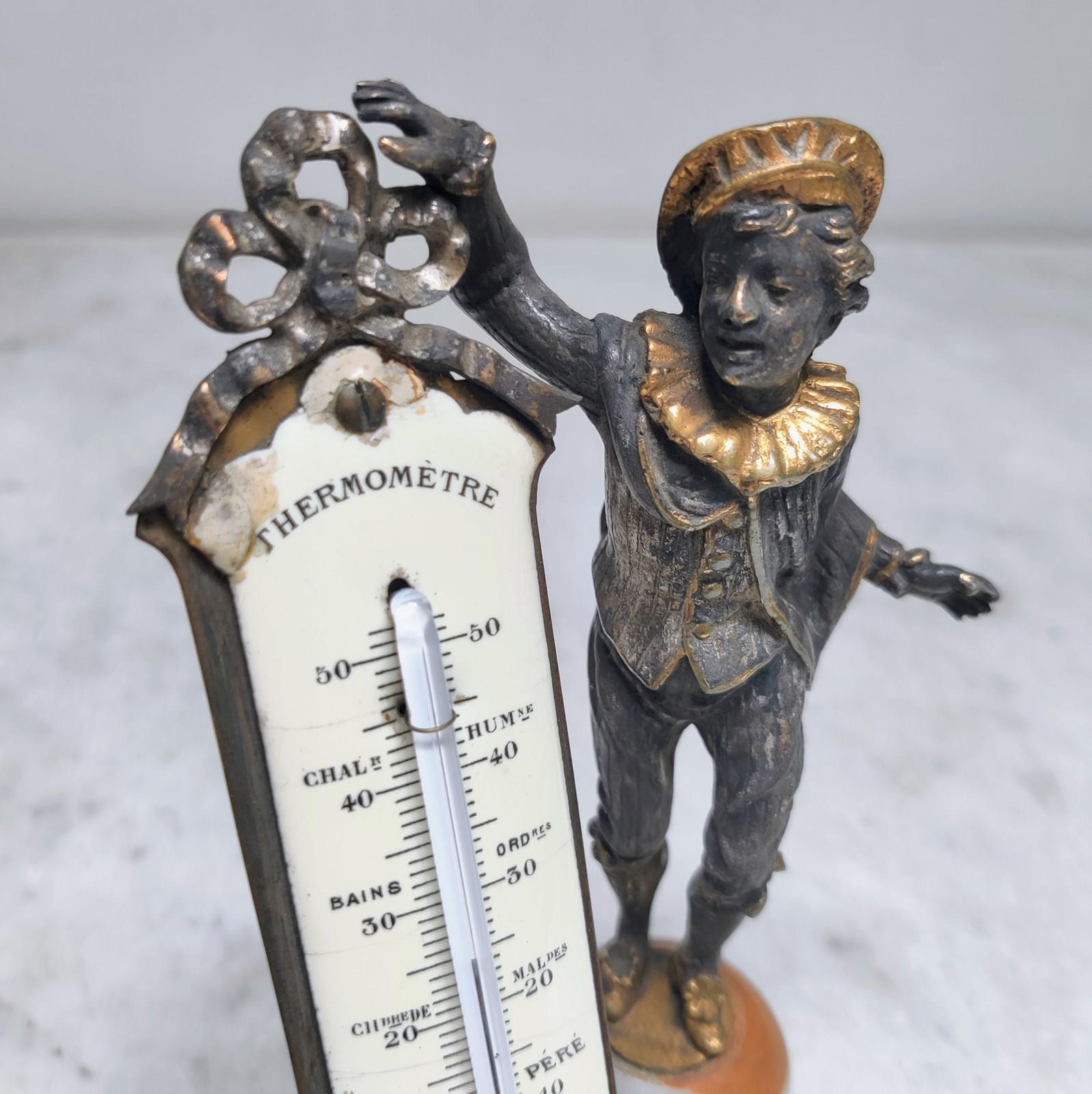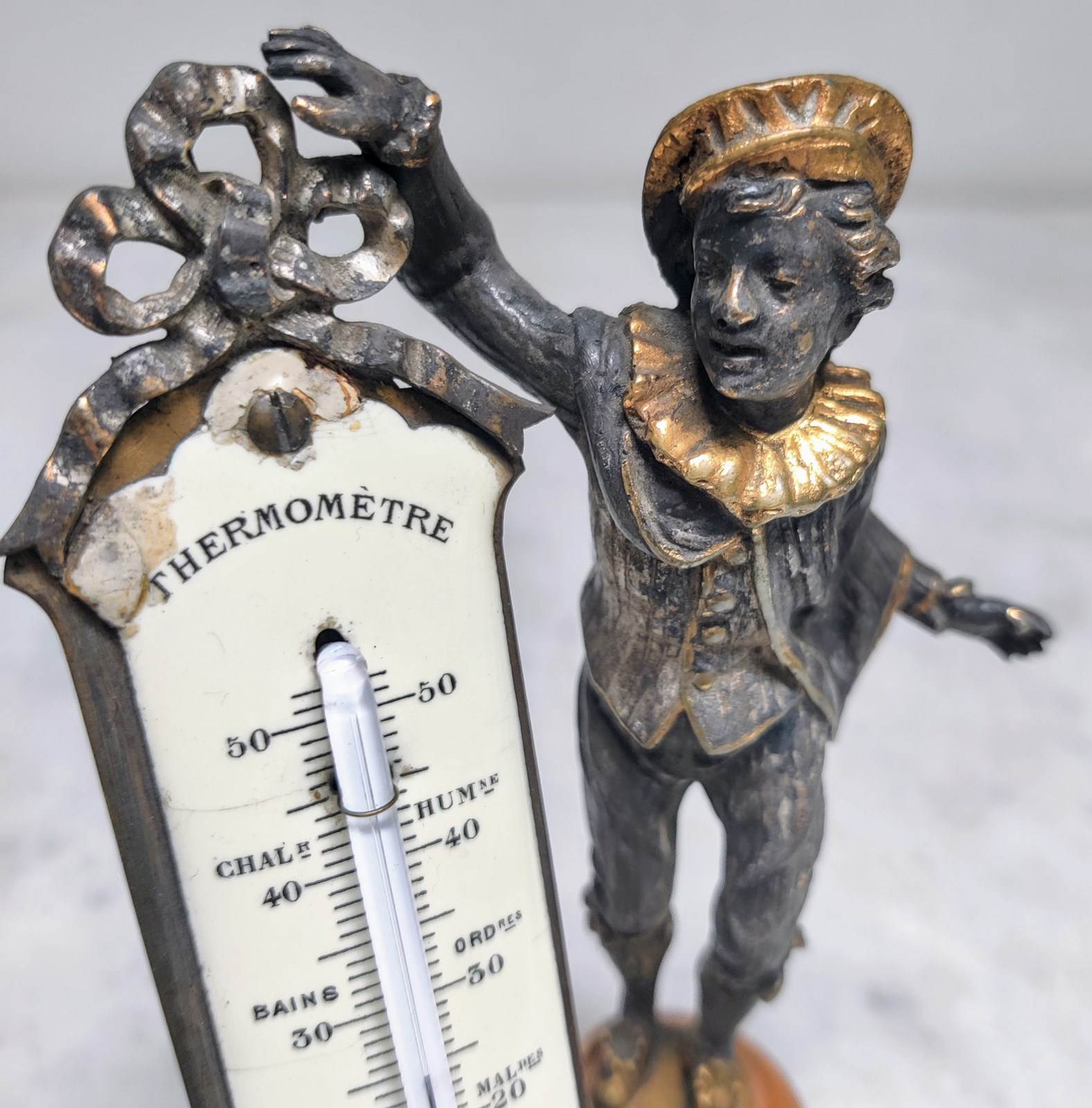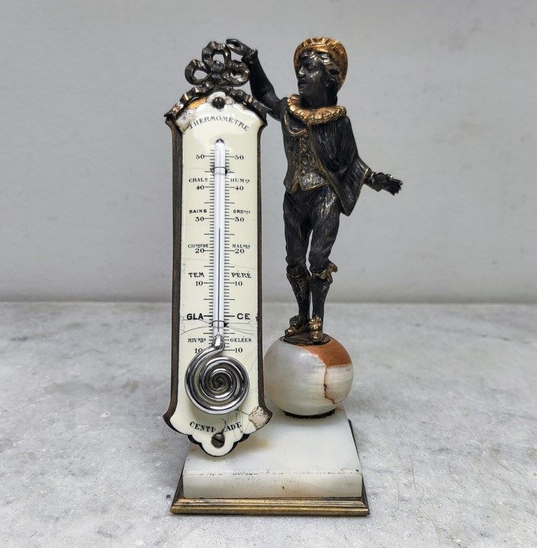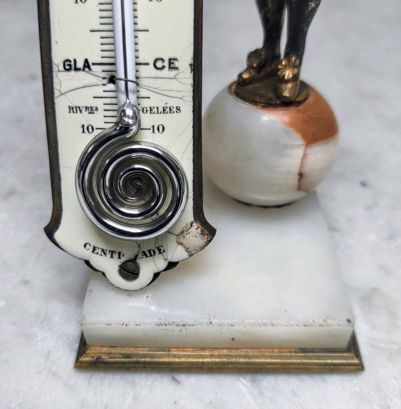 It features a little French boy in in 18th/19th Century costume, standing on a marble sphere and holding a bow topped enamel thermometer on a marble plynth