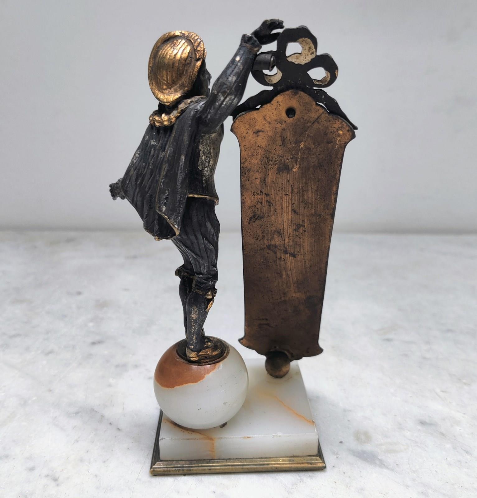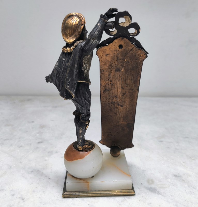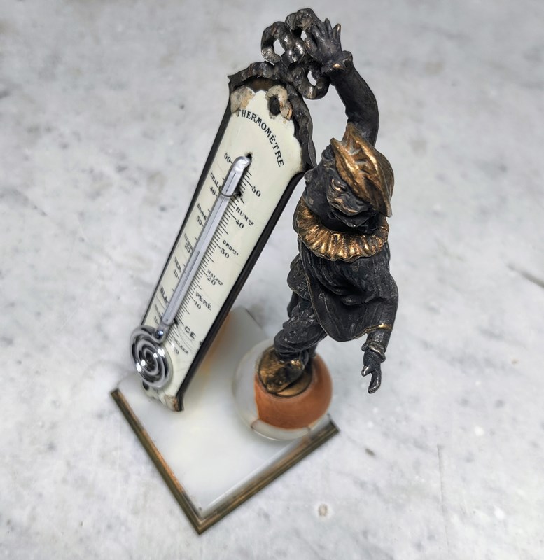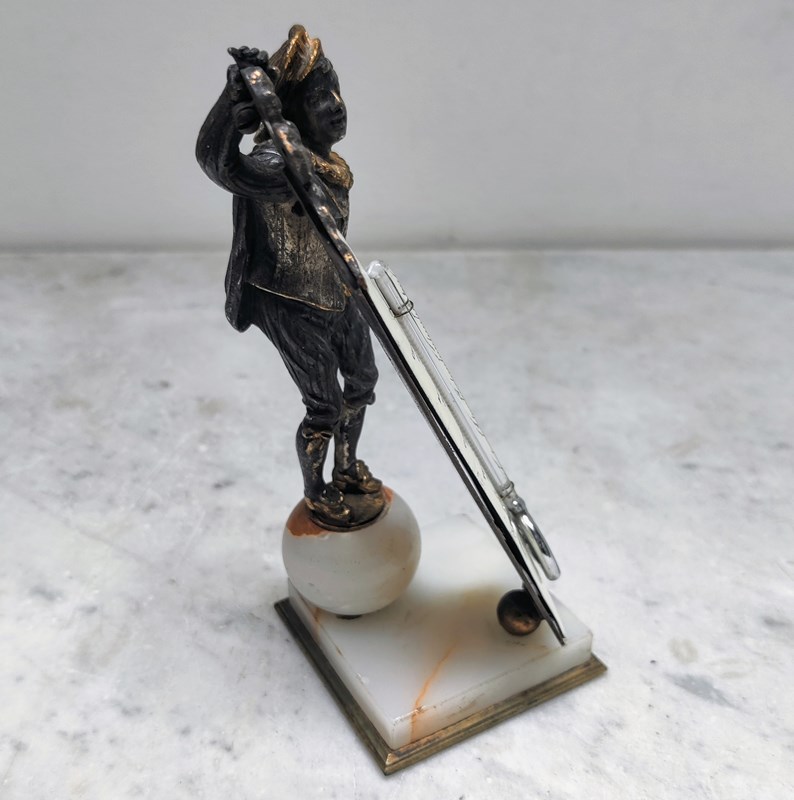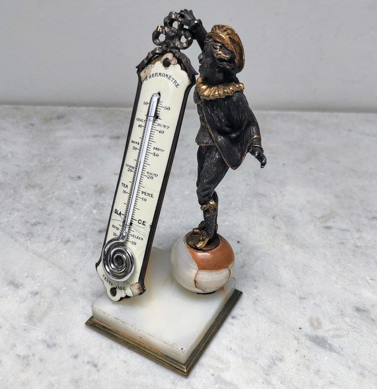 It features a little French boy in in 18th/19th Century costume, standing on a marble sphere and holding a bow topped enamel thermometer on a marble plynth
