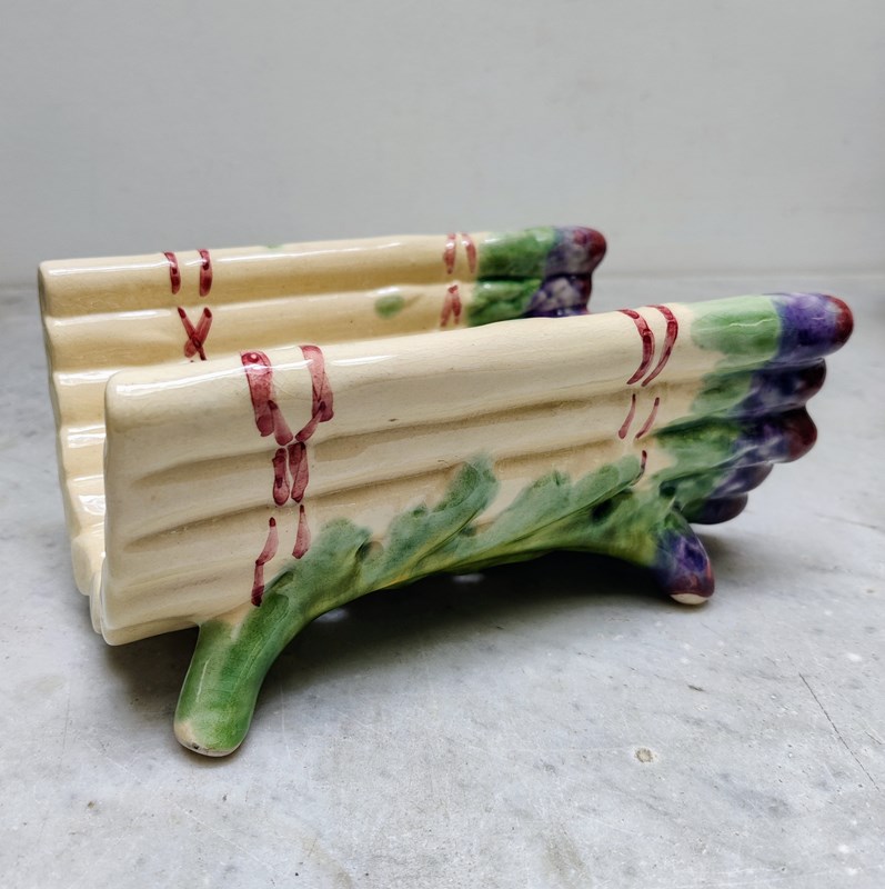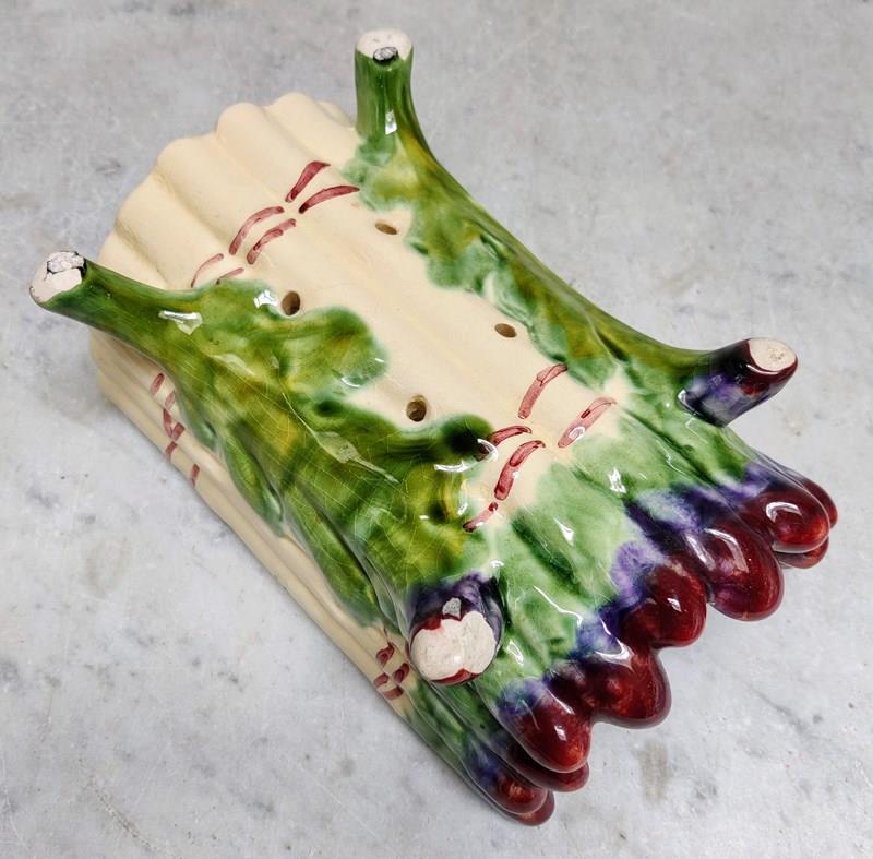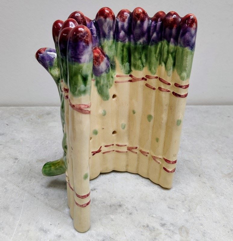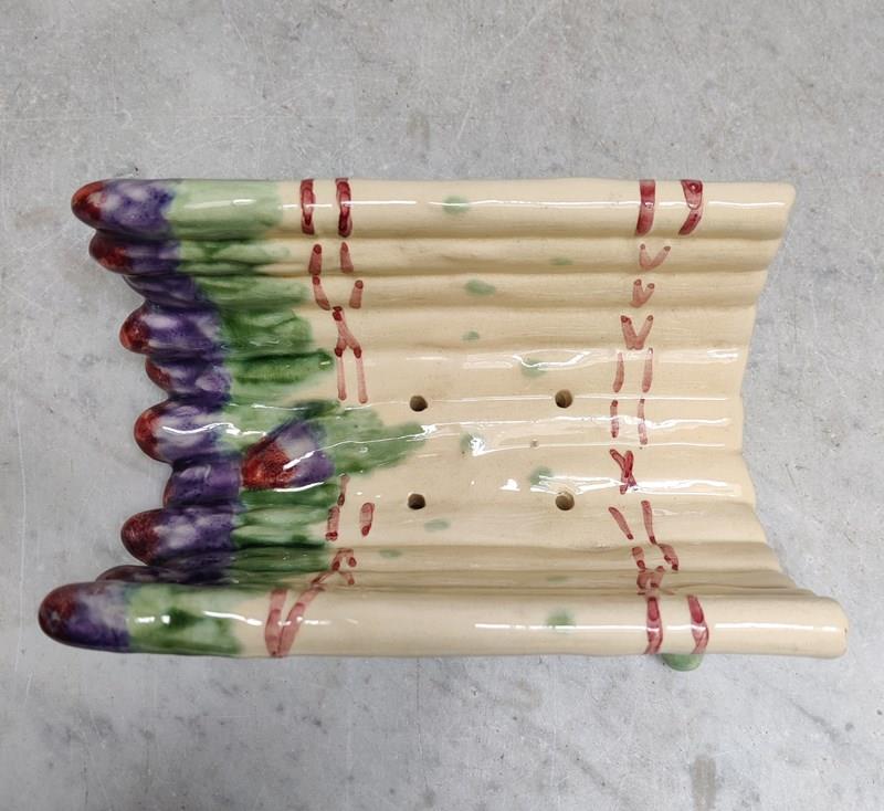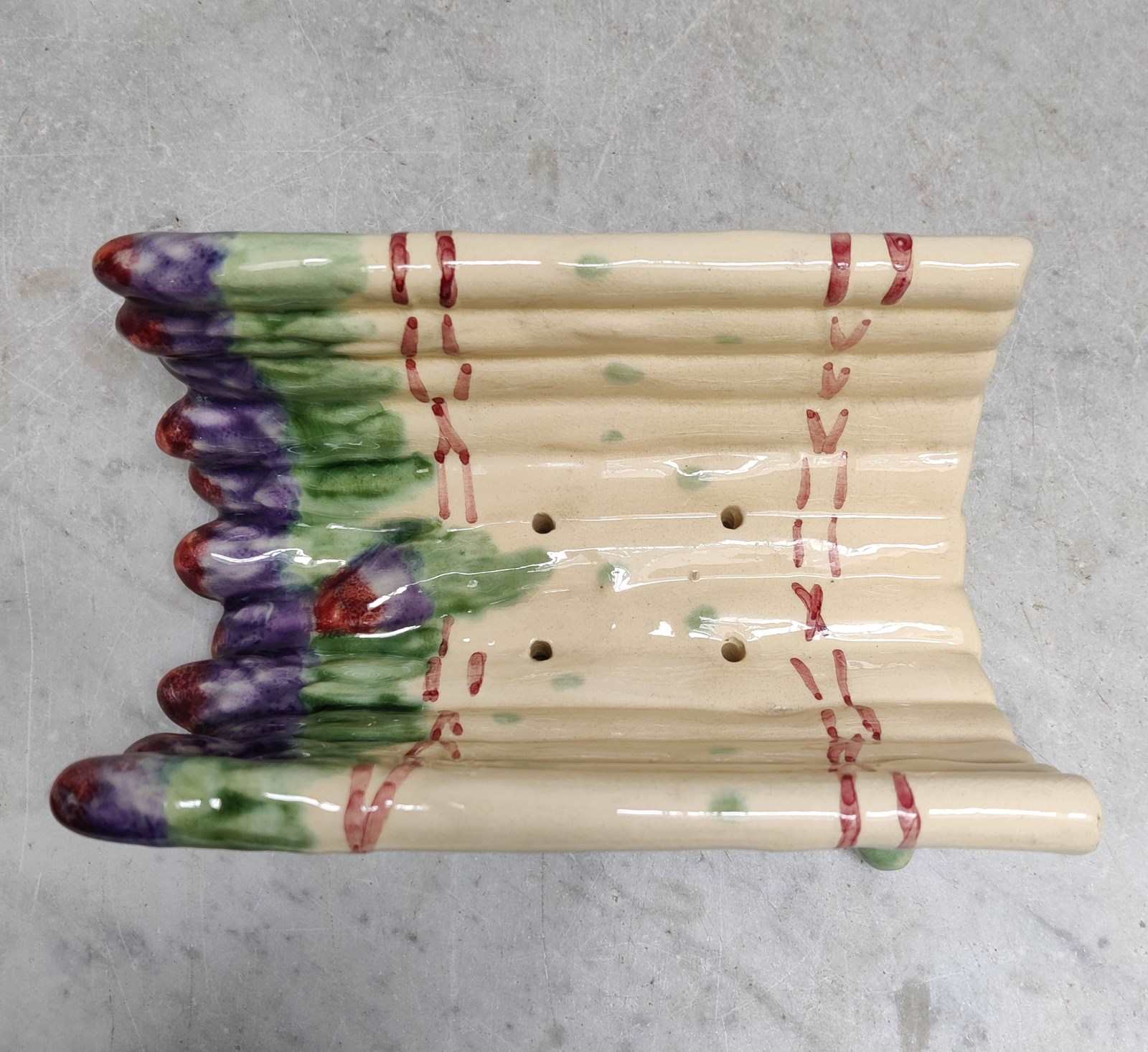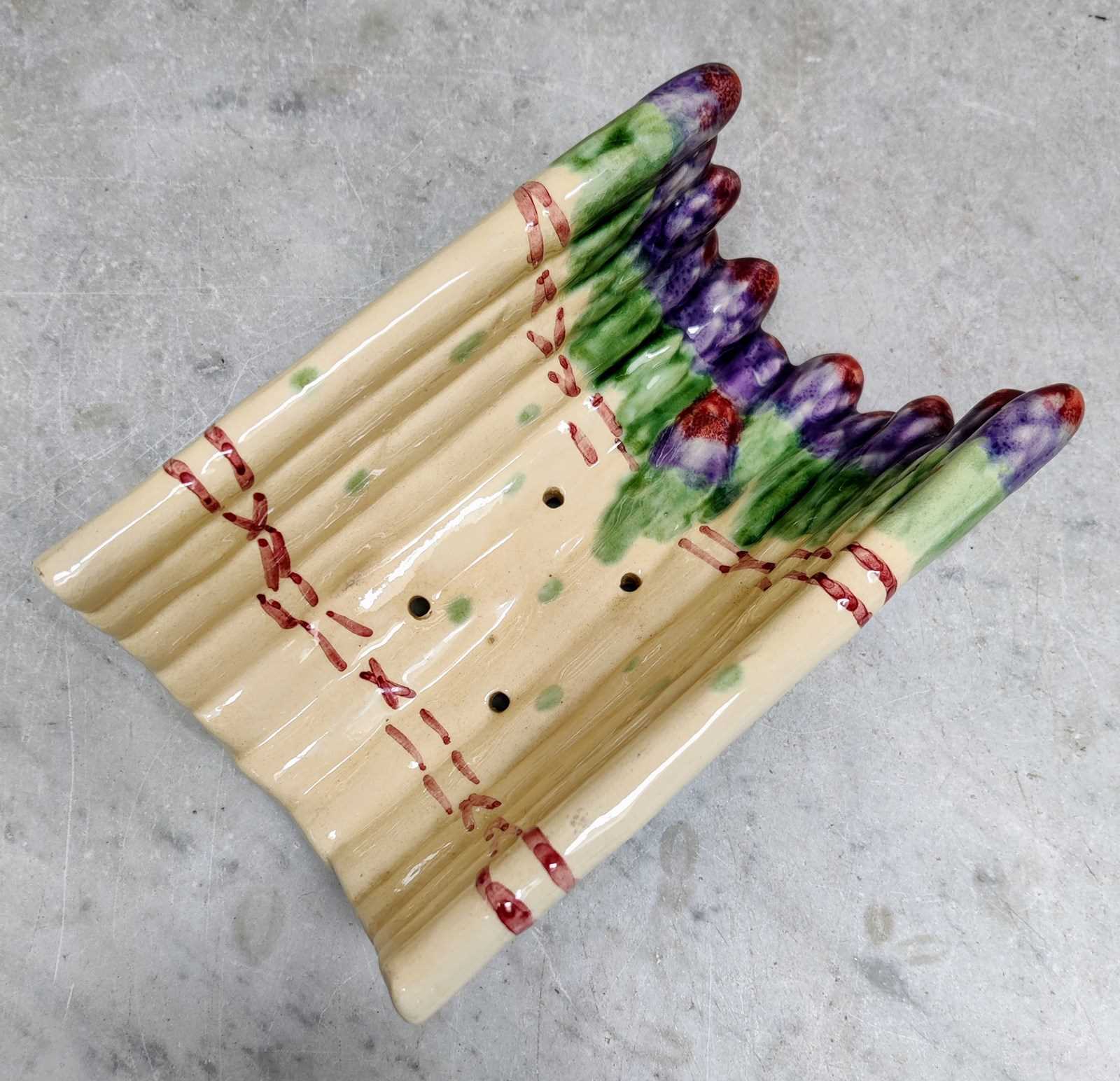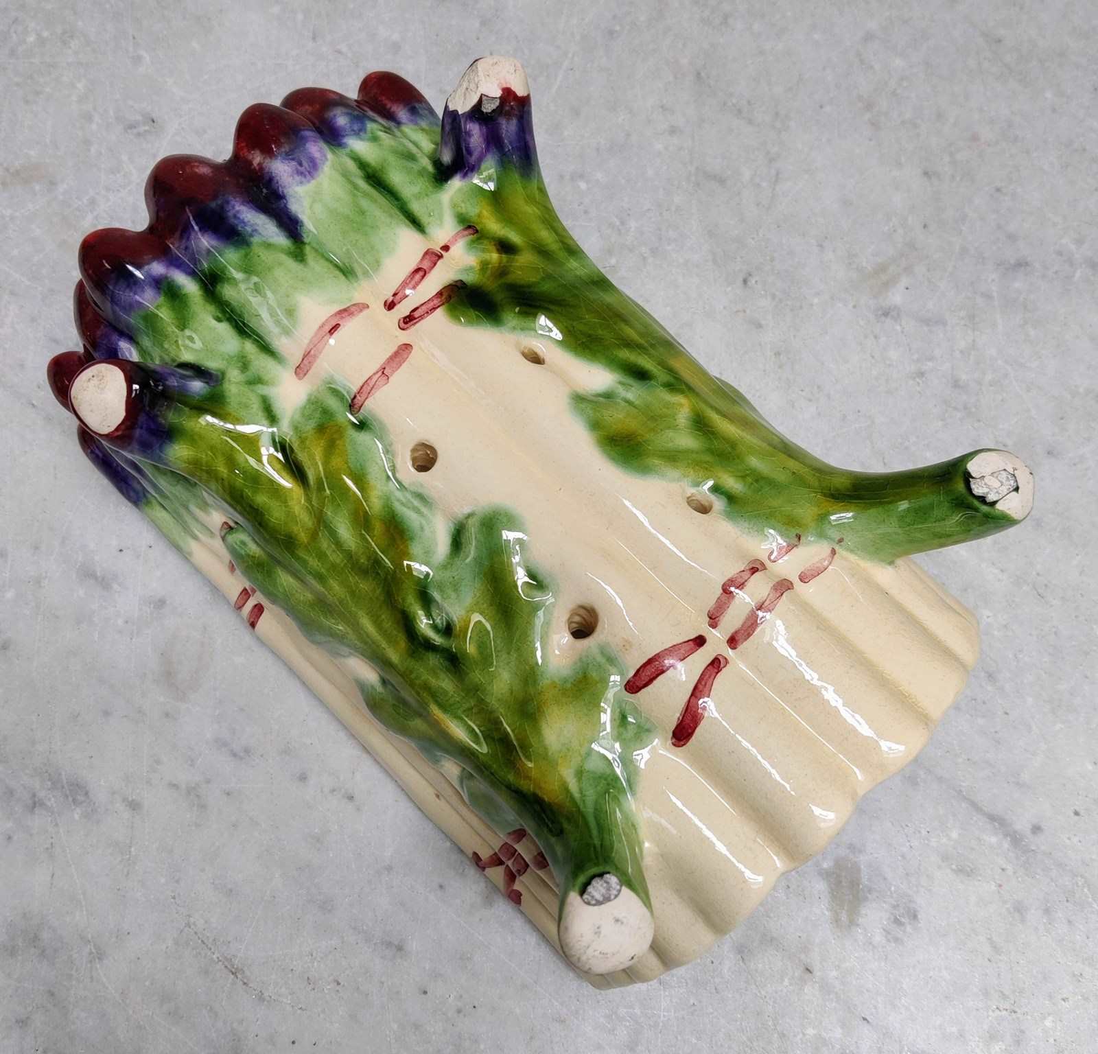 Lovely French Majolica/ Barbotine Asparagus dish, hand painted in greens, purples, cream and plum