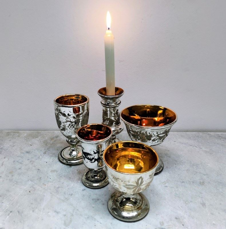 Mercury glass (silvered glass) is double walled glass with a silvering solution applied between the layers giving it a shining silver appearance