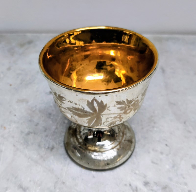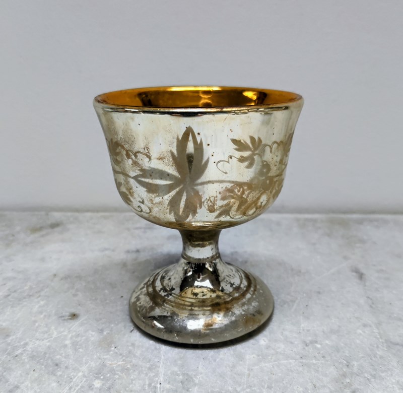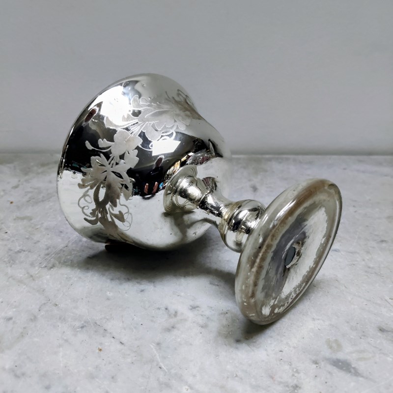 This Mercury glass footed bowl has etched 'Vine and Grape' decoration and is gilded inside