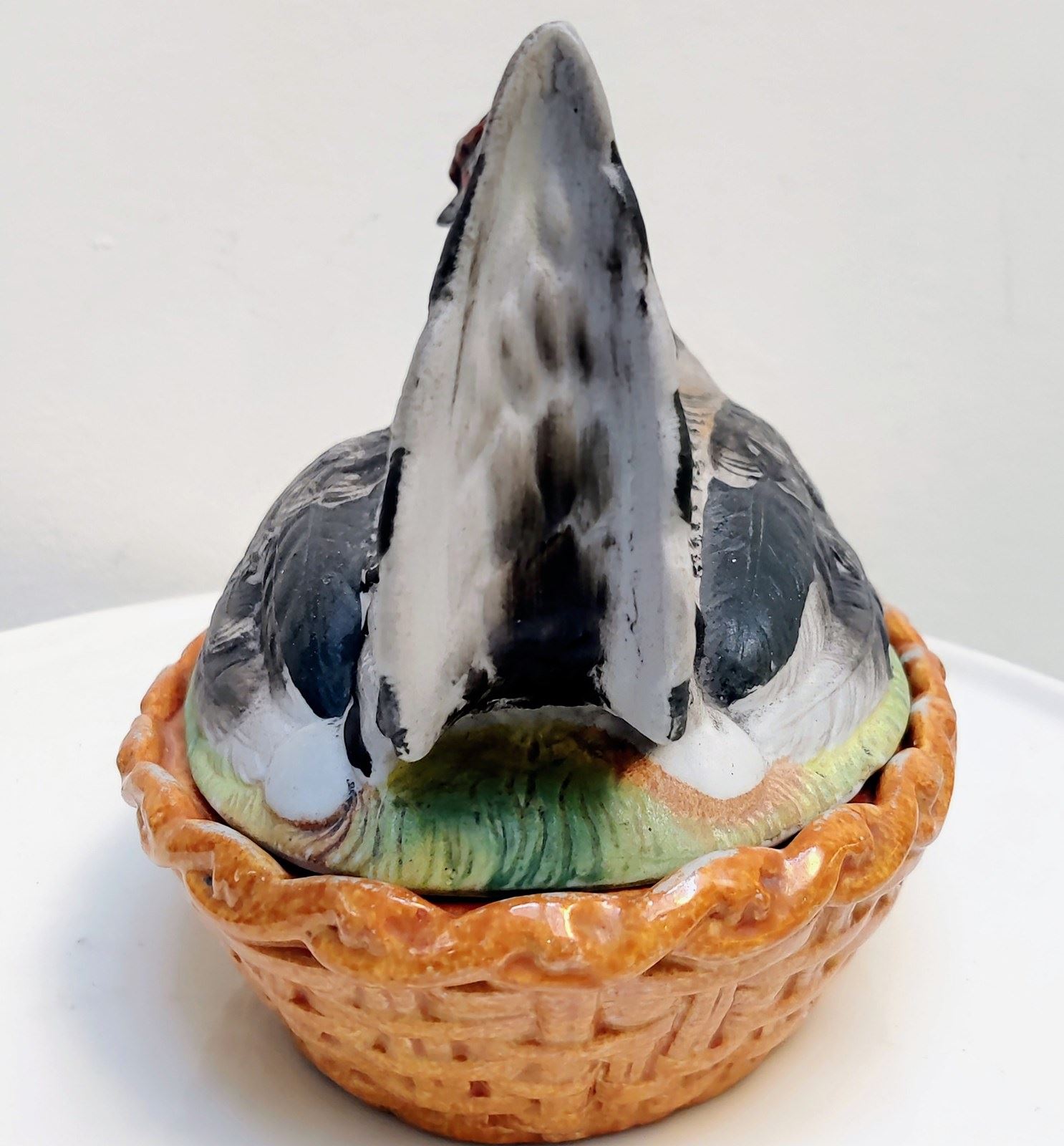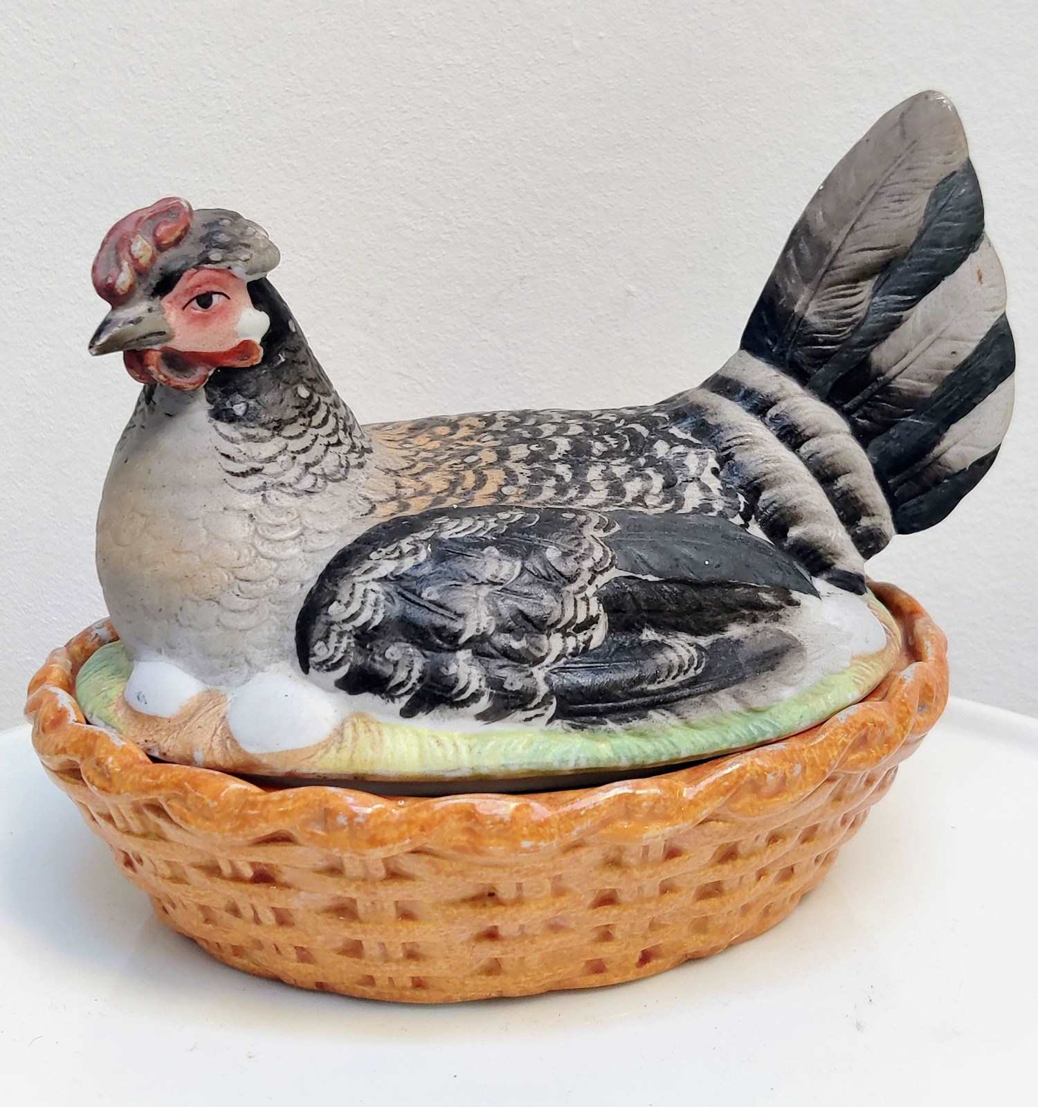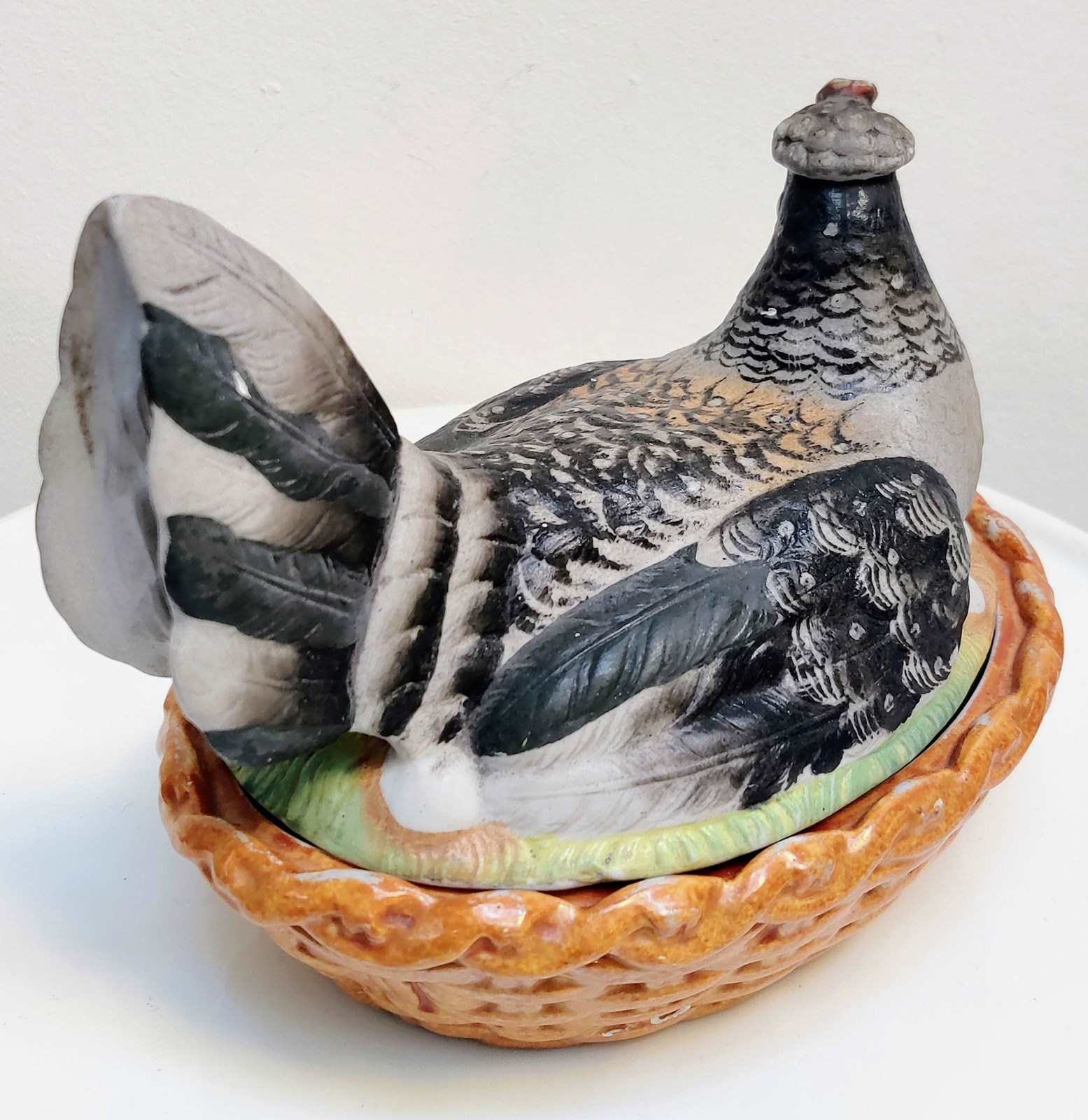 Gorgeous large speckled hen on her woven straw nest, 'hatching eggs'