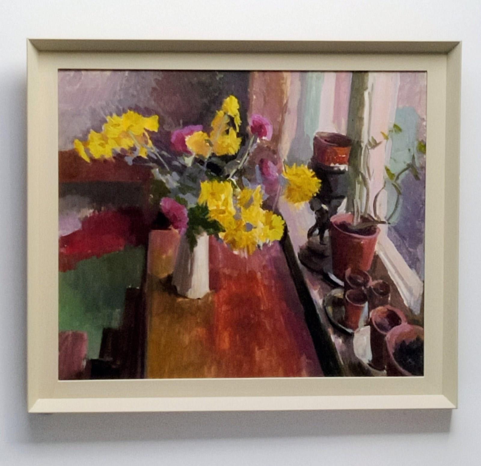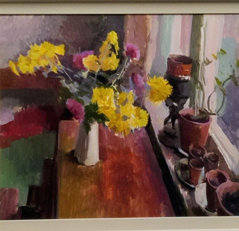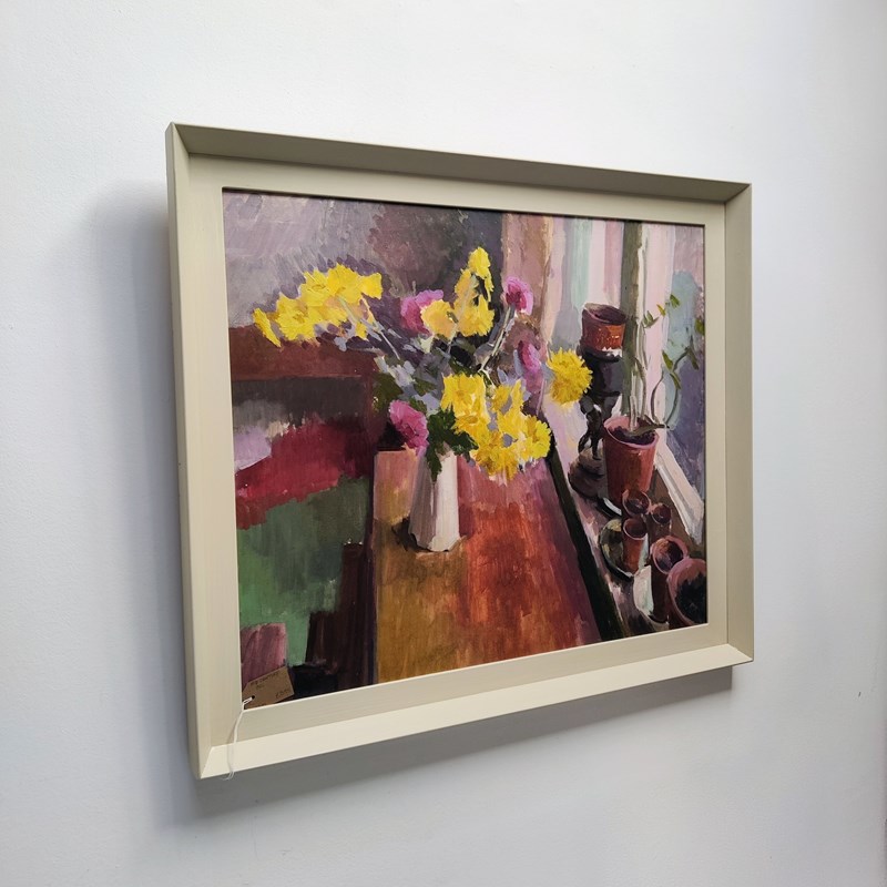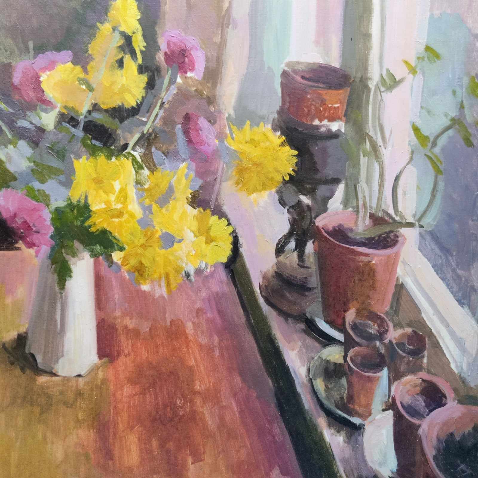 Enormous & charming Mid-Century oil on board of yellow and pink flowers adjacent to a window ledge of terracotta pots