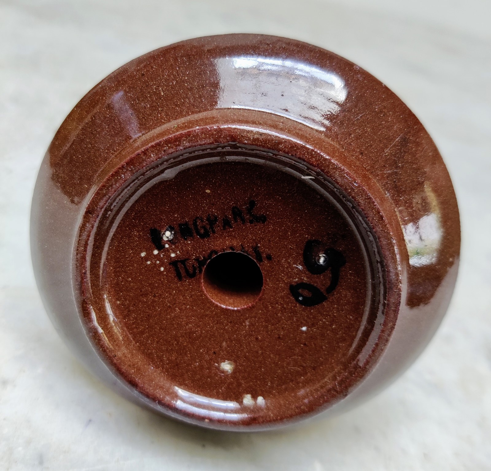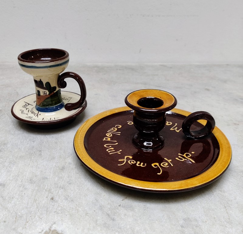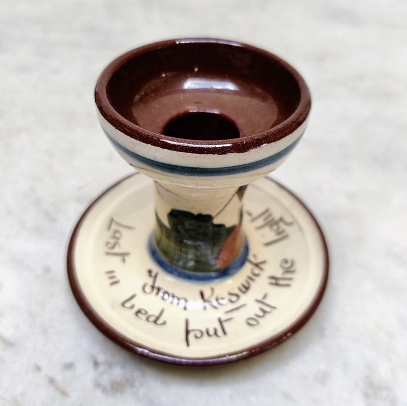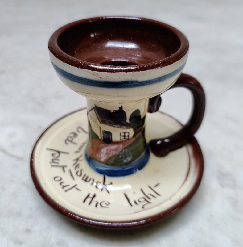 'Motto Ware' terracotta candlestick painted with a traditional cottage 'LAST IN BED PUT OUT THE LIGHT' 'FROM KESWICK' Marked LONGPARK TORQUAY underneath Condition: Perfect Dimensions: Height 8.5cm, max diameter 9.5cm Shipping: Tracked and insured £5