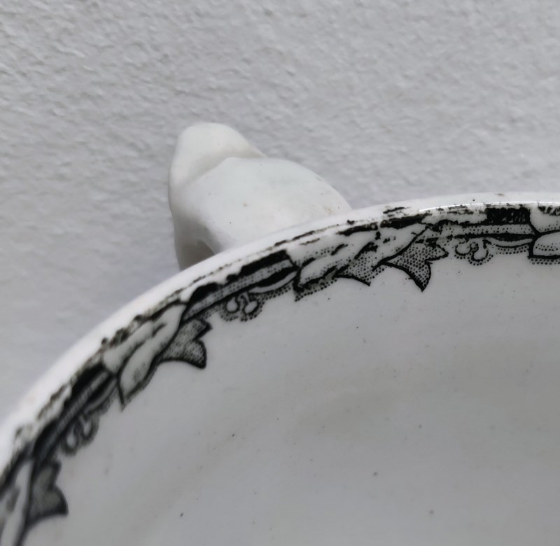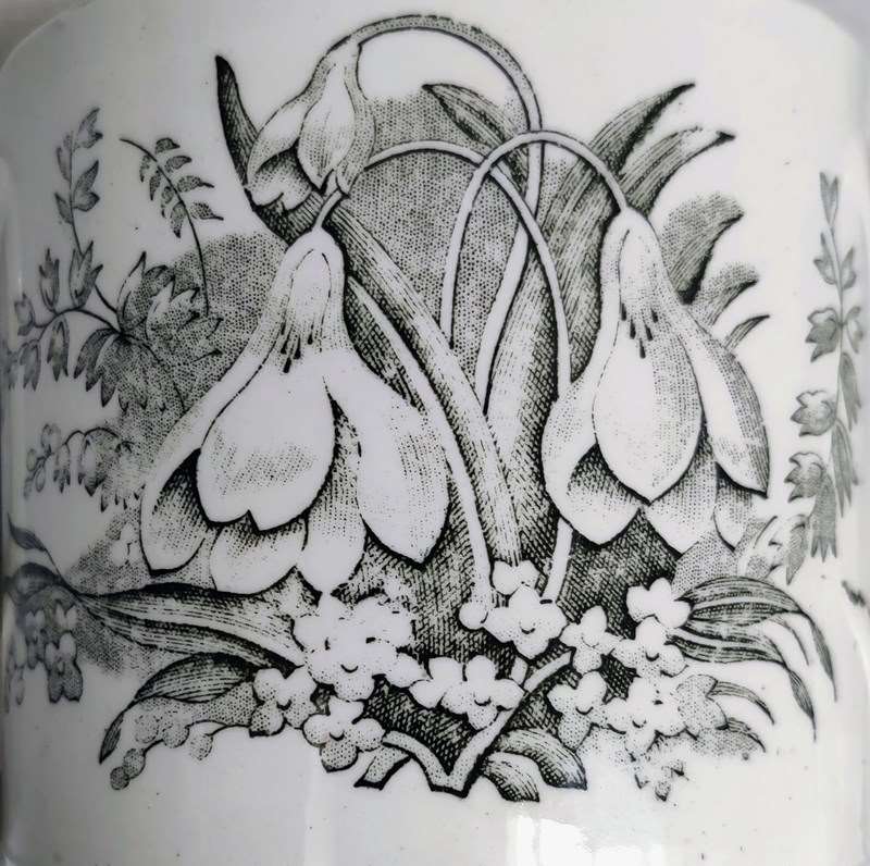 Showing a black and white print of Snow Drops planted in ferns and grasses, with Ivy garland around the rim, image 5