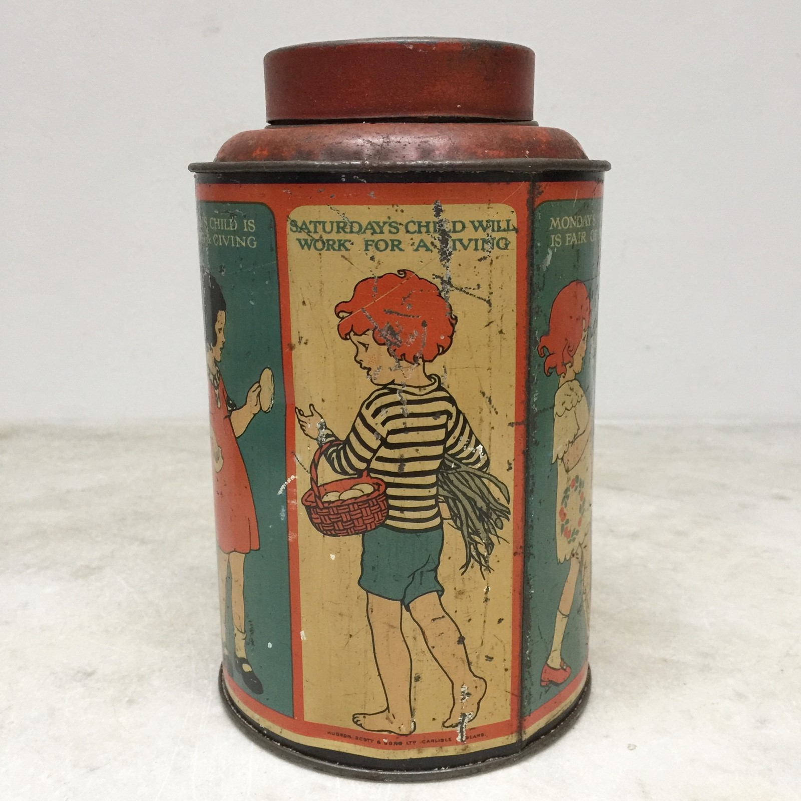 Charming and decorative 1920's round tin- Six sided, depicting the ages old birth day poem twinning personality to each day of the week