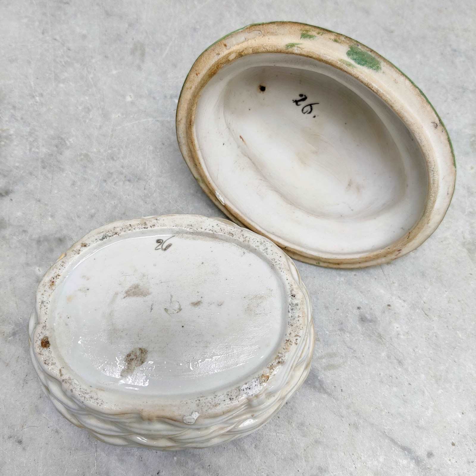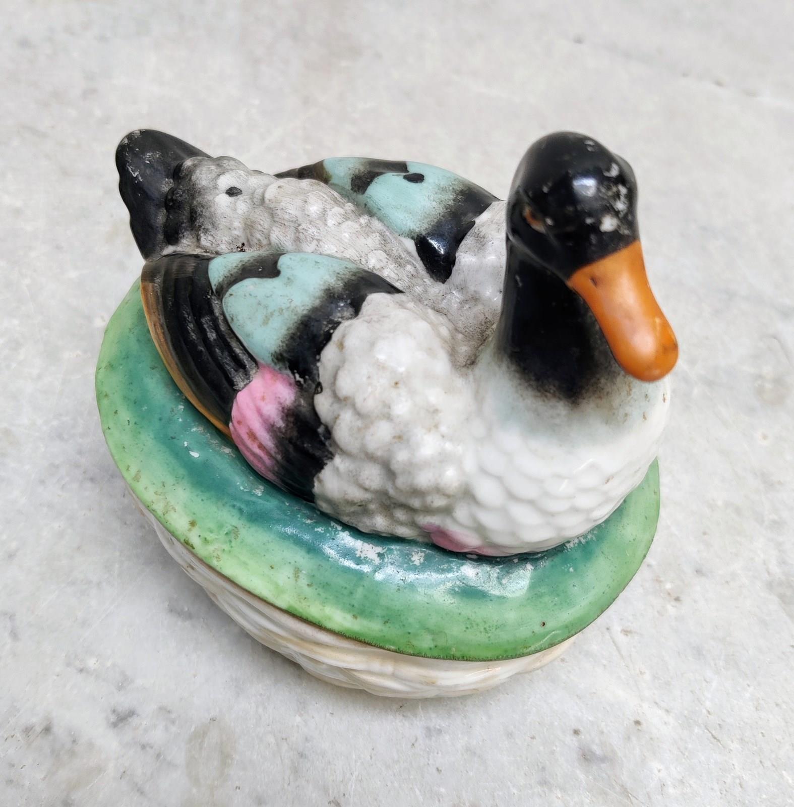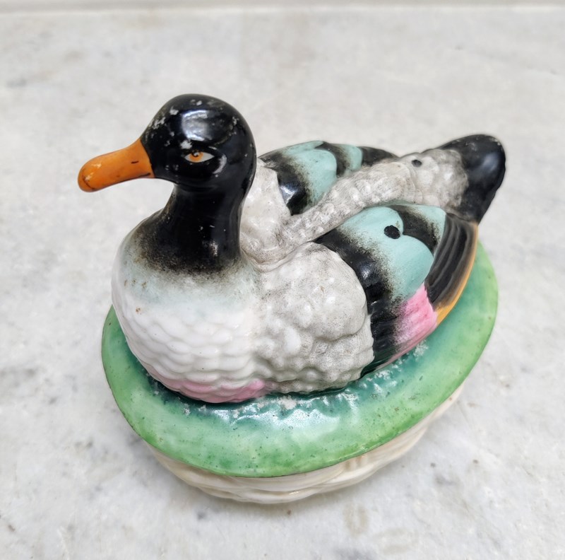 Pretty little porcelain Duck on a woven basket as a nest, hatching her eggs