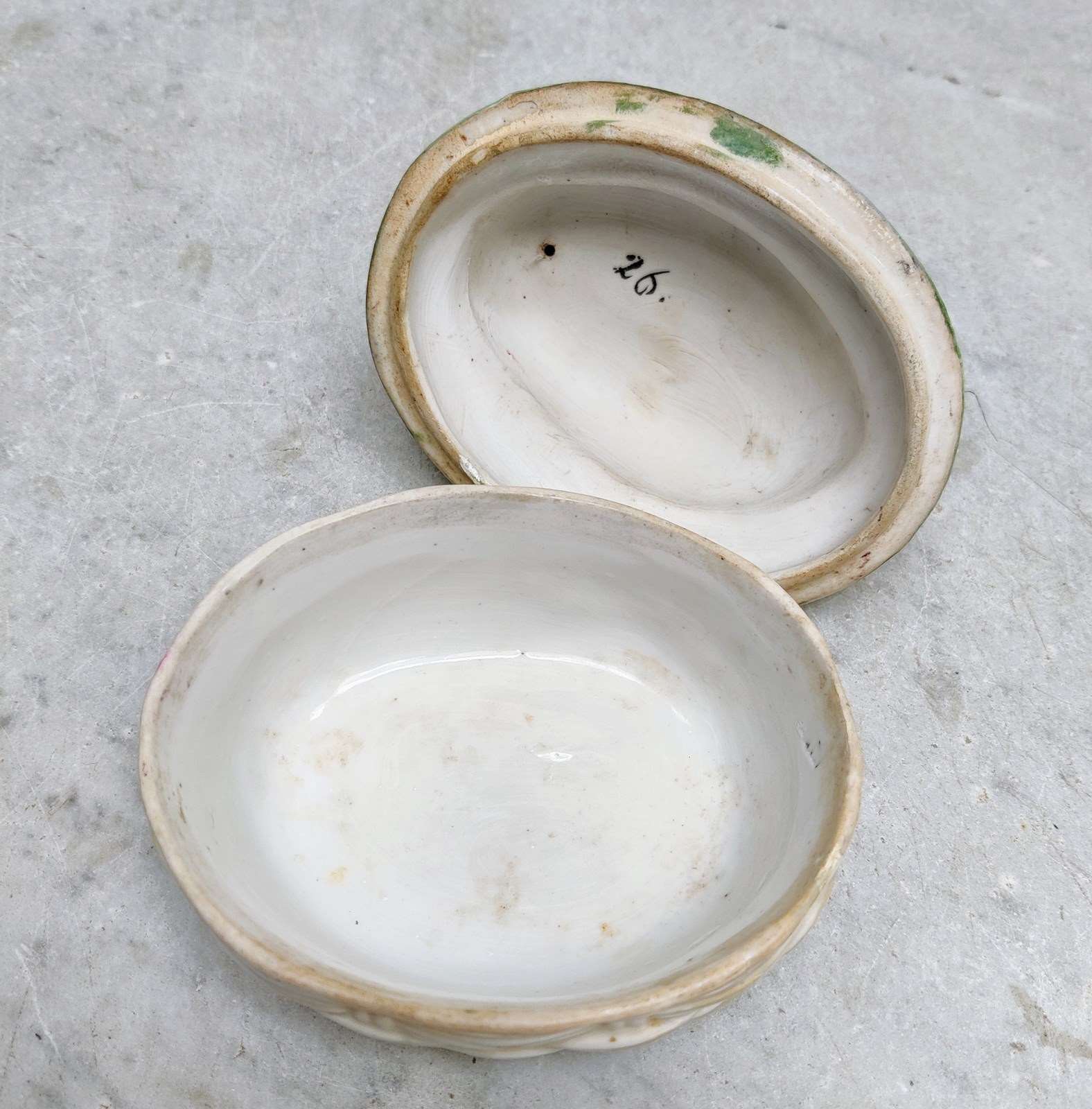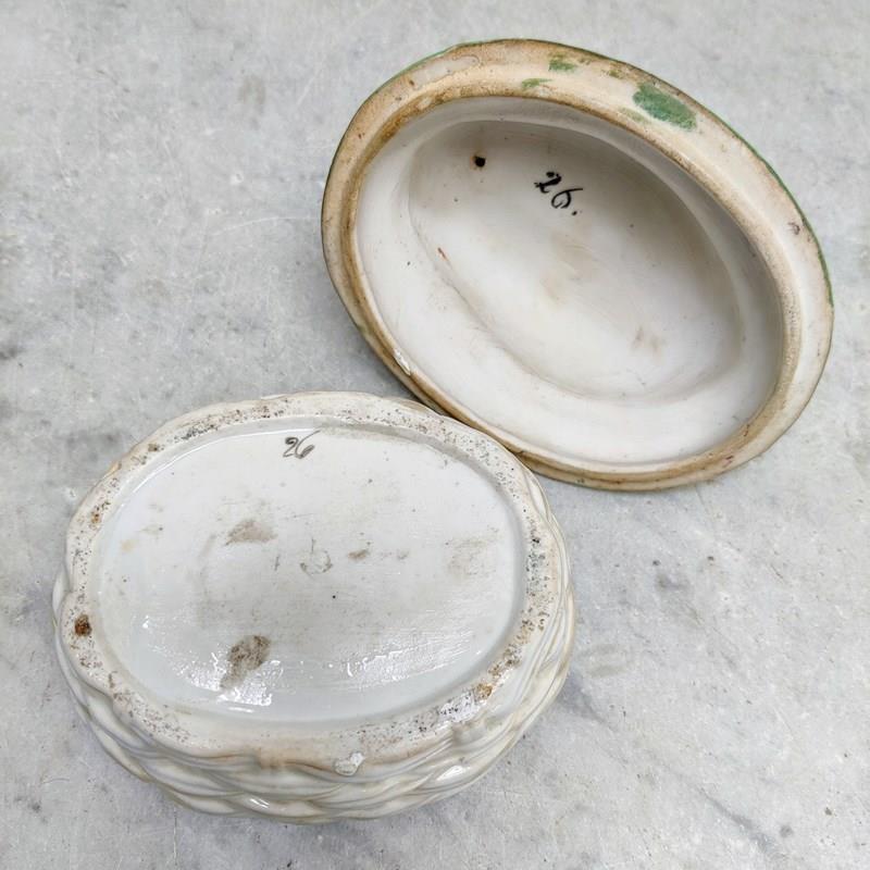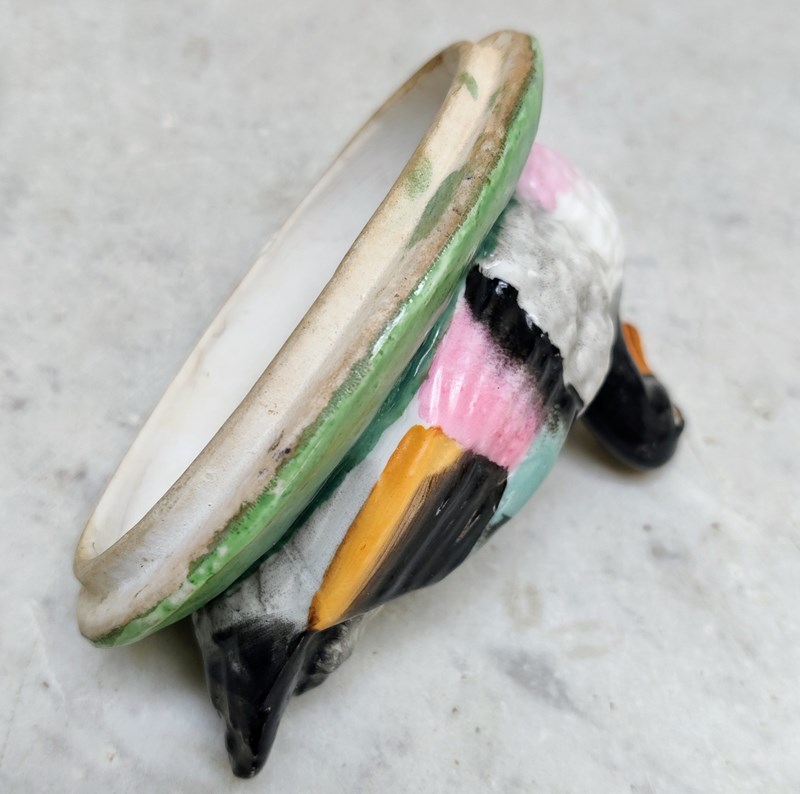 Finely painted body in grey, pink, black and touches of yellow with a glazed basket