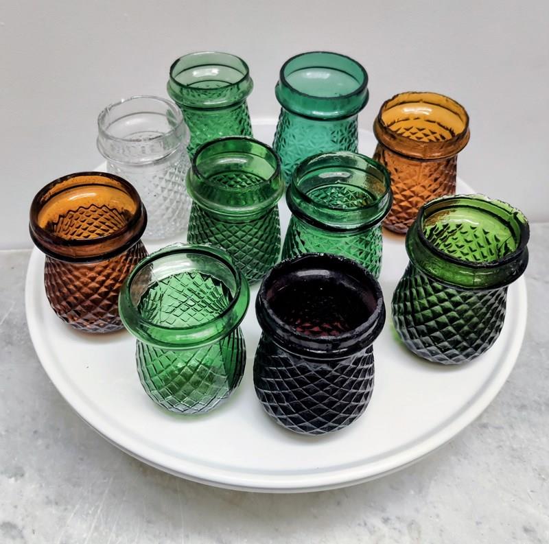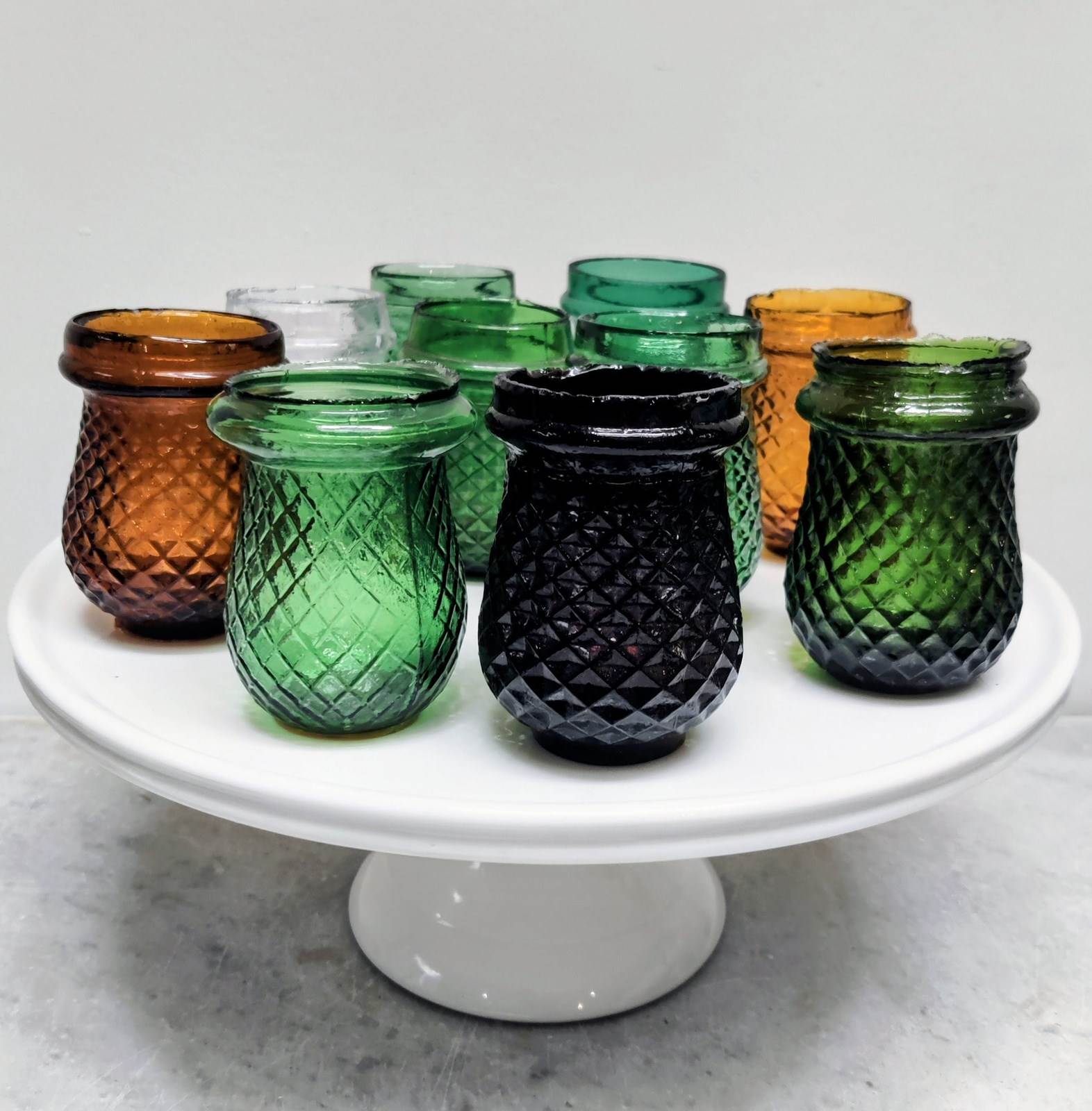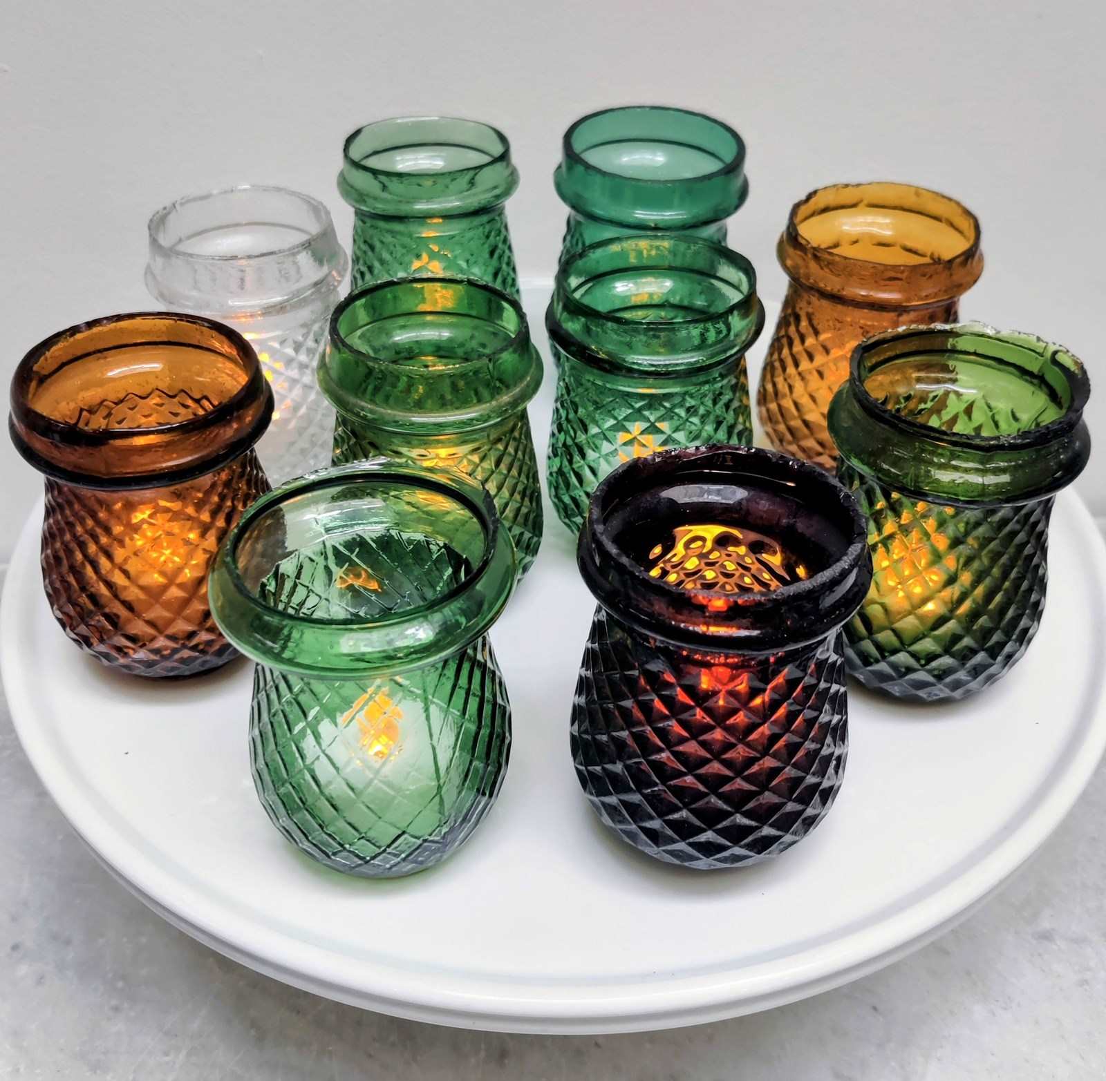 A lovely set of 10 Victorian pressed glass tea light holders, in different shades of green, amber and one clear one