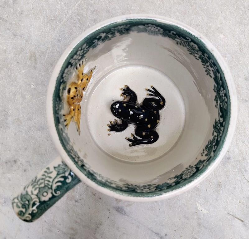 Inside the vessel, life like two dimensional frogs or toads are positioned at the bottom, seemingly attempting to escape! They slowly emerge at the bottom of the vessel as it is drained and cause great surprise for the unsuspecting drinker and hilarity for the audience!