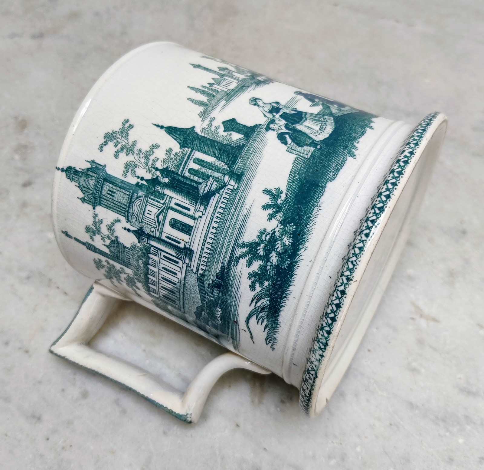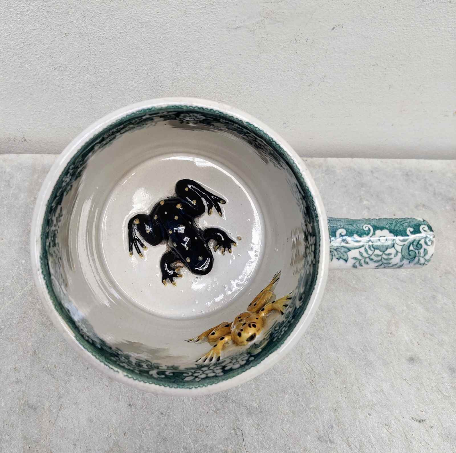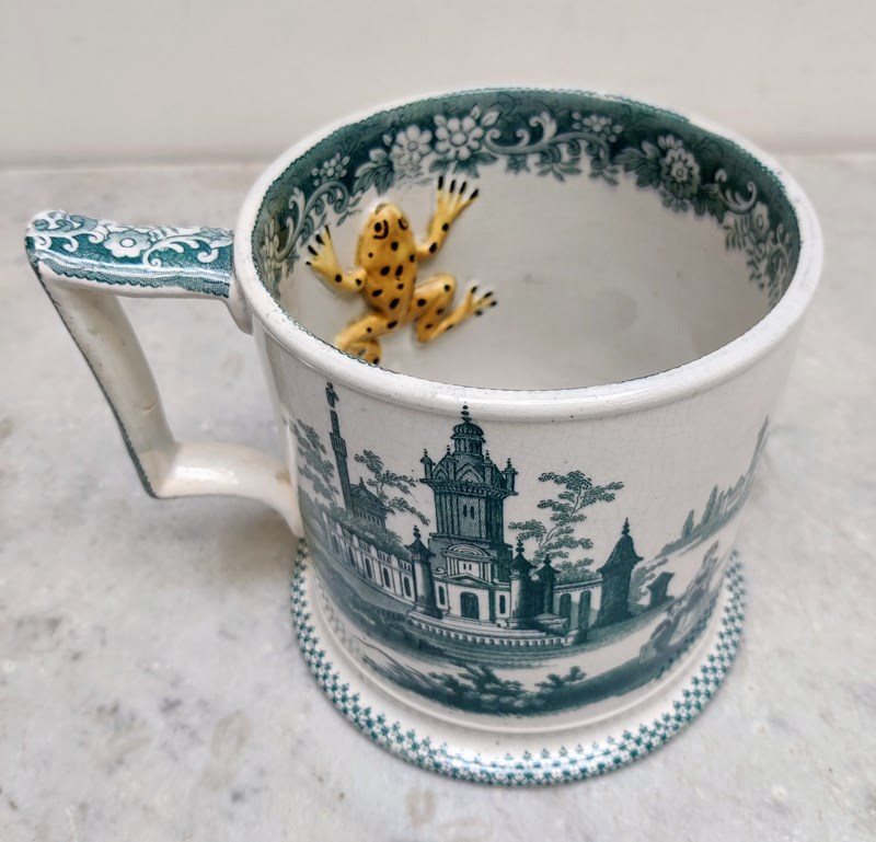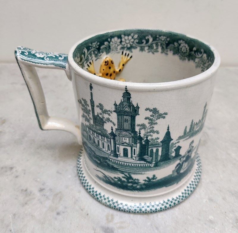 Very large C19th Staffordshire dark green transfer printed quart mug with a secret pair of frogs in black and yellow glazed pottery