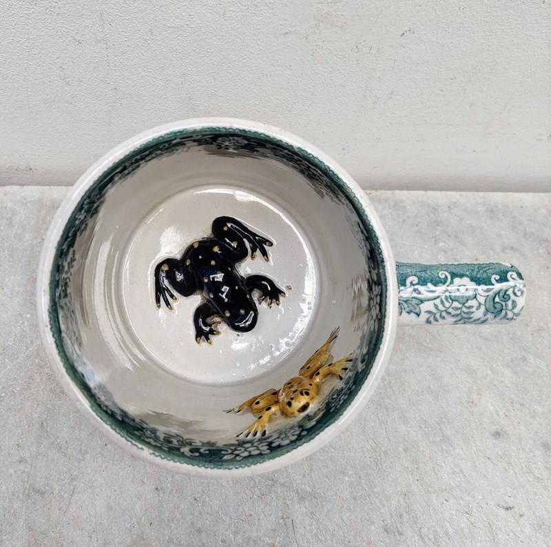 Frog mugs, often found in 17th/18th century taverns, were used for drinking typically cloudy beer. These mugs were part of the tradition of drinking games such as fuddling cups and puzzle jugs.