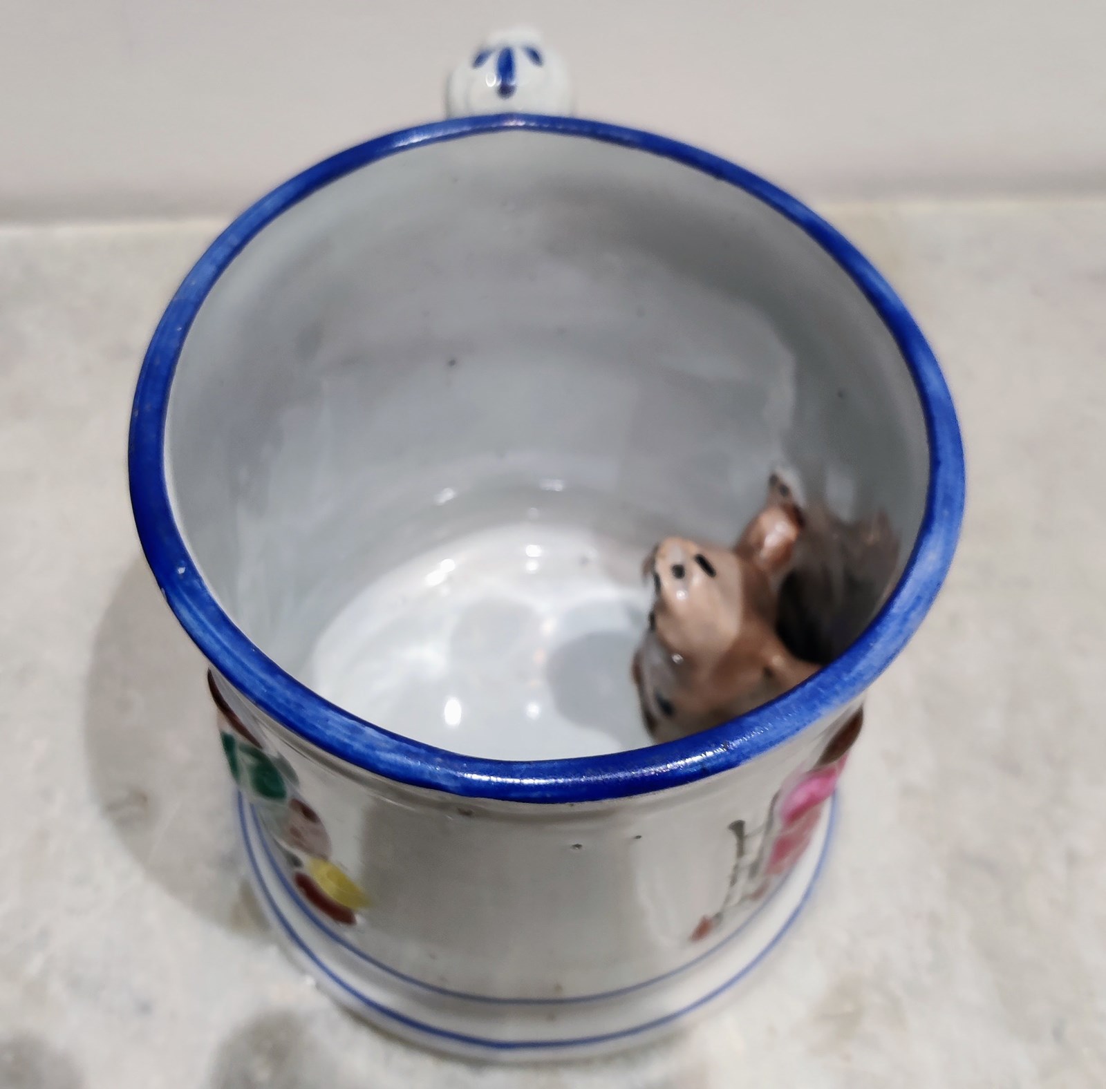 These were often found in 17th/18th century taverns, were used for drinking typically cloudy beer. These mugs were part of the tradition of drinking games such as fuddling cups and puzzle jugs.