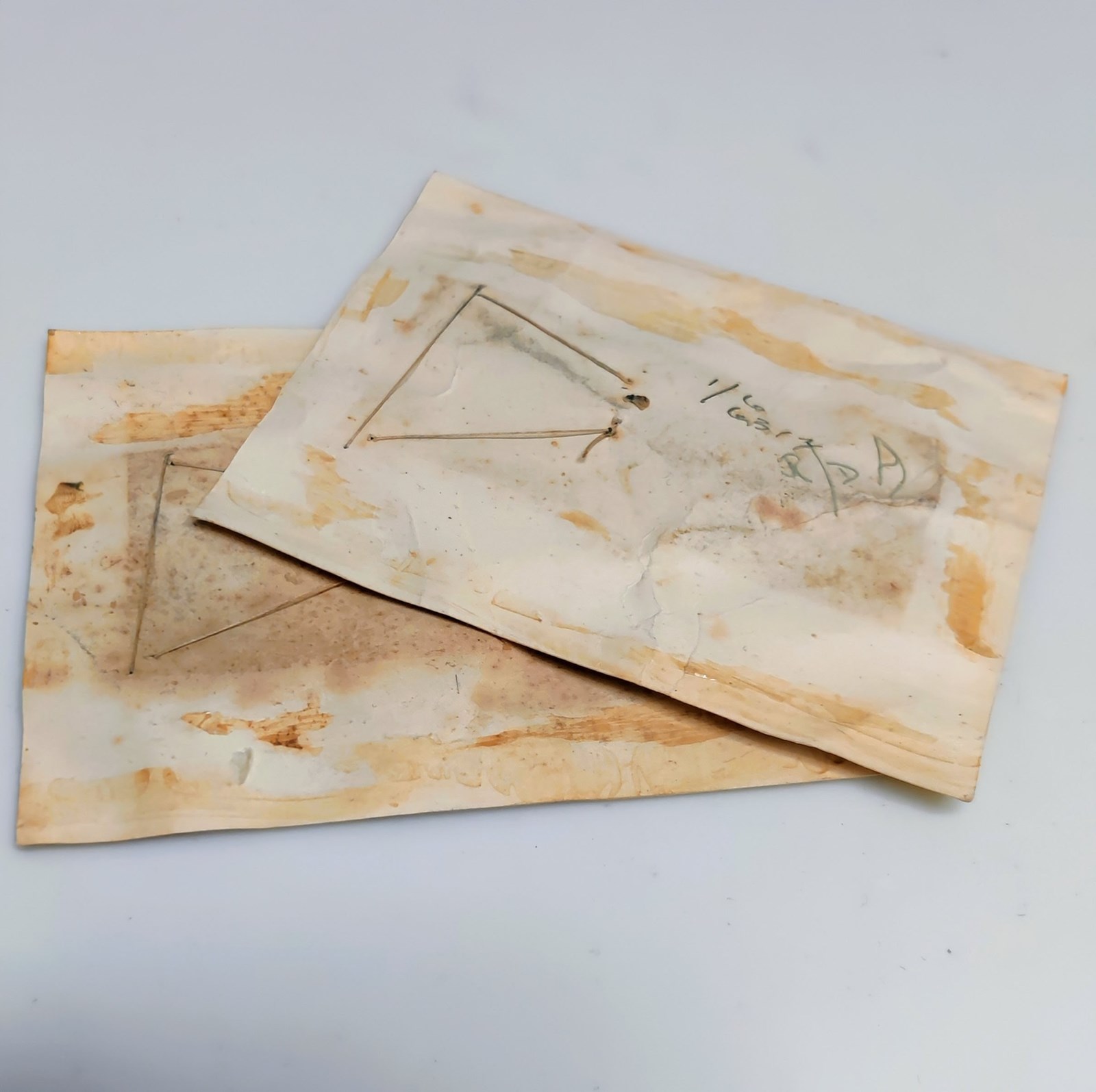 The charms in excellent, unused condition but staining on both cards