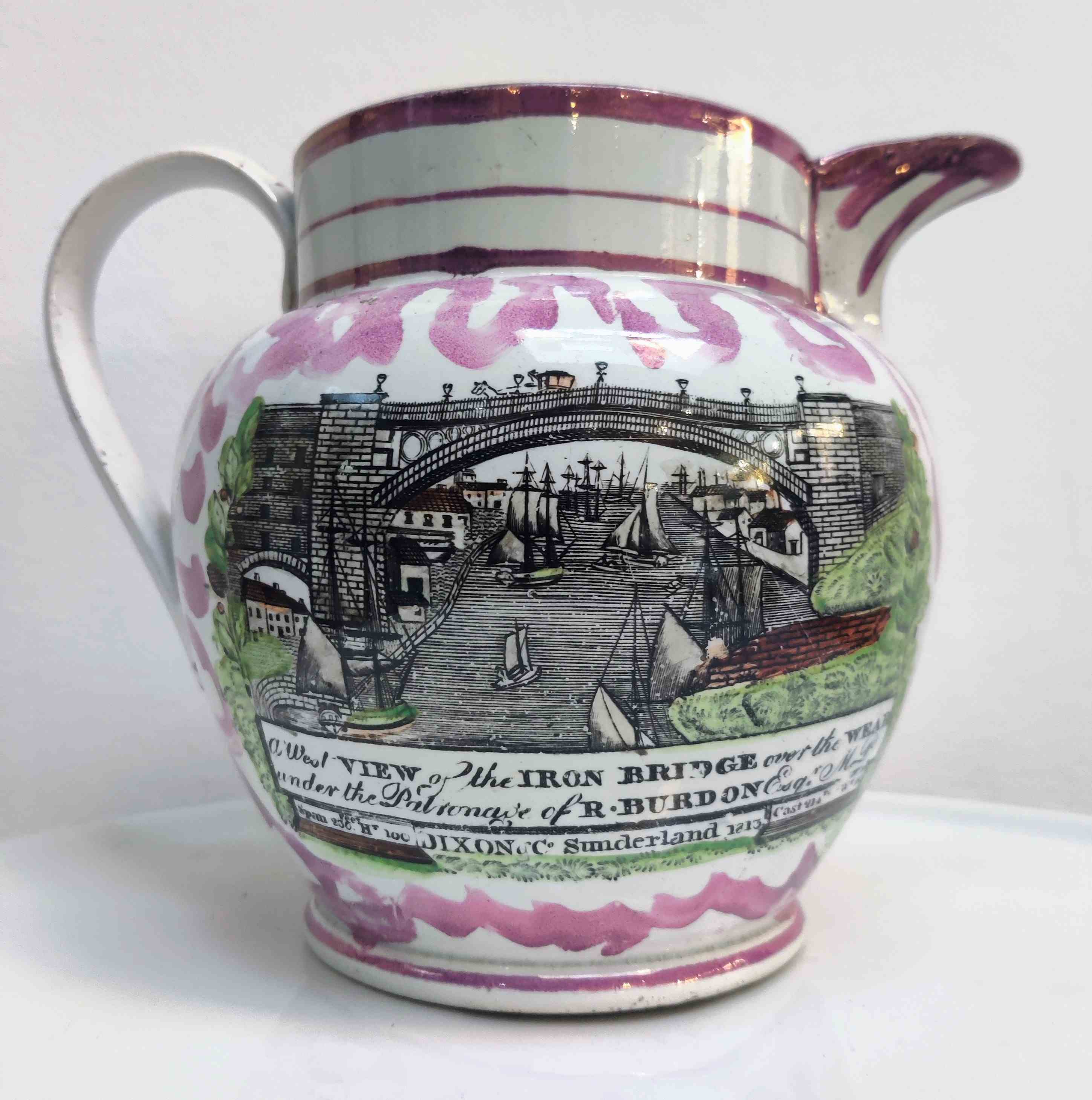 Transfer printed and coloured, with pink lustre painted decoration over a creamware body
