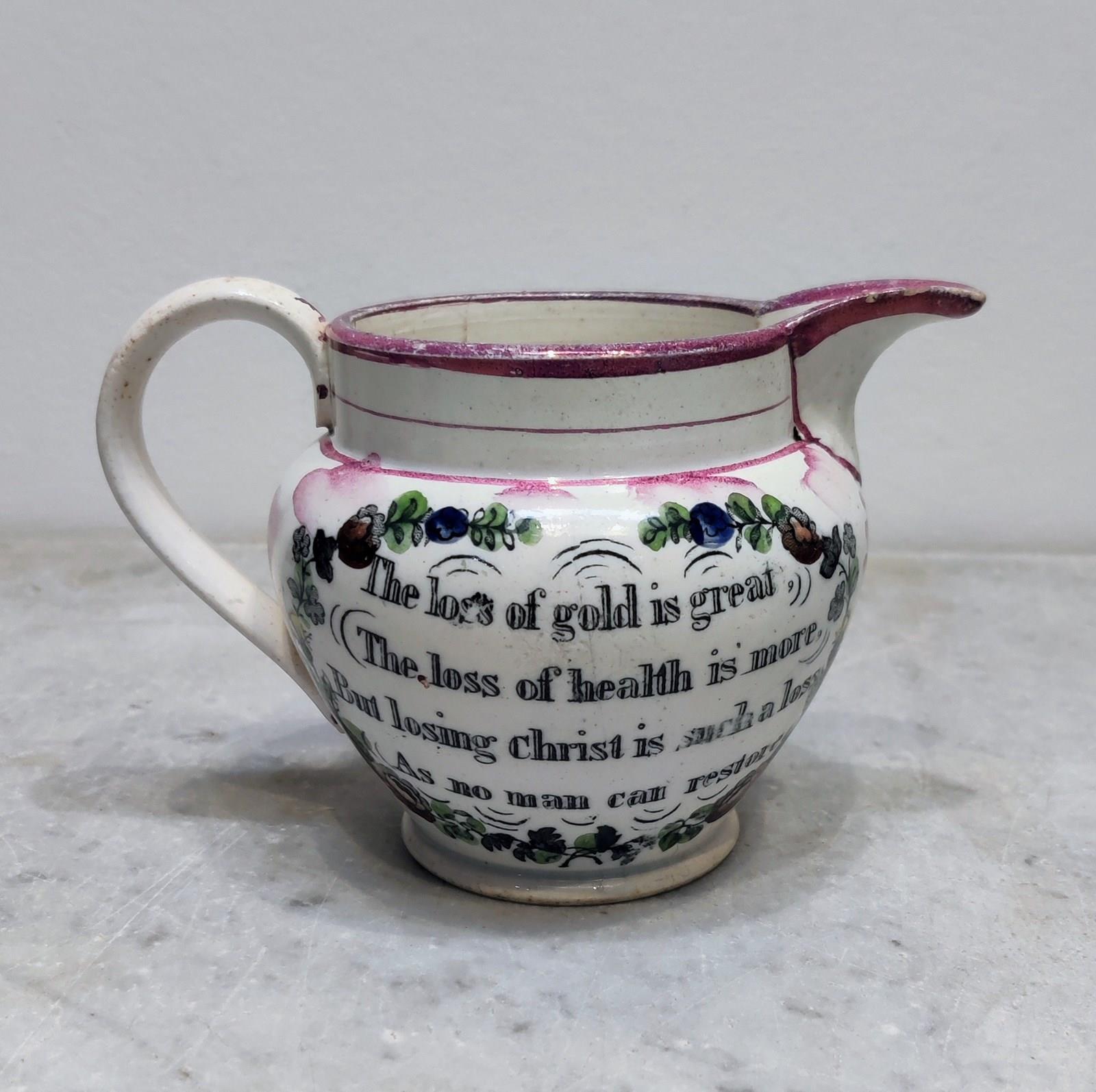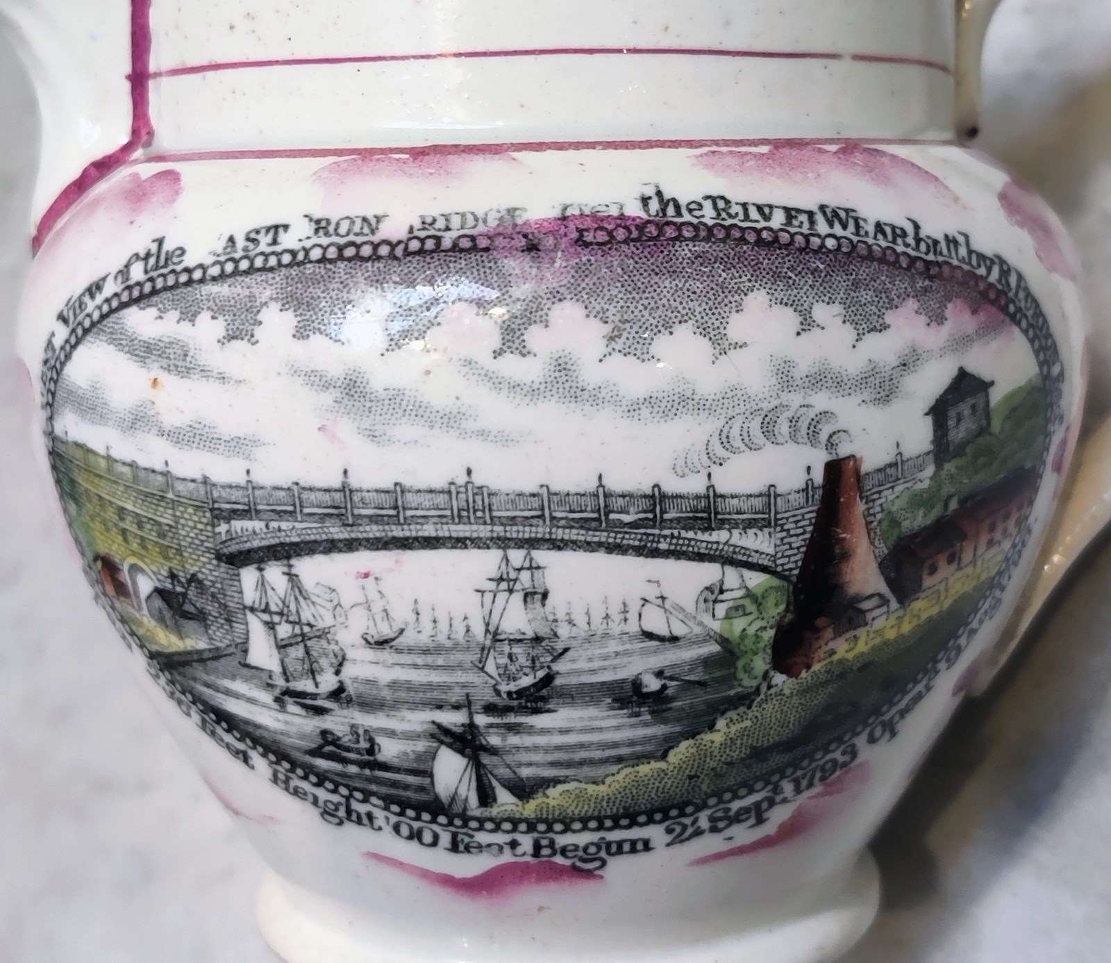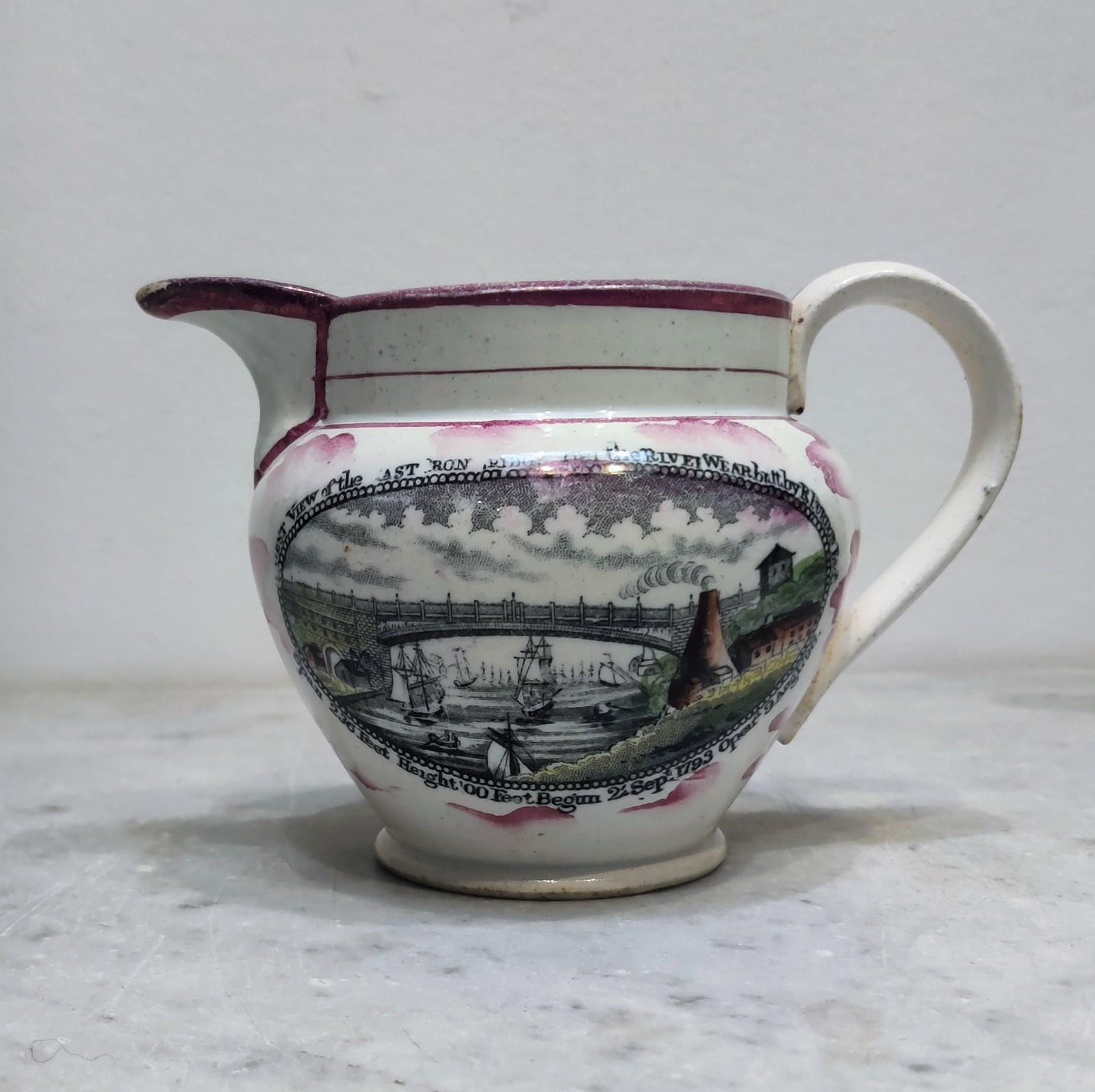 Transfer printed and coloured, with pink lustre painted decoration over a creamware body