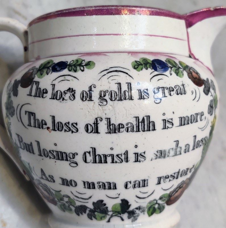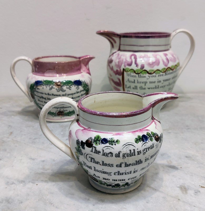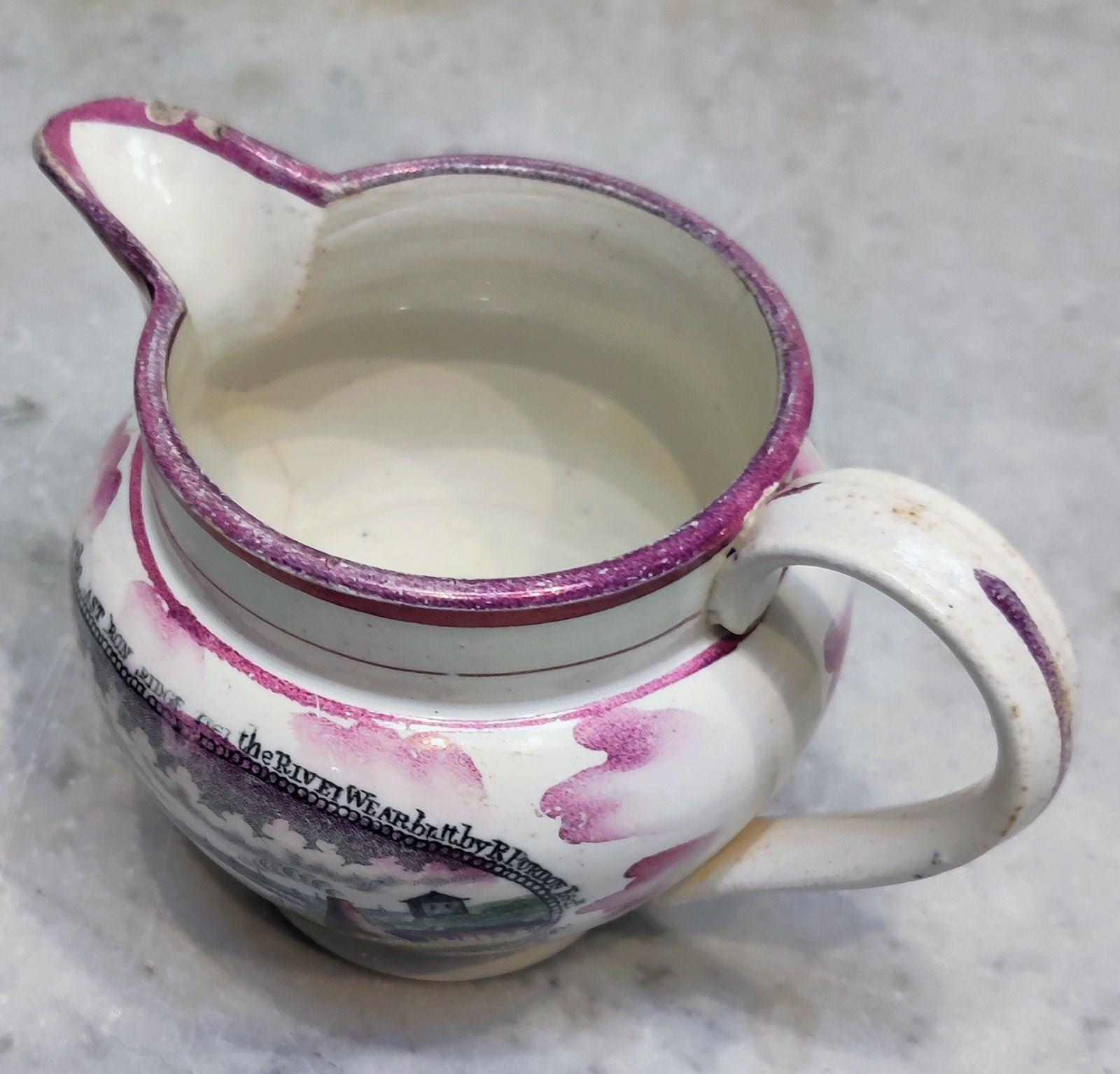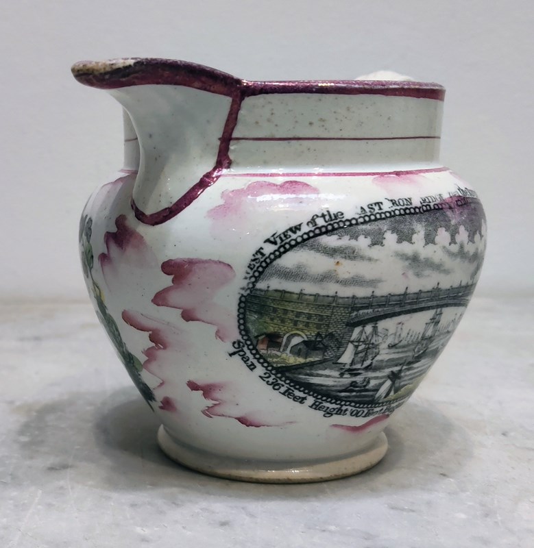 Transfer printed and coloured, with pink lustre painted decoration over a creamware body