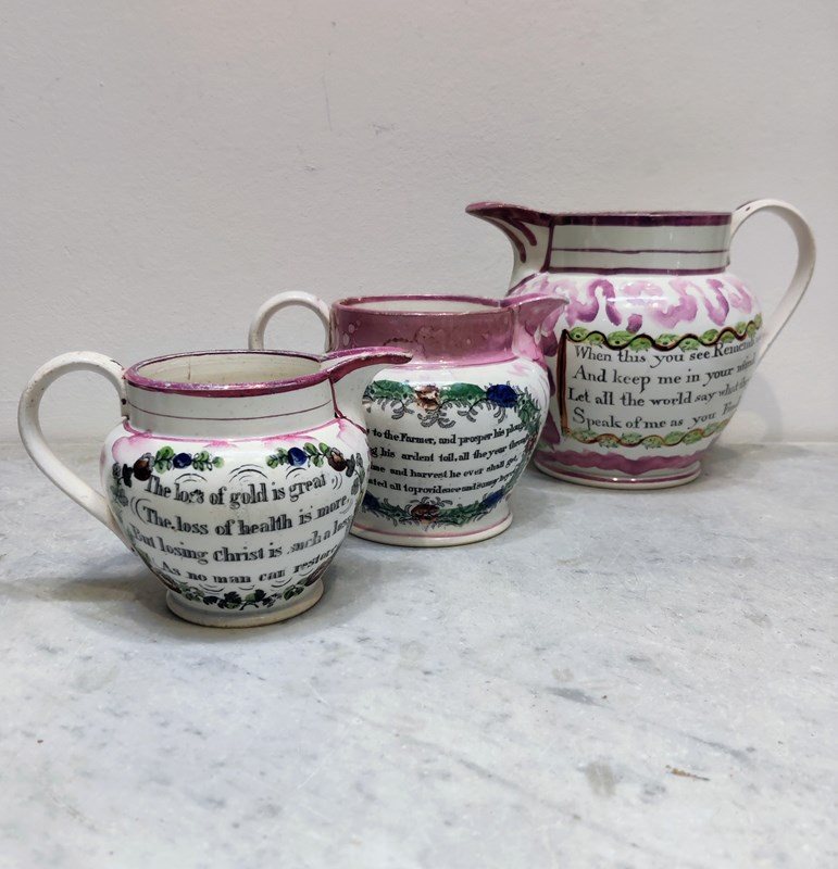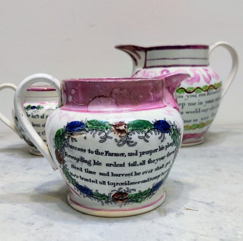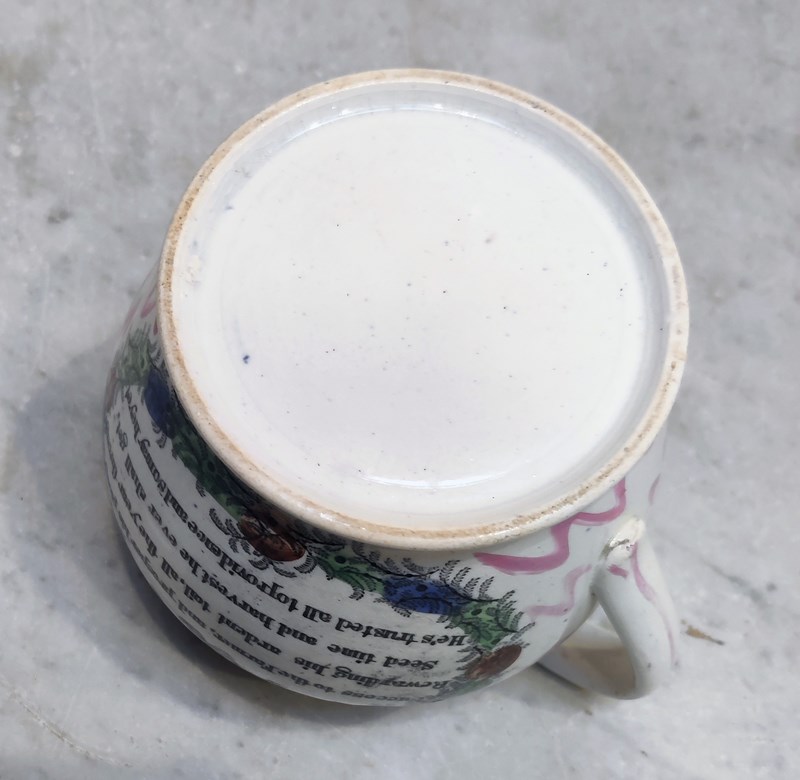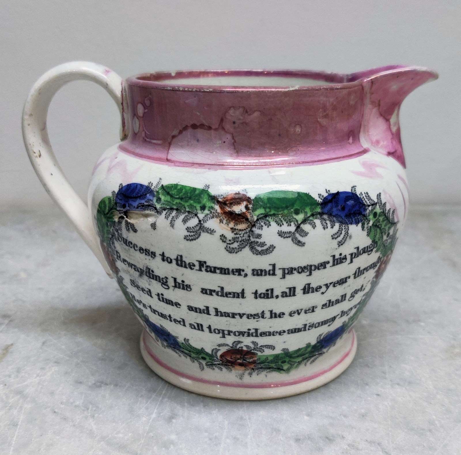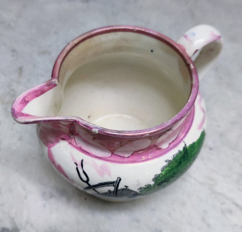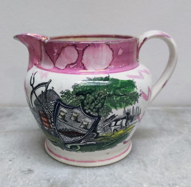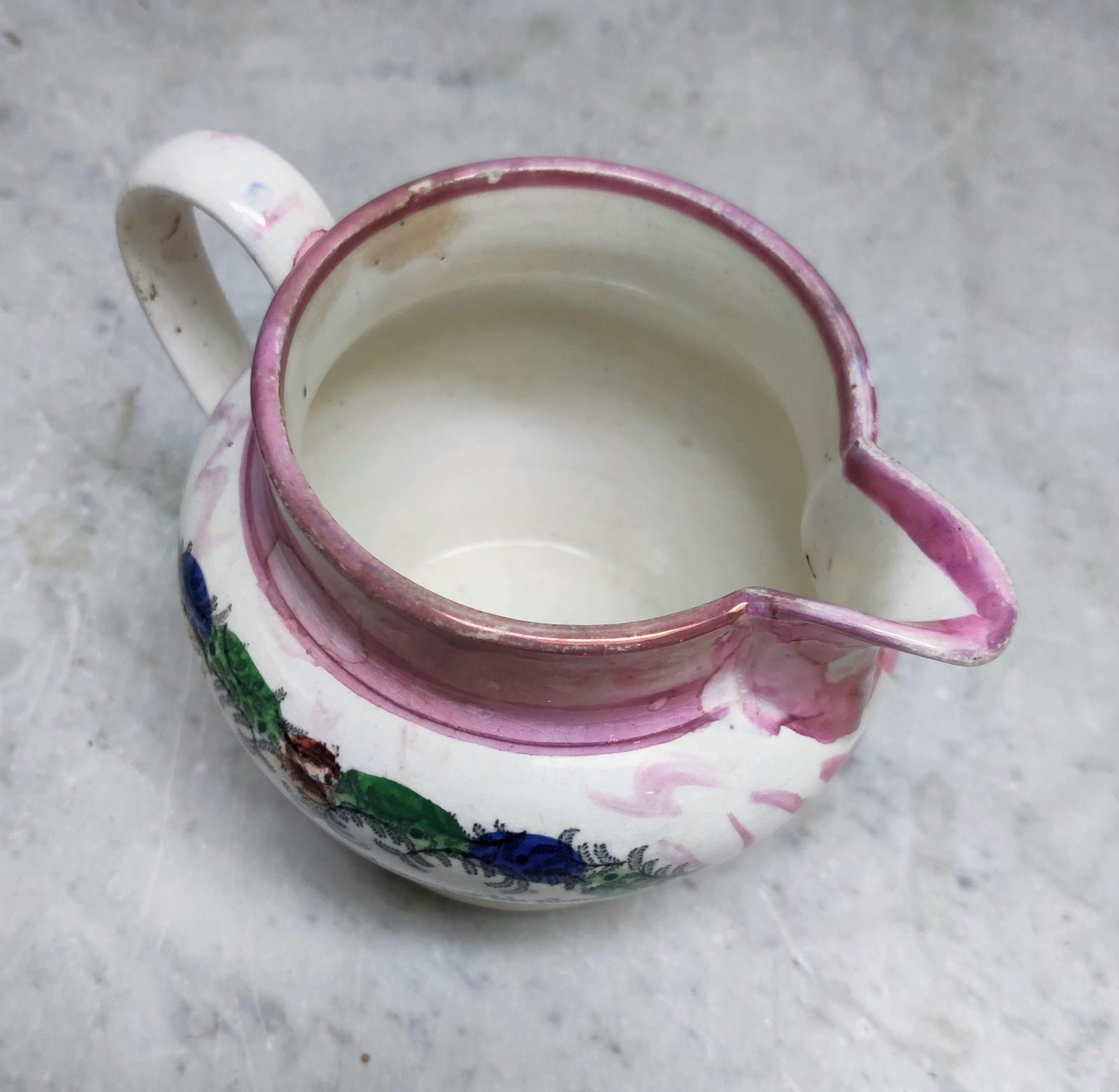 Transfer printed and coloured, with a deep band of pink lustre around the top and painted decoration over a creamware body