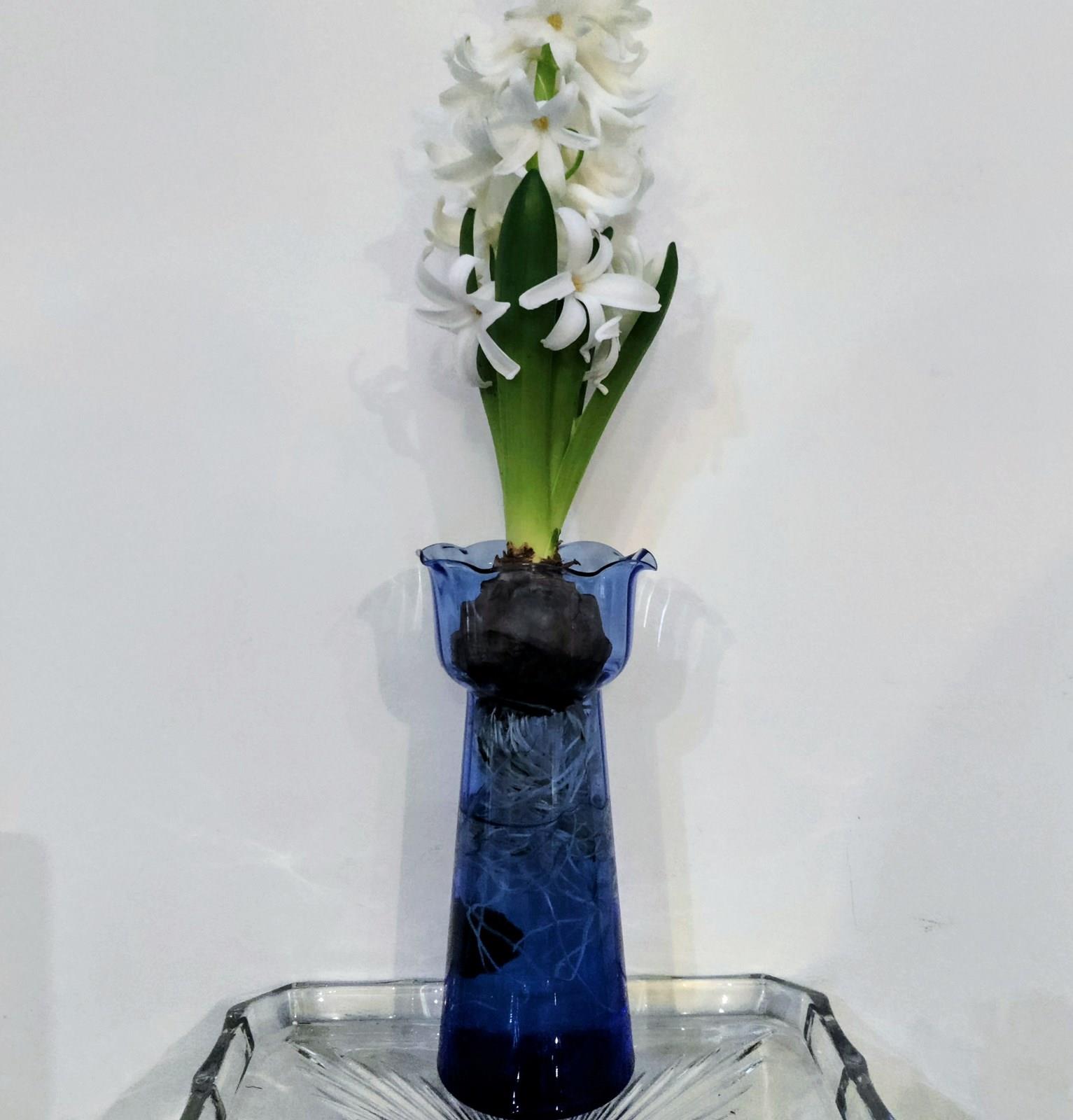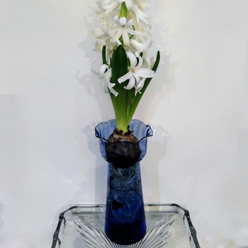 A tall blue bulb vase with a pretty fluted top