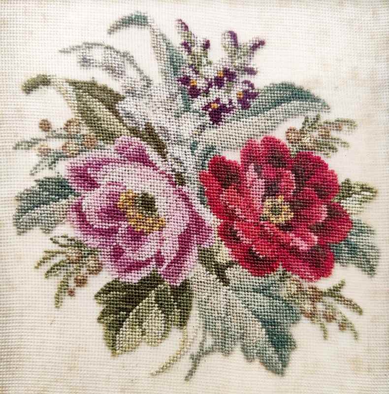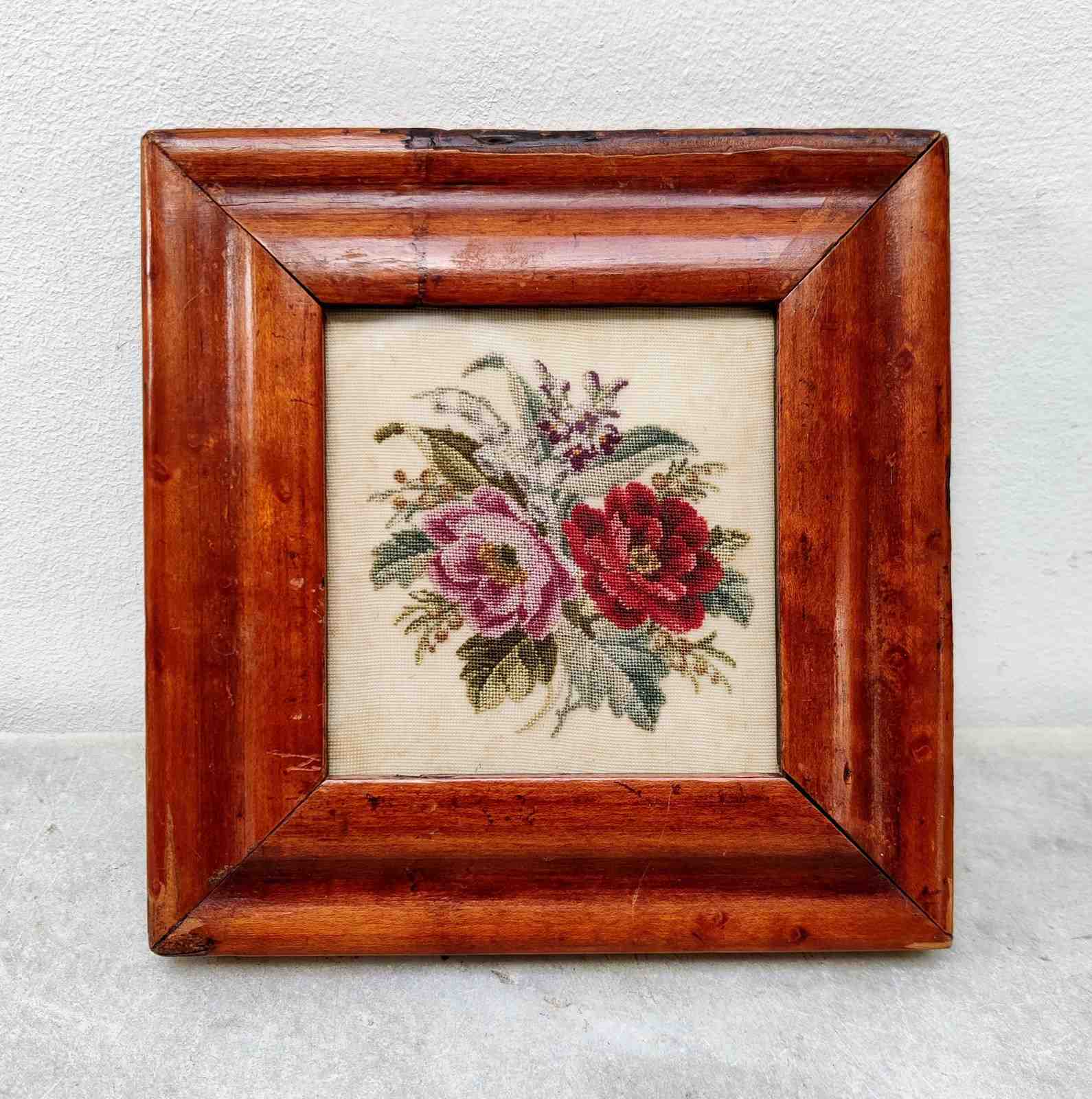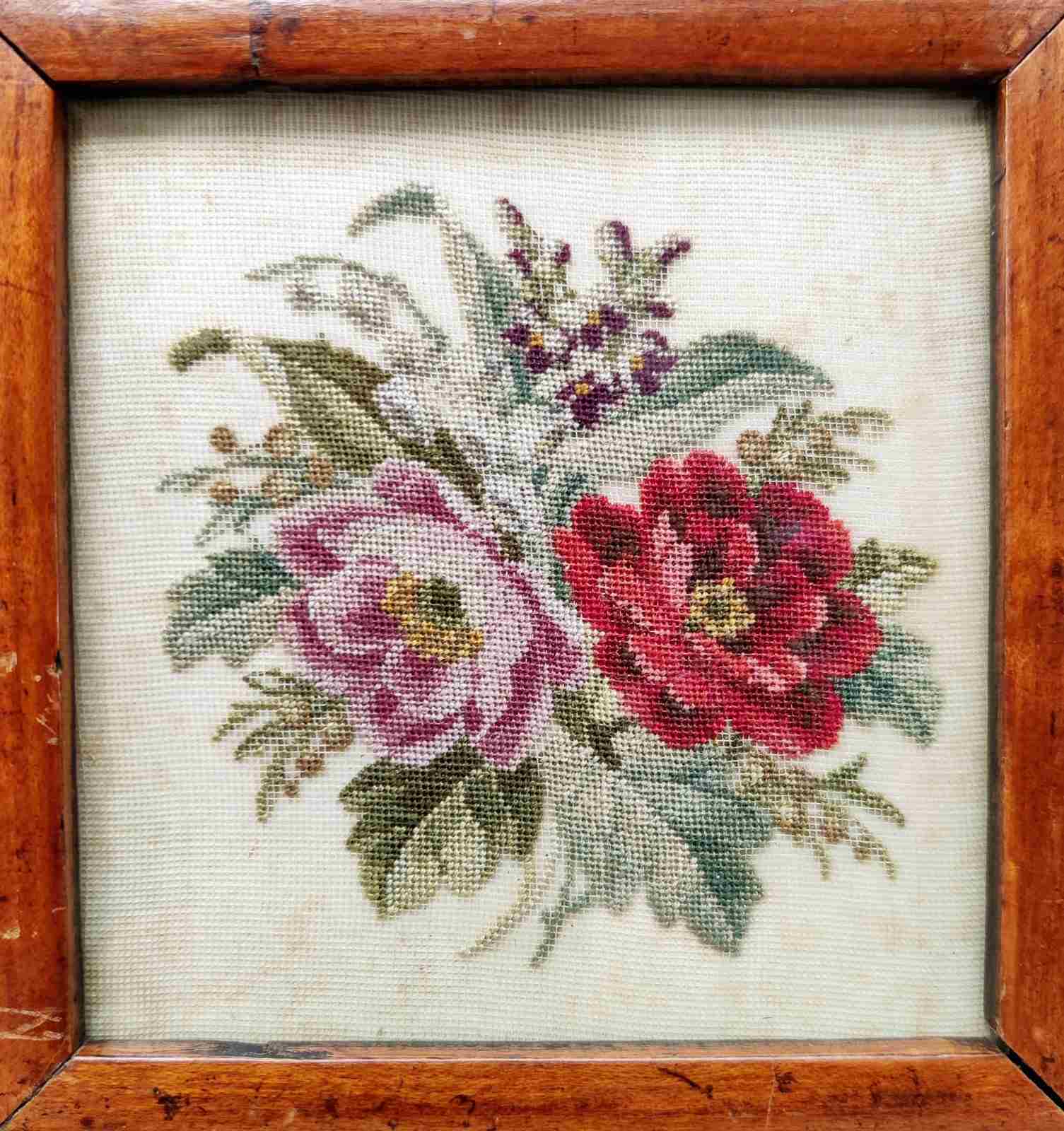 Very pretty floral needlepoint including Roses, Pansies and Lily of the Valley in a Bird's Eye Maple frame