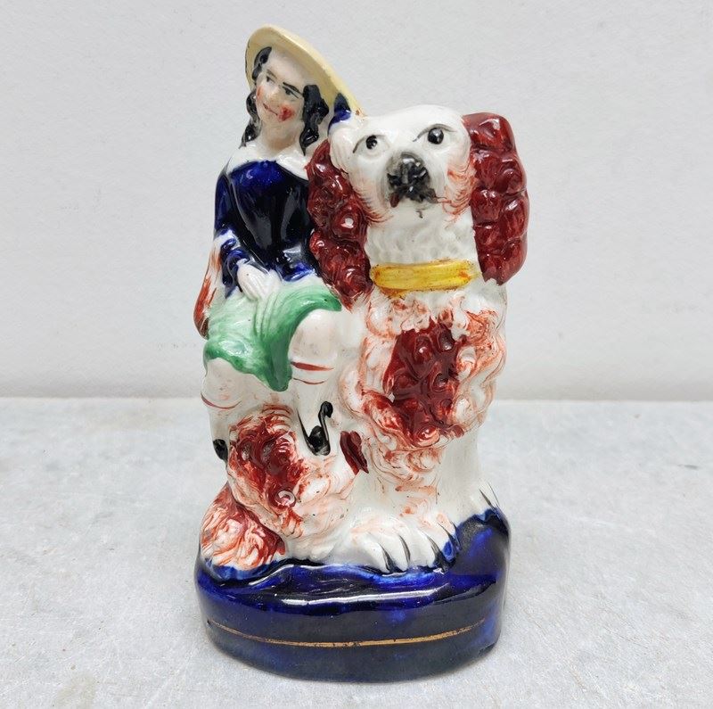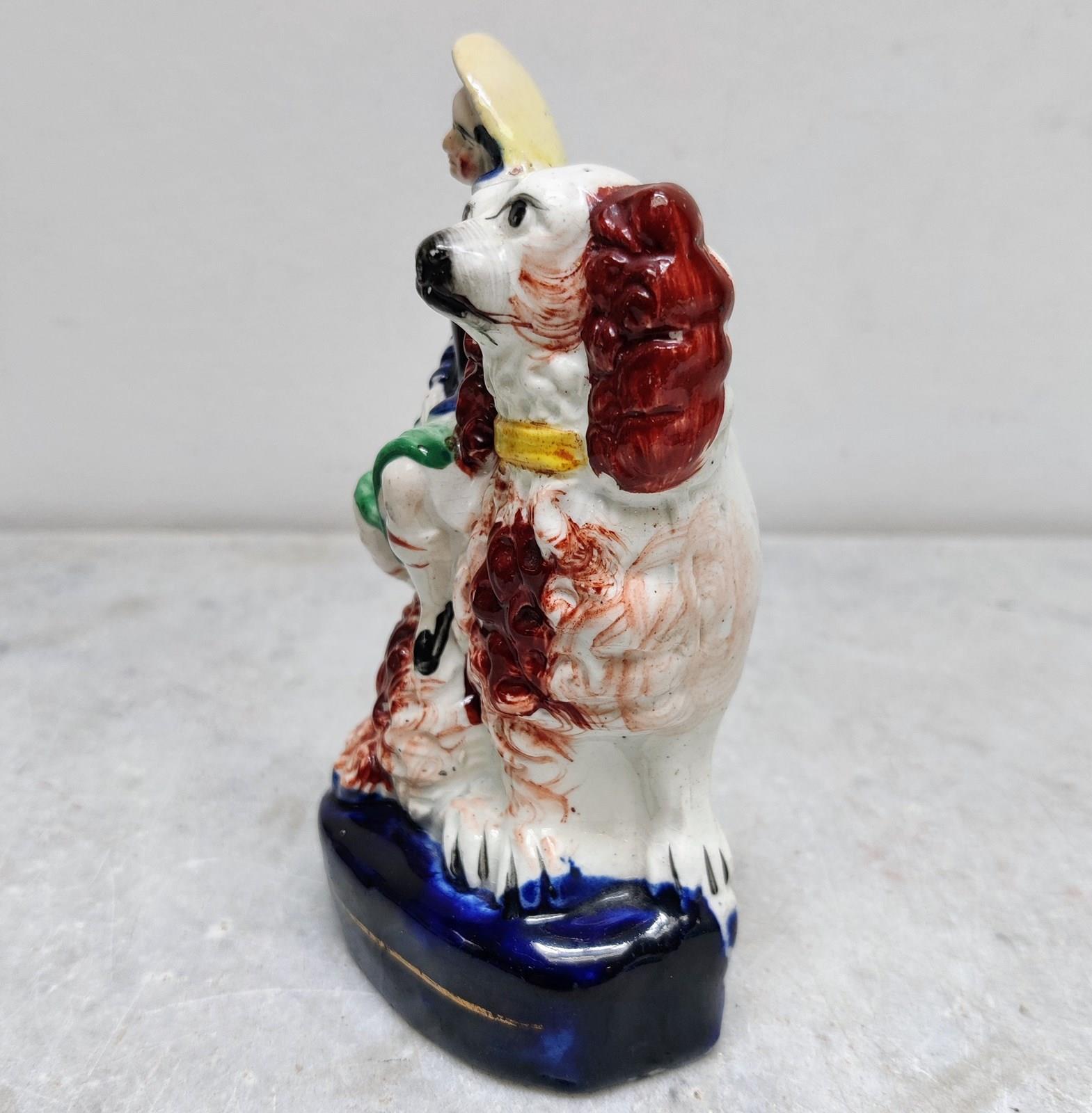 A little hand painted mid 19th Century Staffordshire model of a little girl with her ginger King Charles spaniel