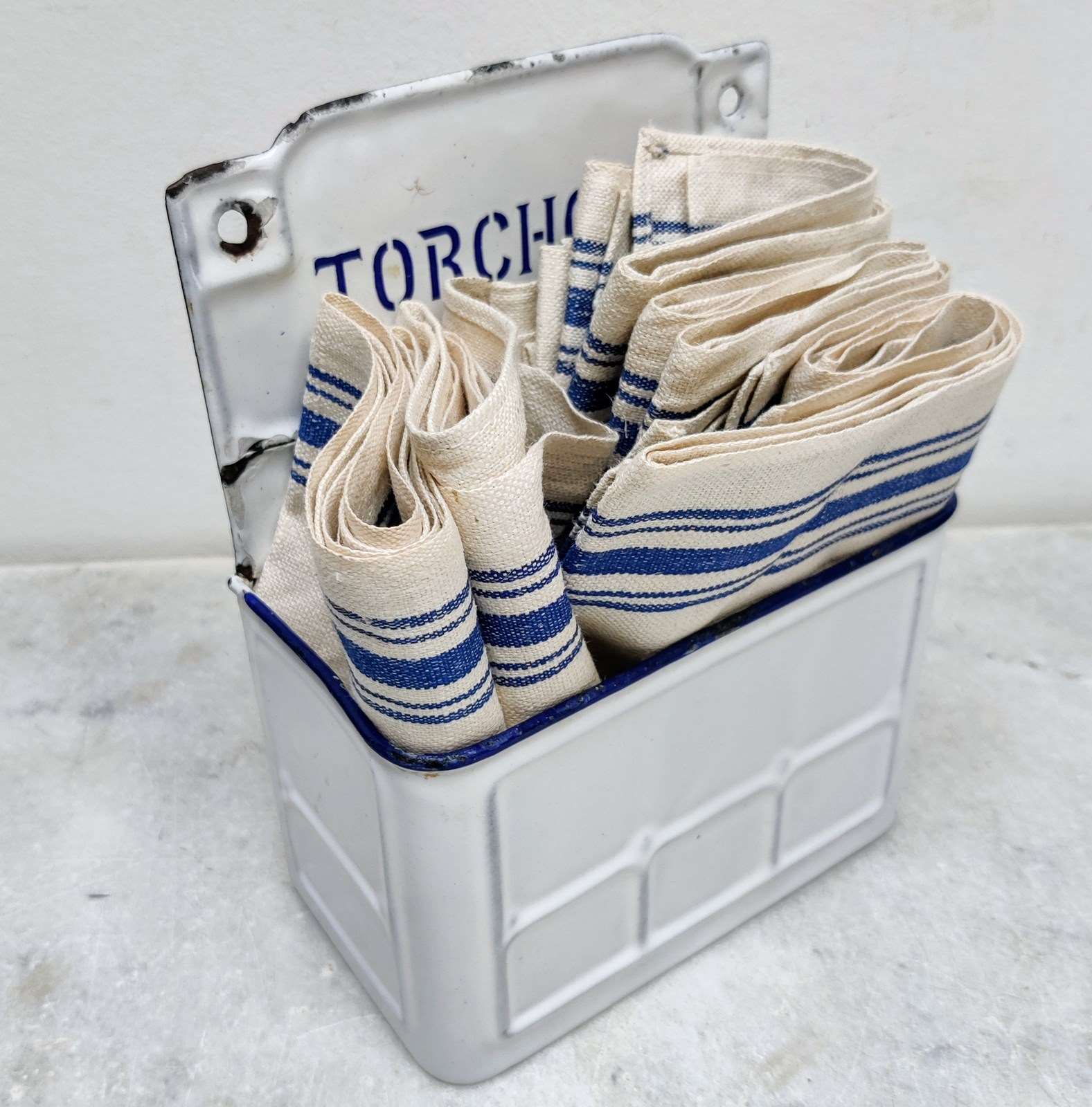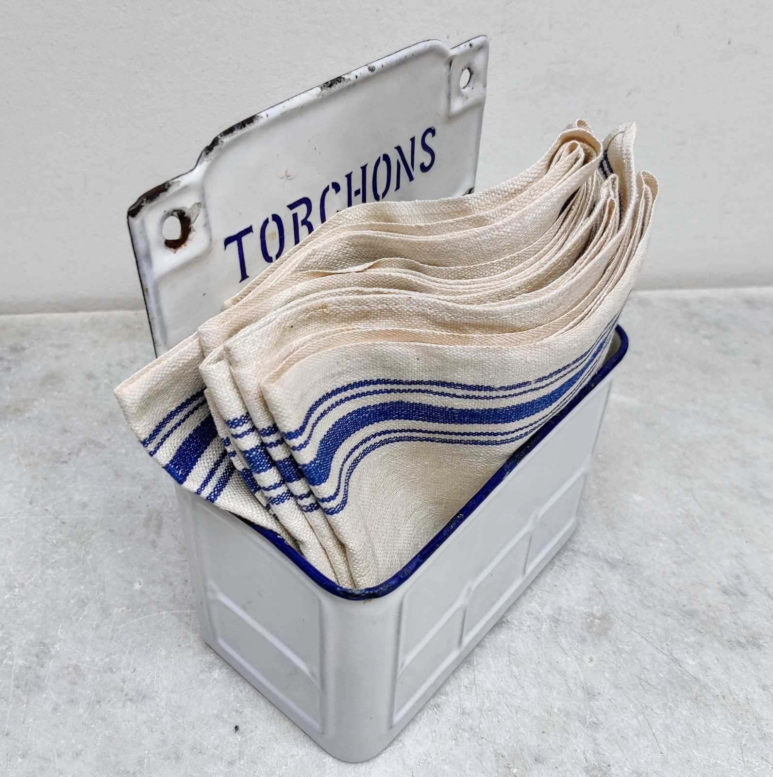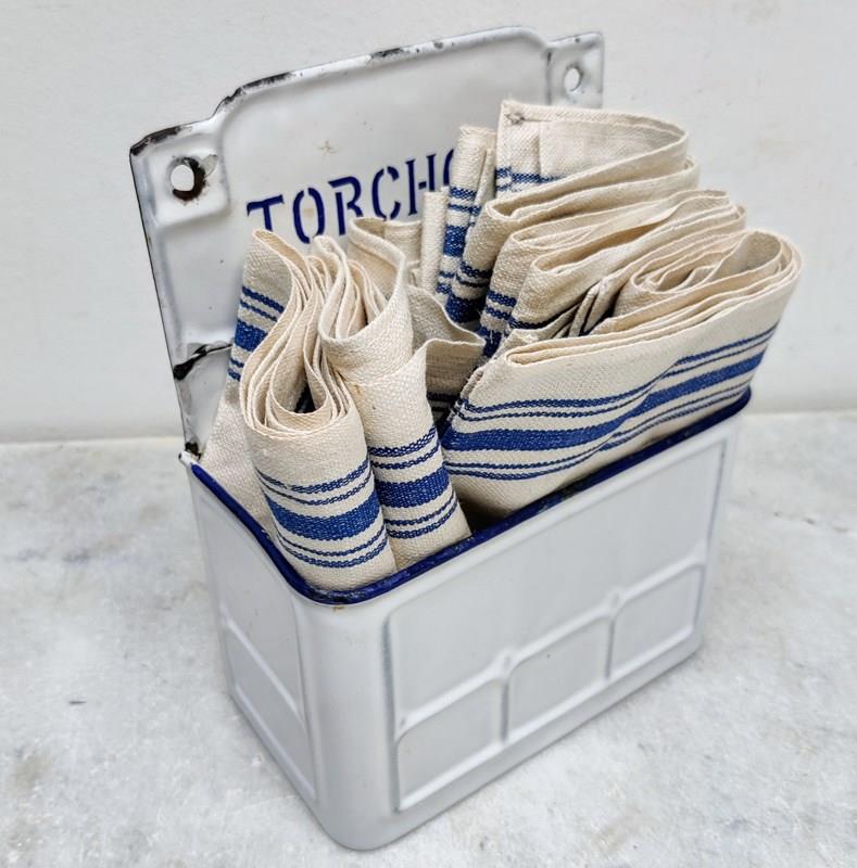 Unusual but useful, French enamel 'Torchons'- napkin holder