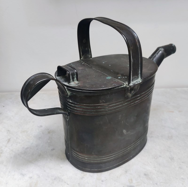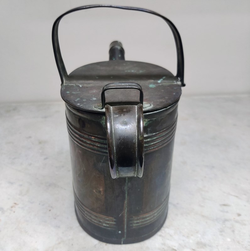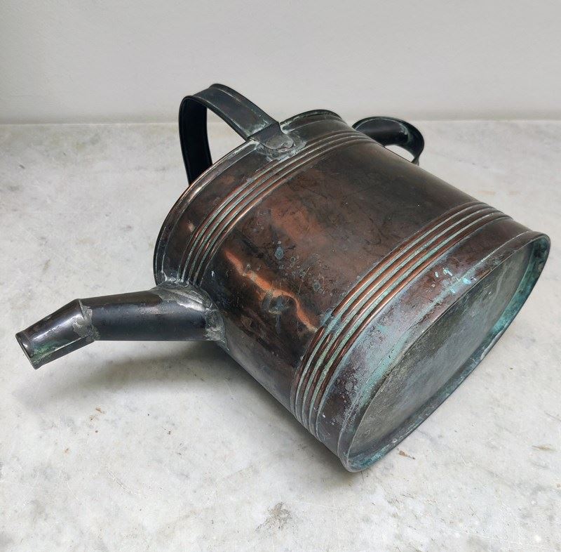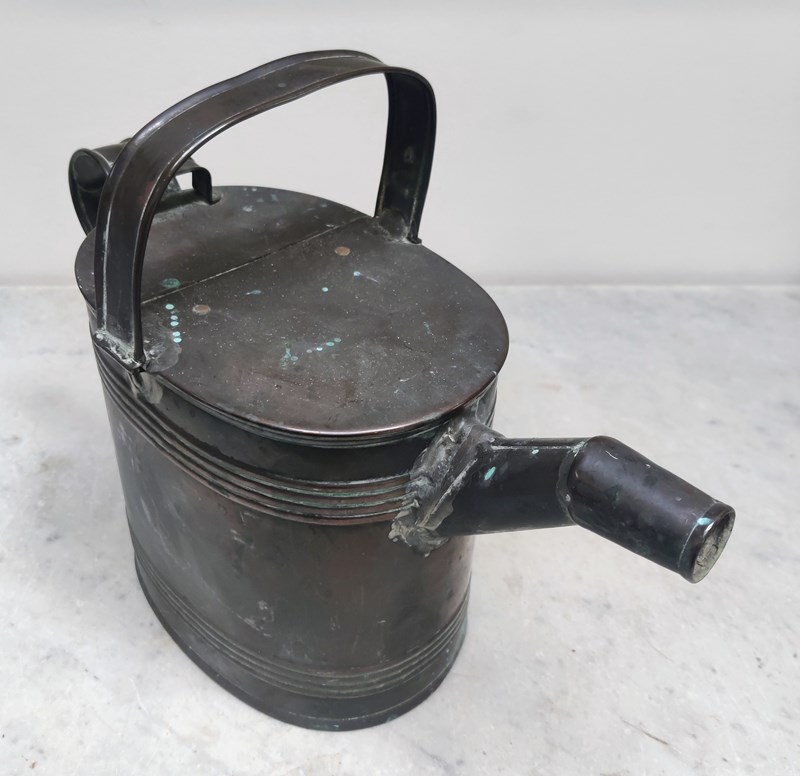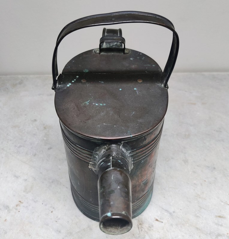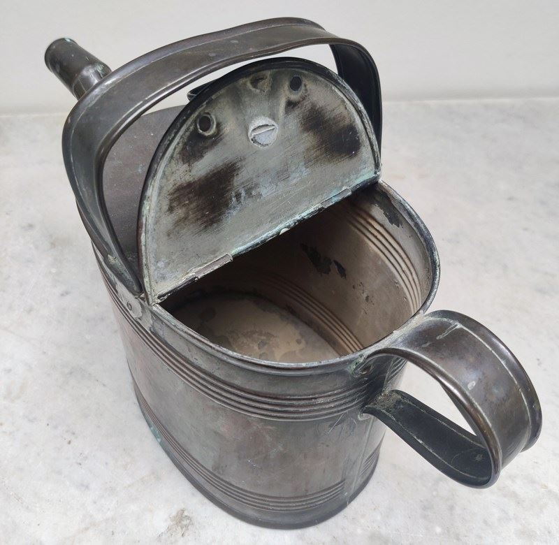 In good condition, watertight, with some lead welded restoration on the bent handle and spout, images 3&6
