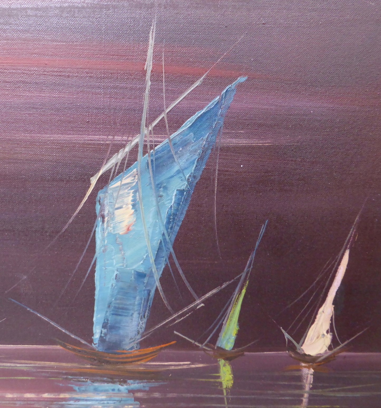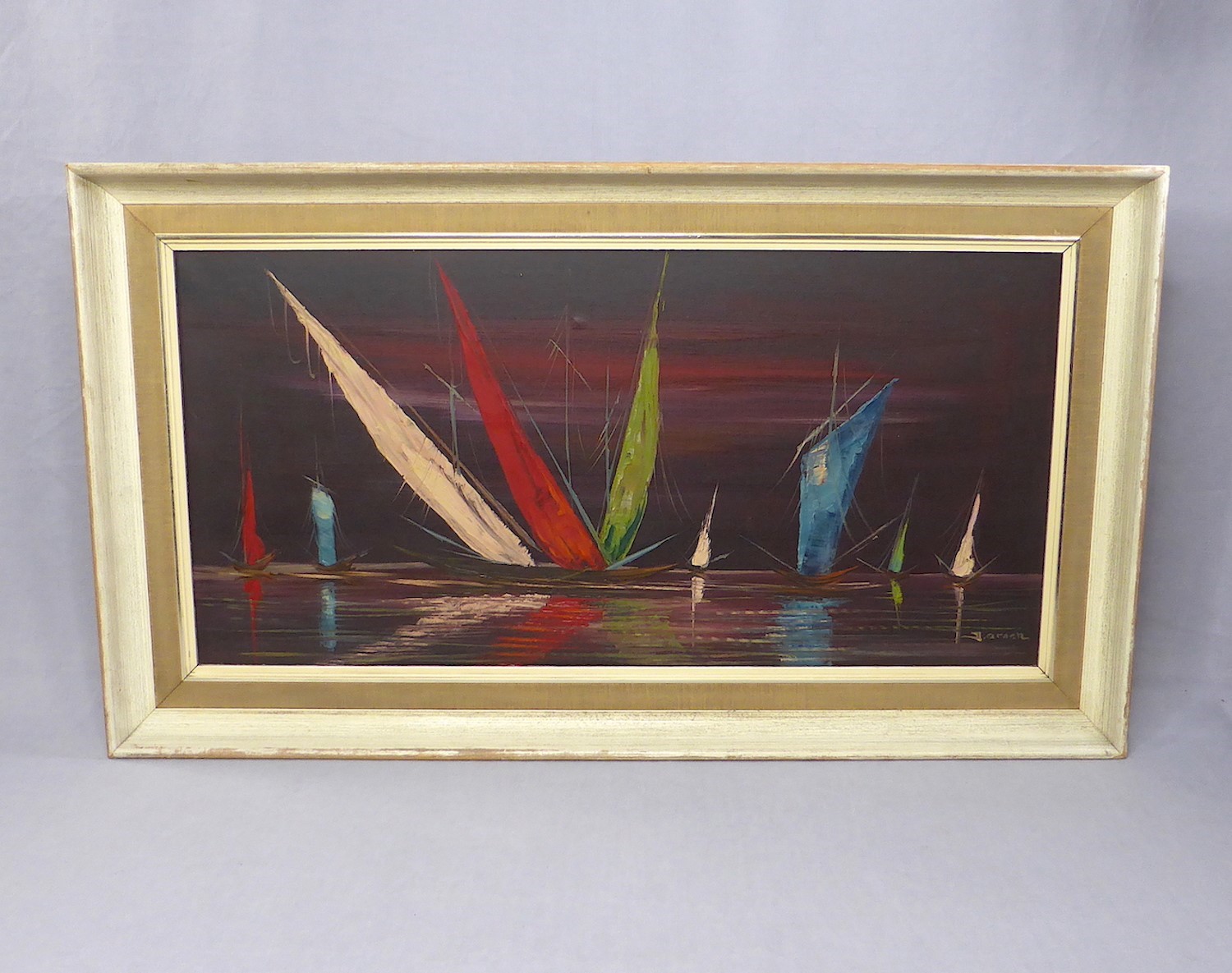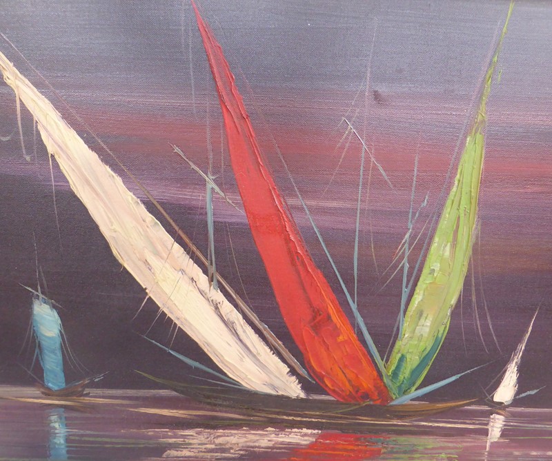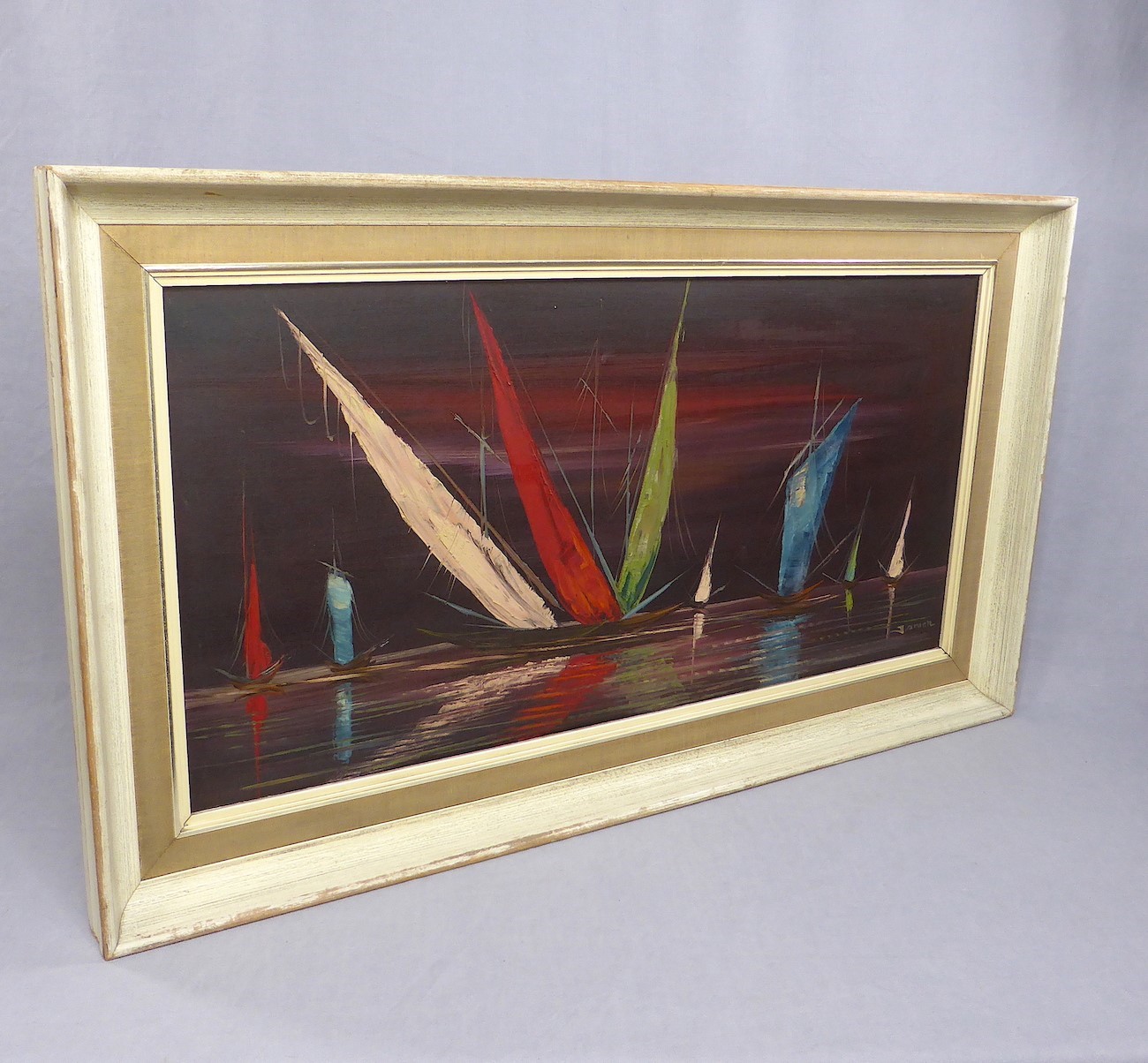 A very attractive mid 20th century signed oil on canvas painting, presenting an abstract image of traditional Italian fishing boats with vividly coloured sails against a dark sky. It dates to about the 1950s and is mounted in a frame from the same period. There are a couple of minor areas of damage to the canvas with tape repairs to the back, but there is only minor evidence of damage to the actual painting. This fine decorative piece is ready to hang.