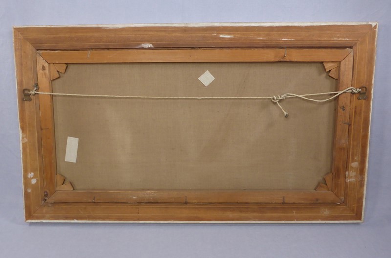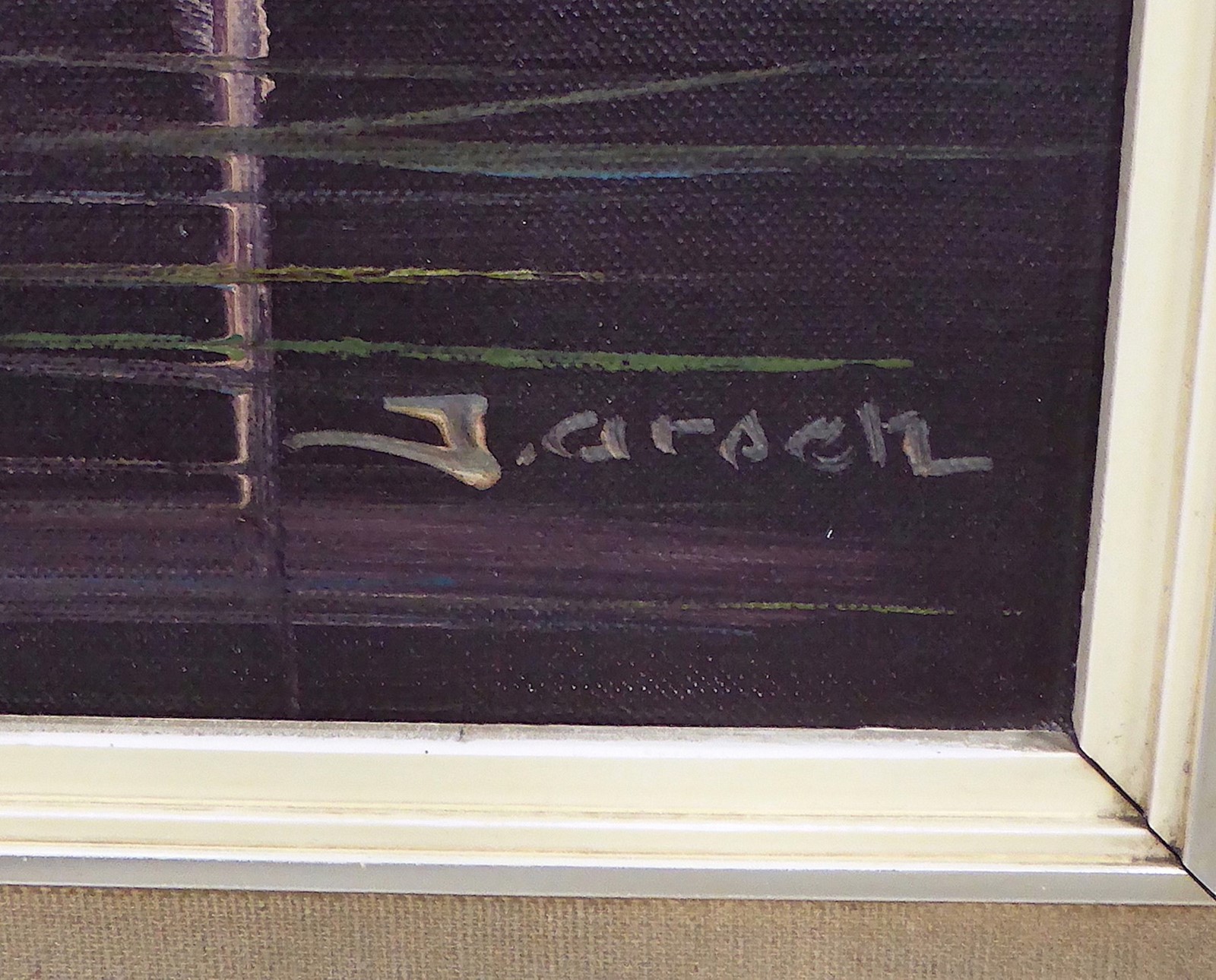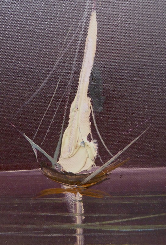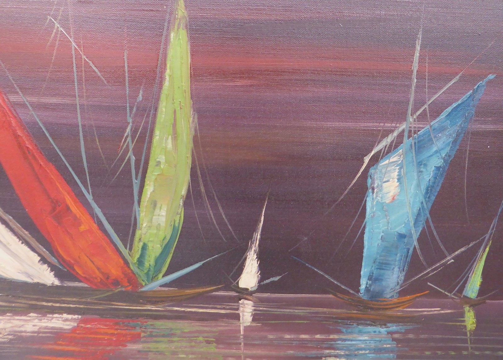 A very attractive mid 20th century signed oil on canvas painting, presenting an abstract image of traditional Italian fishing boats with vividly coloured sails against a dark sky. It dates to about the 1950s and is mounted in a frame from the same period. There are a couple of minor areas of damage to the canvas with tape repairs to the back, but there is only minor evidence of damage to the actual painting. This fine decorative piece is ready to hang.