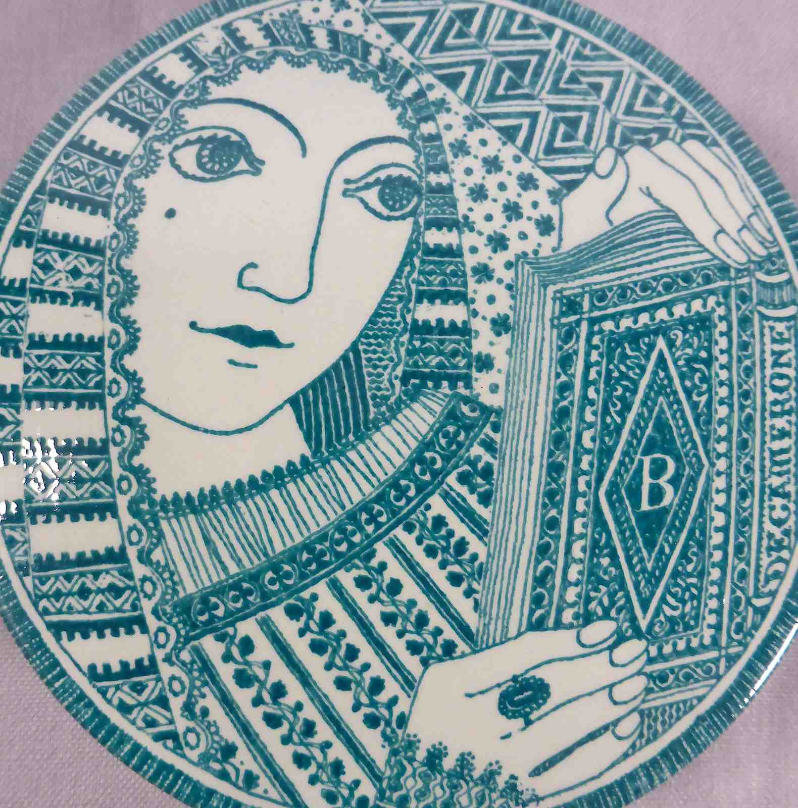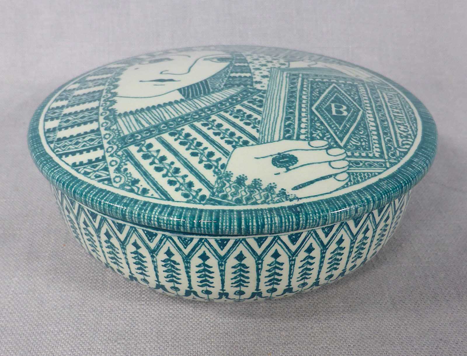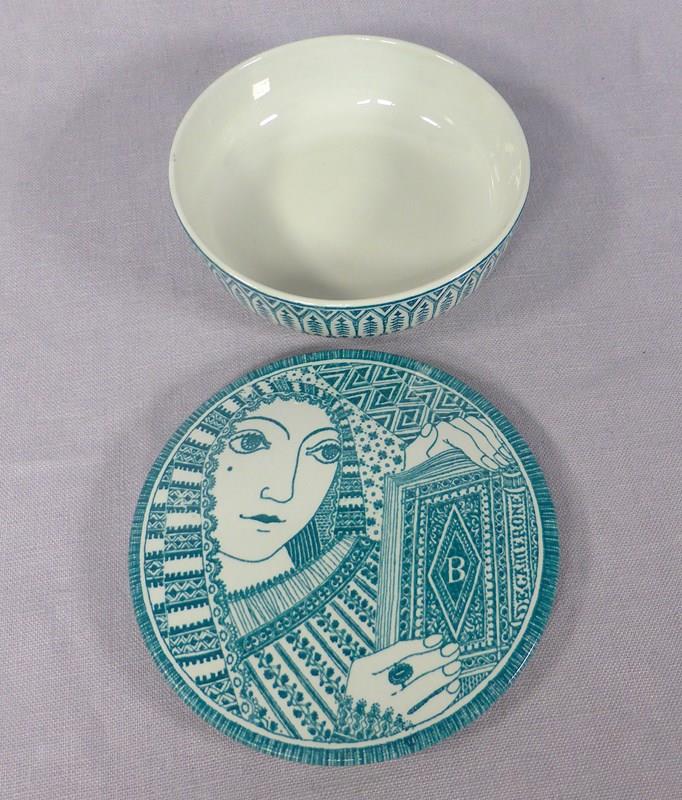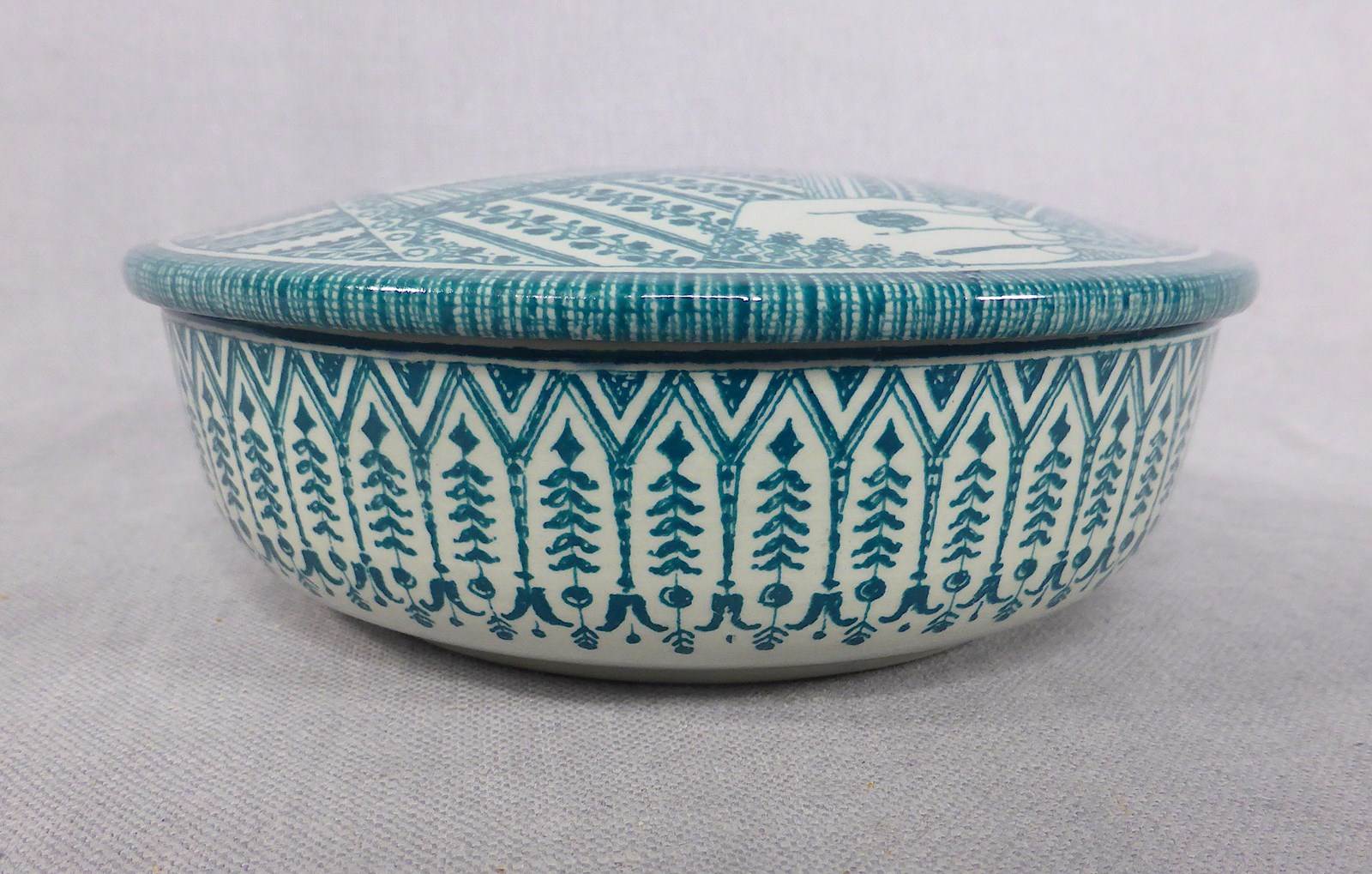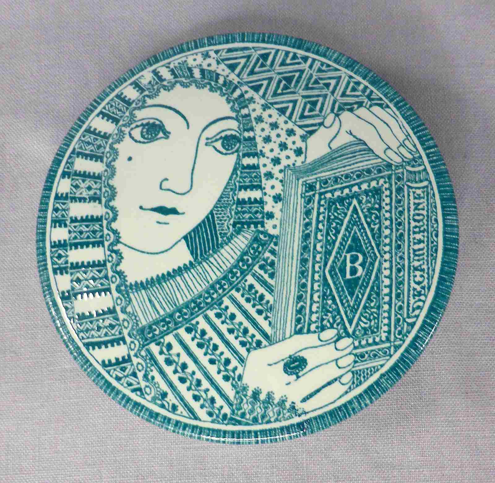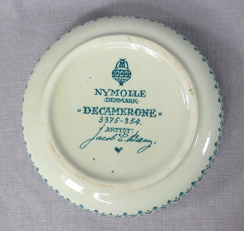 A beautiful ceramic powder bowl or trinket dish made in Denmark by Nymolle in the 1960s, and intended to sit on a lady's dressing table. It was designed by Jacob E Bang (1899-1965), a prolific Danish designer who worked in metal and ceramics, but is perhaps best known for the glass designs he produced with the Holmegaard Glass Factory. The design on this dish is called "Decamerone". This refers to the mid 14th century book "The Decameron" by the Italian author Giovanni Boccaccio. The book is made up of 100 short tales representing various aspects of the human condition. It is considered a masterpiece of early classical prose and has influenced many other writers. The dish is made of earthenware and features an image of a beautiful girl reading a copy of the book, printed in teal green against a white ground. The base bears the Nymole mark, the pattern name and number 3375-354, and Bang's printed signature.