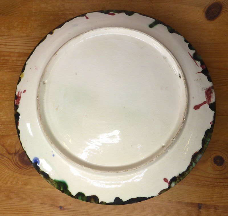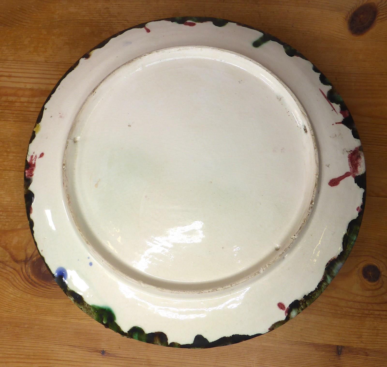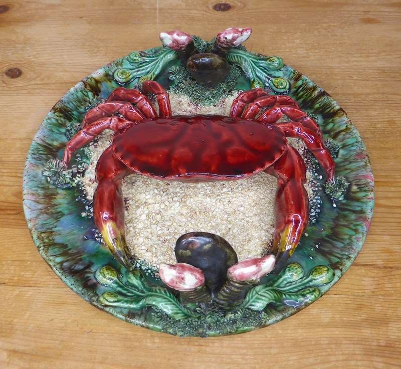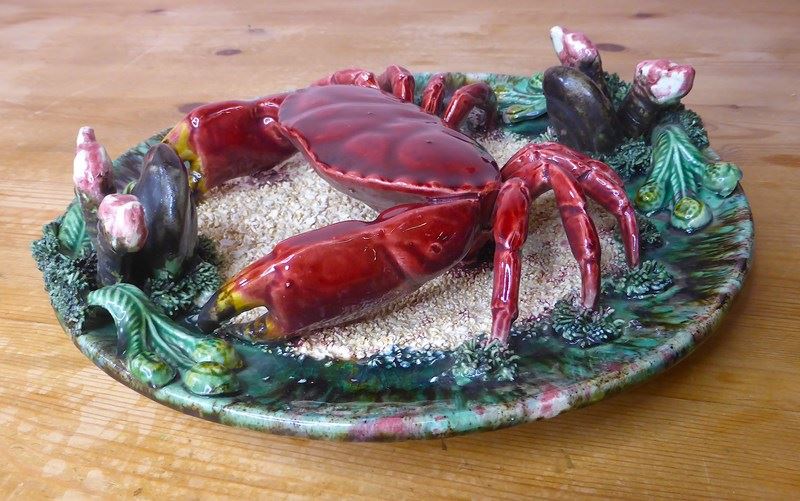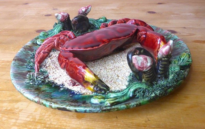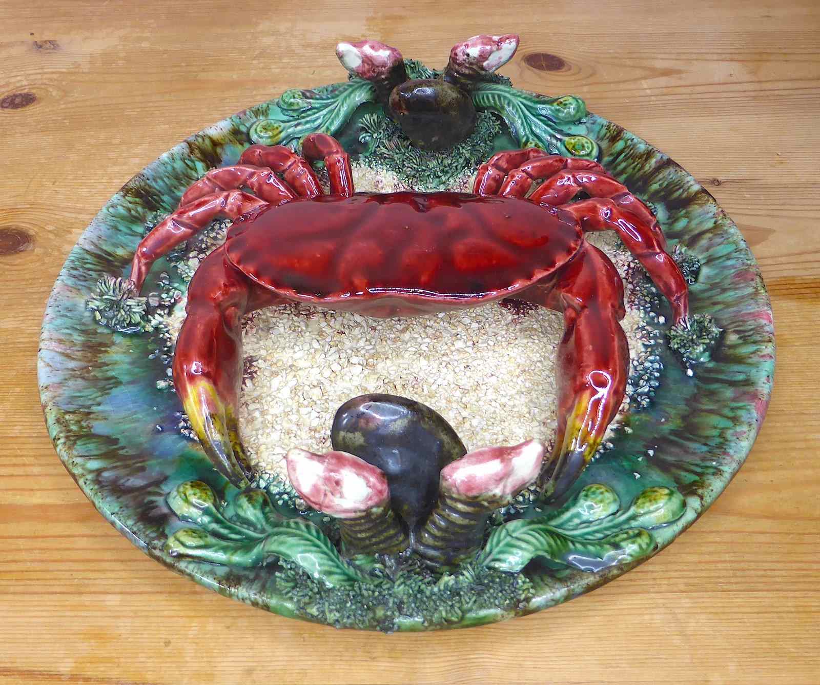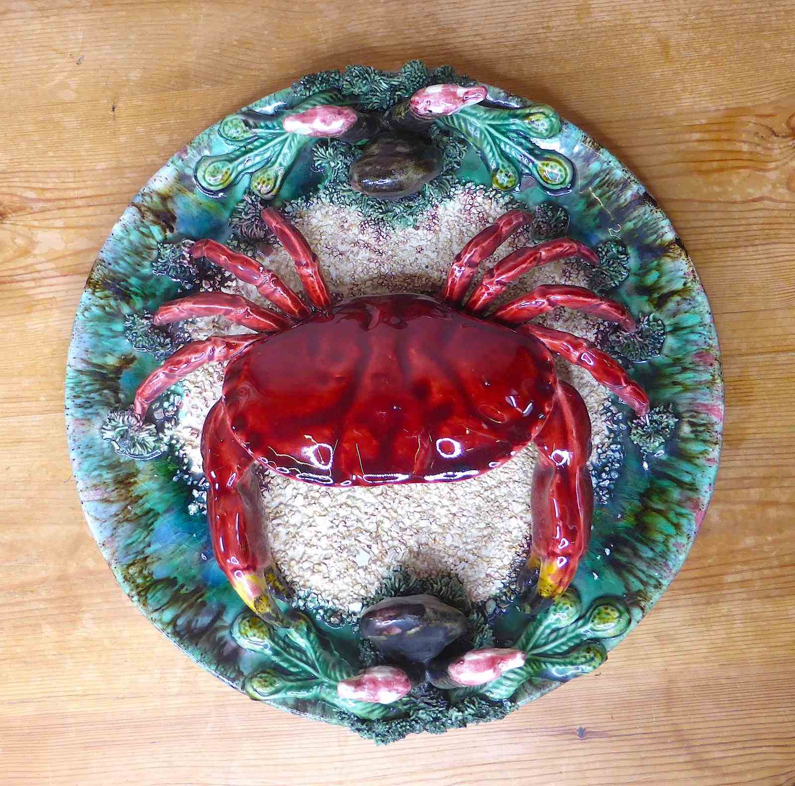 A fabulous Palissy style Portuguese majolica wall plate, dating to approximately the early 20th century. Typically of these pieces it features decoration in hight relief, textured surfaces and a colourfully glossy majolica glaze. In the middle is a crab sitting on a surface of glazed ceramic chips, with seaweed, goose barnacles and muscle shells round the edge, all of which are well modelled. There are holes in the back-rim to allow for ease of hanging.