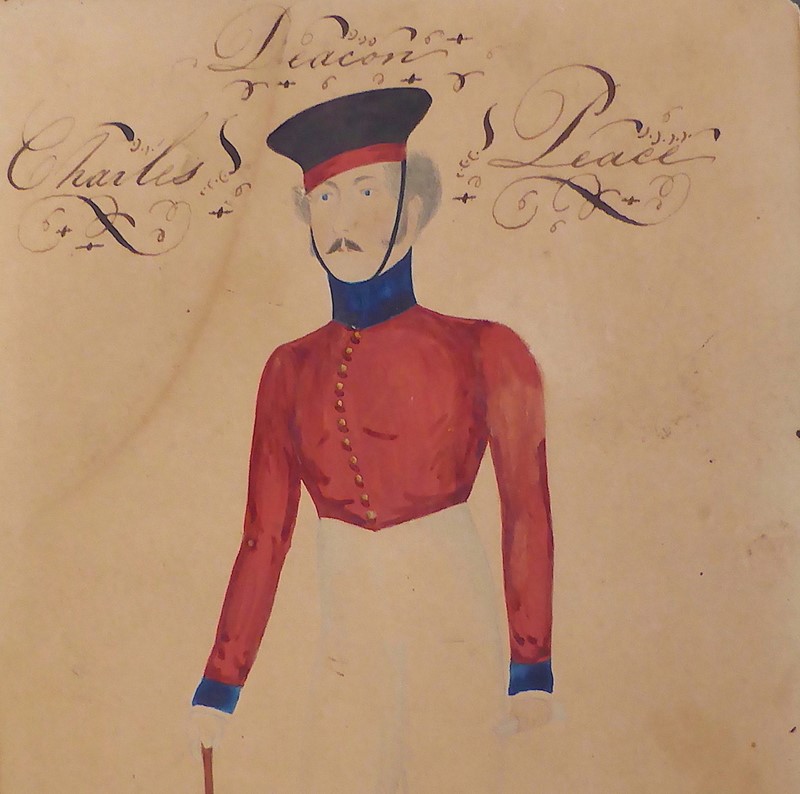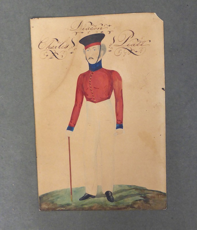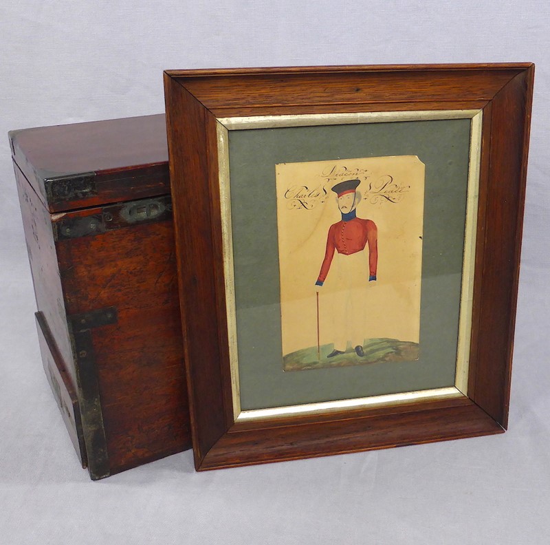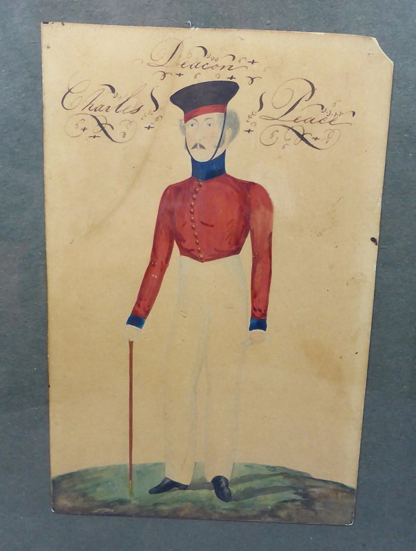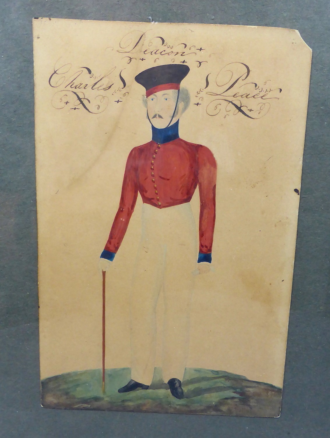 A wonderful primitive folk art watercolour painting of Charles Deacon Peace in his military uniform, dating to the 1840s. It is painted on paper and Peace's name is written in elaborate script above. The painting is beautifully if naively done and Peace looks very dapper. It is framed behind glass in a later frame. There is a little fading to the lighter paint colours and minor browning to the paper. Peace was born on 25th December 1809 to William & Mary Peace of Netherseal in South Derbyshire. Forces War Records show that his service number was 431, and that he was a Private in the 2nd Regiment of Life Guards between 1841 and 1851. The painting shows him wearing his uniform from this time. The regiment was based in Regents Park in London and at this time was engaged in maintaining public order in London.