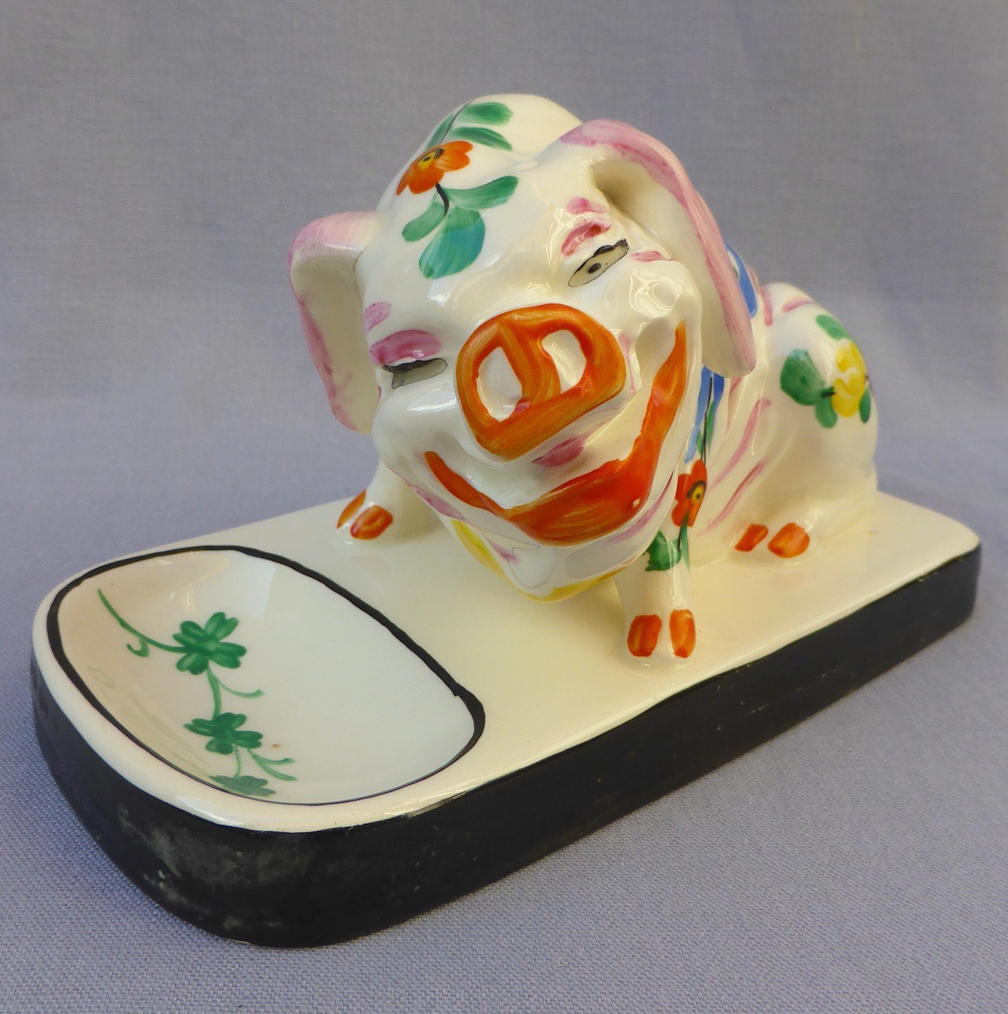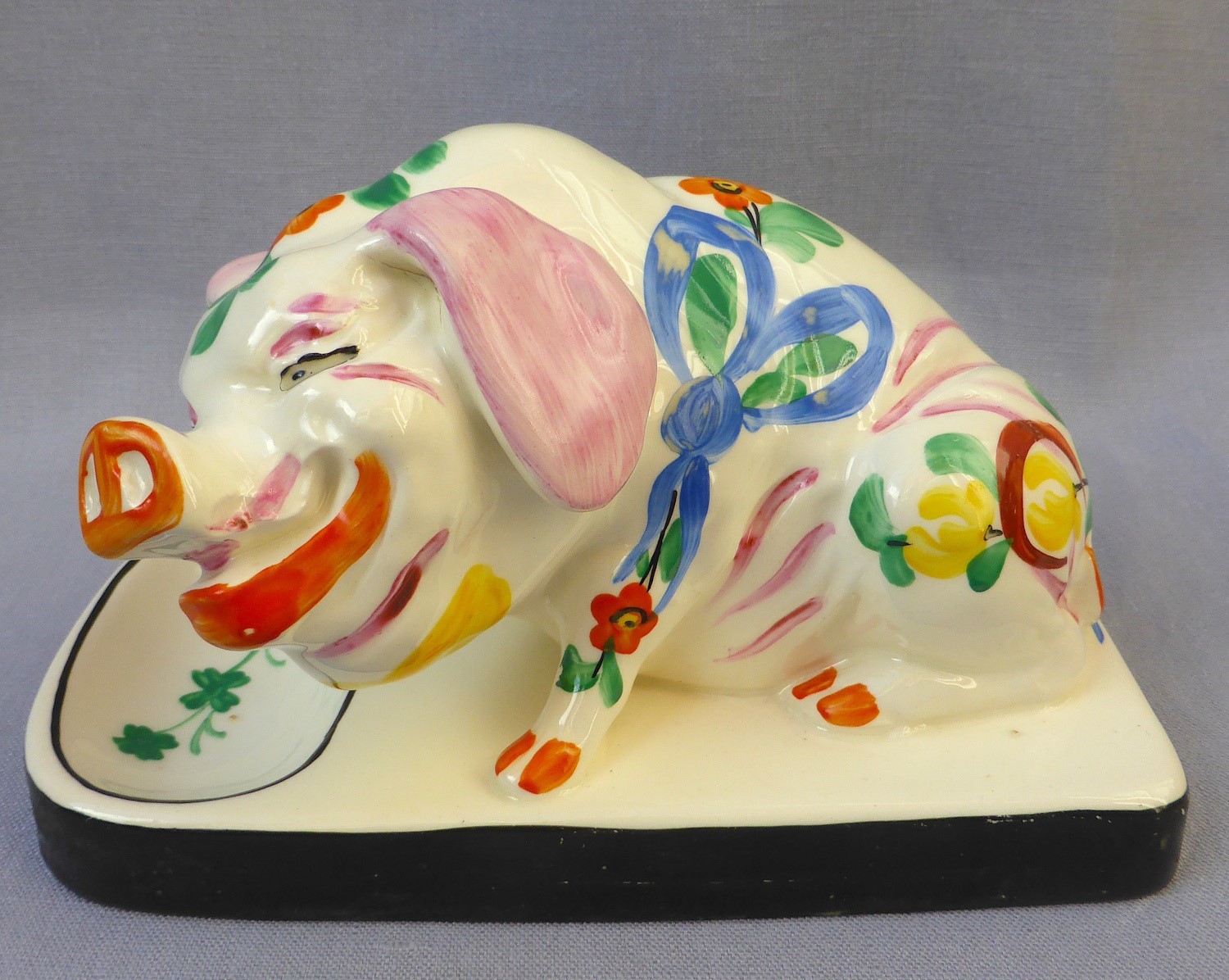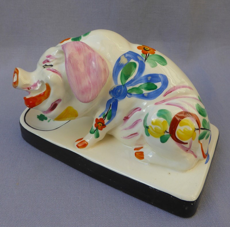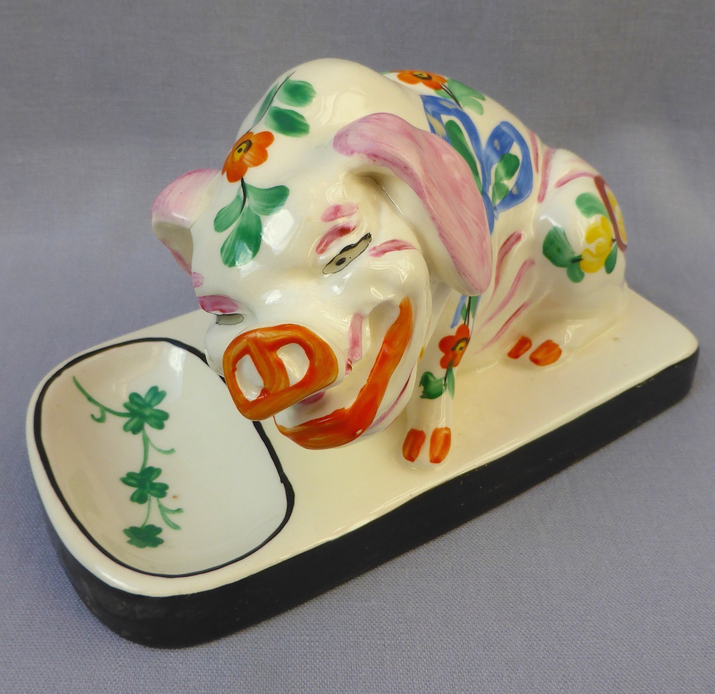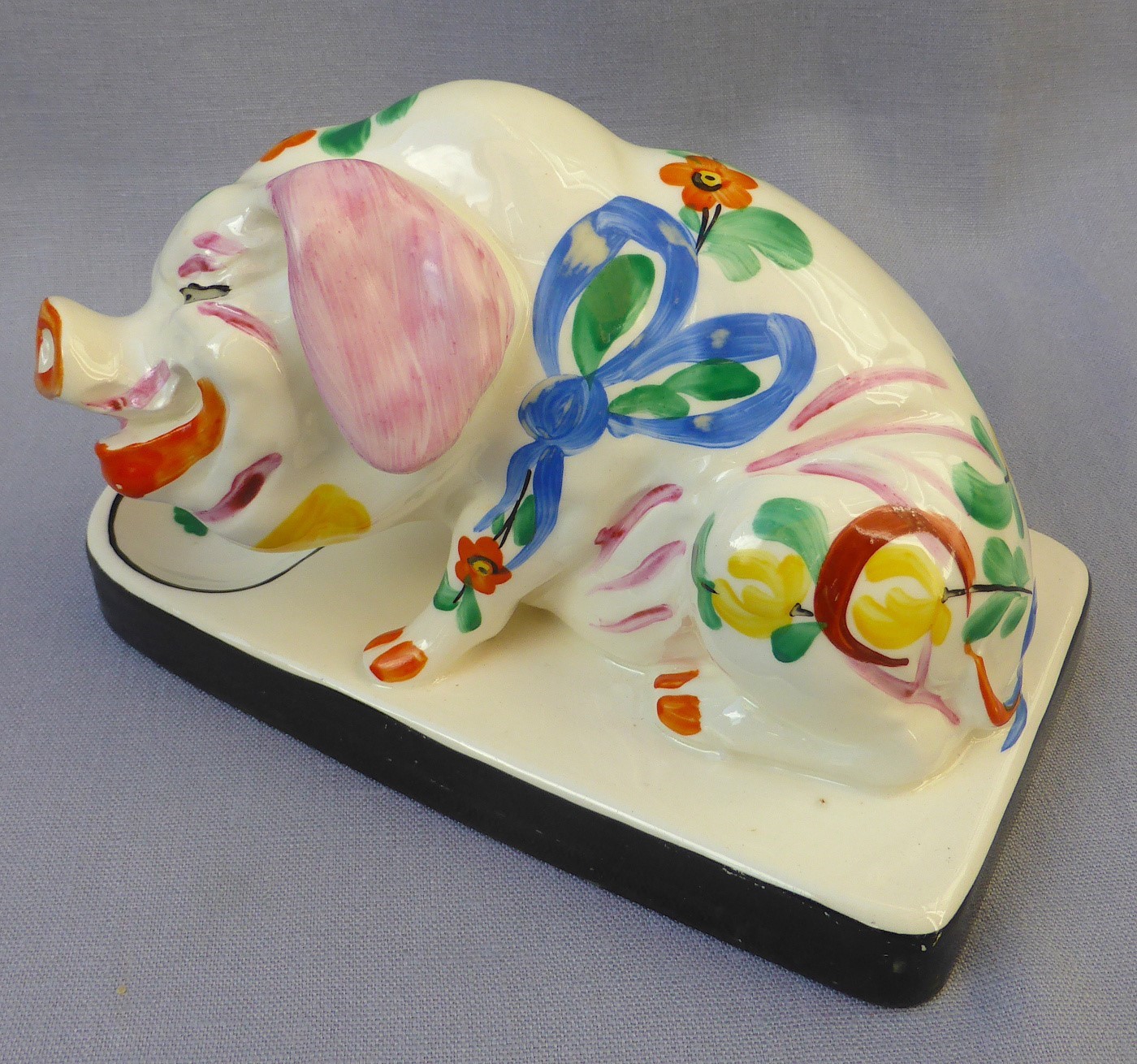 A very rare ceramic figurine of a pig, made by the Ditmar Urbach factory in Czechoslovakia in the 1930s. The factory made a number of slightly grotesque looking animals all of which were handpainted. This pig is decorated with brightly coloured flowers and bows and has a typically grotesque face. His base is impressed with a number 2 and faintly with 11094. He bears no maker's mark, as is common, but is unmistakably Ditmar Urbach.