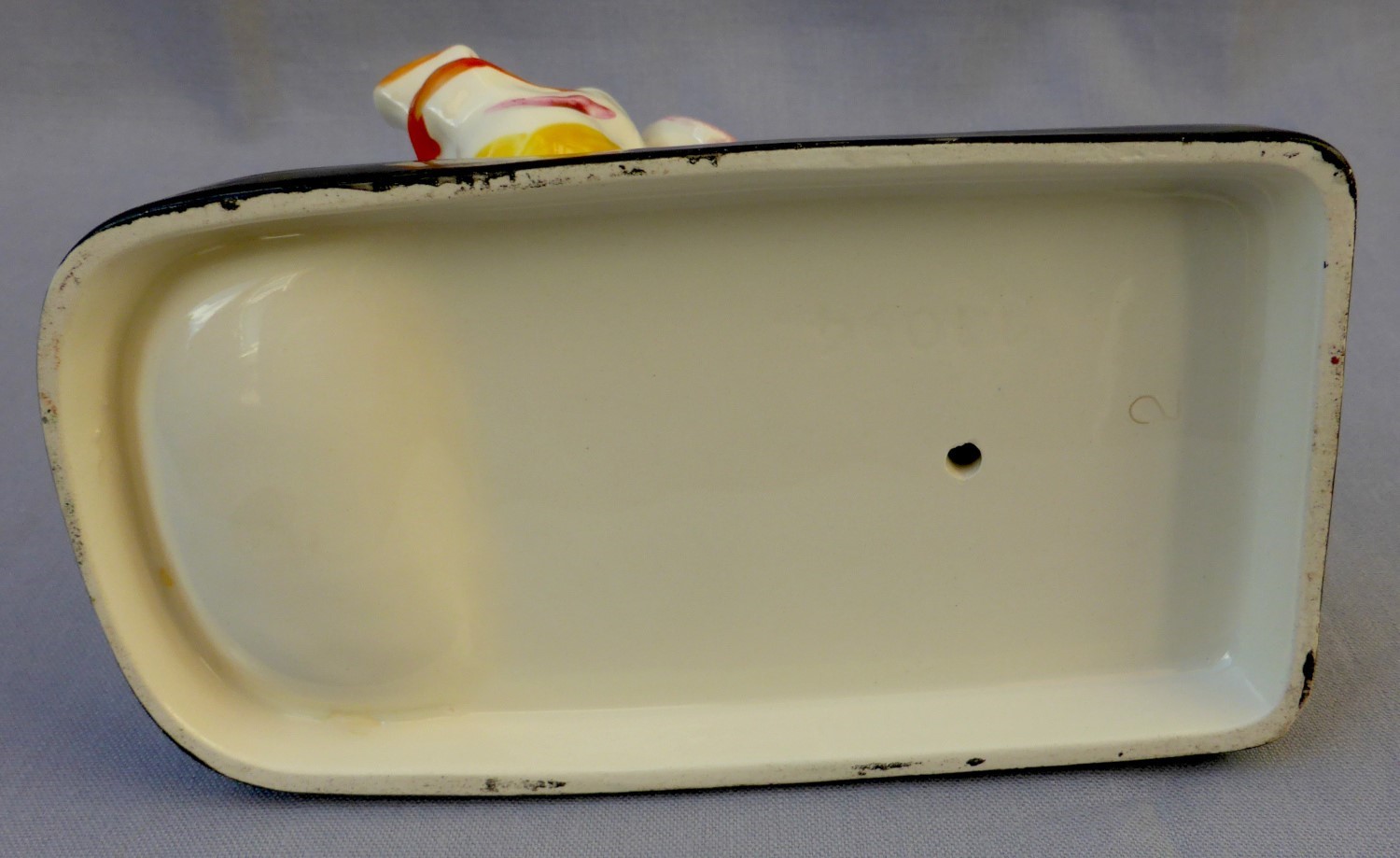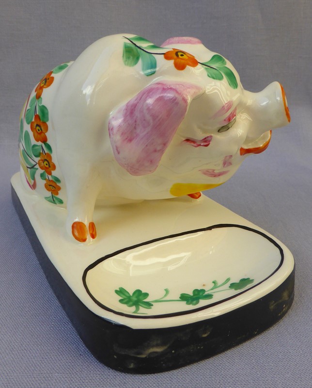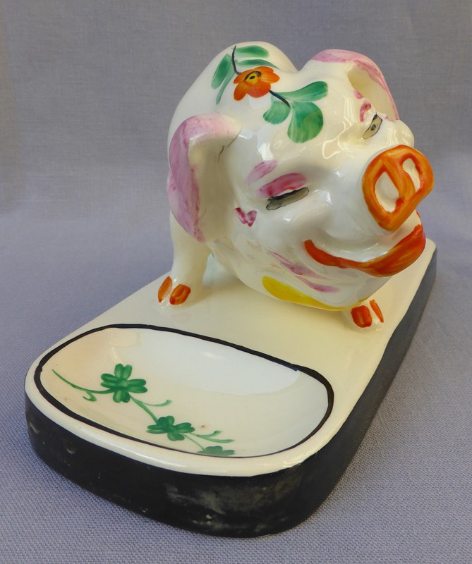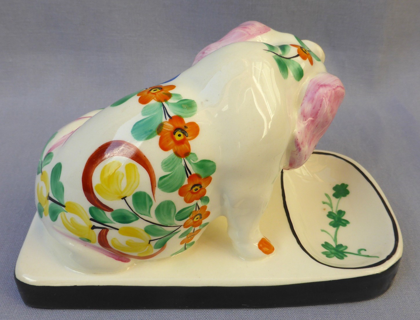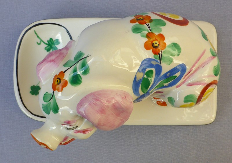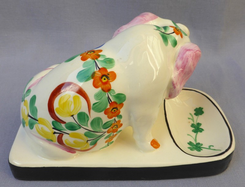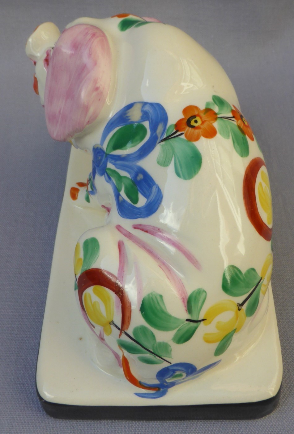 A very rare ceramic figurine of a pig, made by the Ditmar Urbach factory in Czechoslovakia in the 1930s. The factory made a number of slightly grotesque looking animals all of which were handpainted. This pig is decorated with brightly coloured flowers and bows and has a typically grotesque face. His base is impressed with a number 2 and faintly with 11094. He bears no maker's mark, as is common, but is unmistakably Ditmar Urbach.