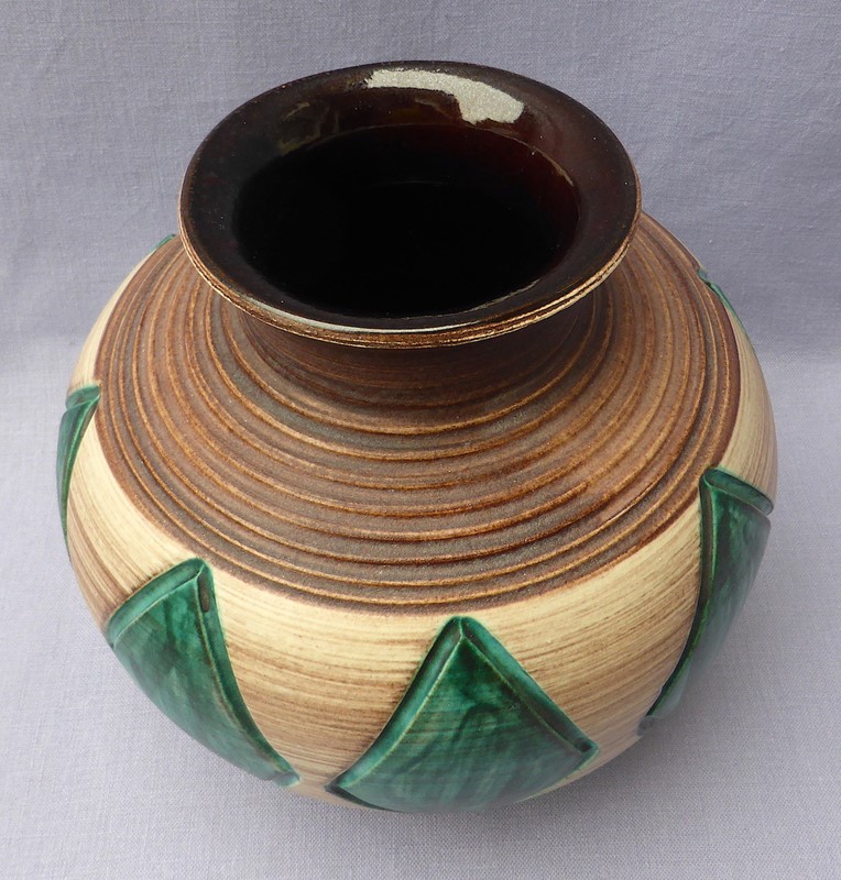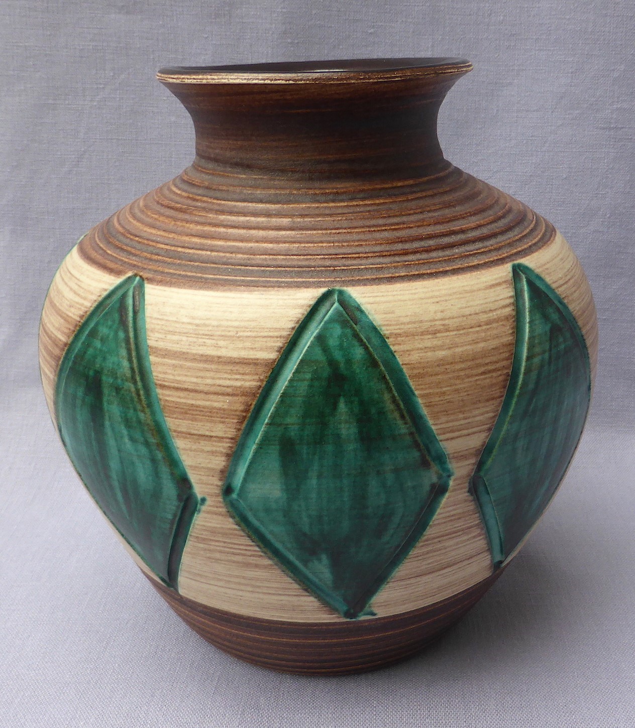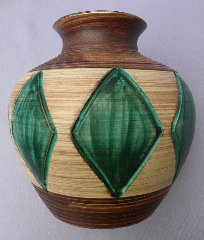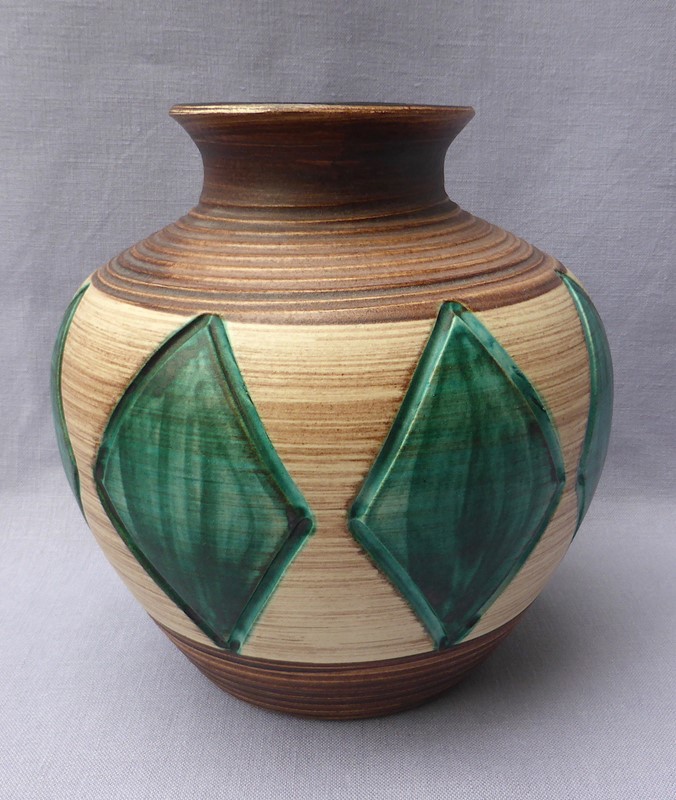 A large and very stylish mid 20th century vase, probably originating from Germany or France. It is made of stoneware and has attractive ribbed and cut decoration, with the sides of the green diamonds deeply incised into the clay. It has a really tactile appeal. It bears no maker's marks. The condition is generally good but there are a few minor blemishes to the glaze.