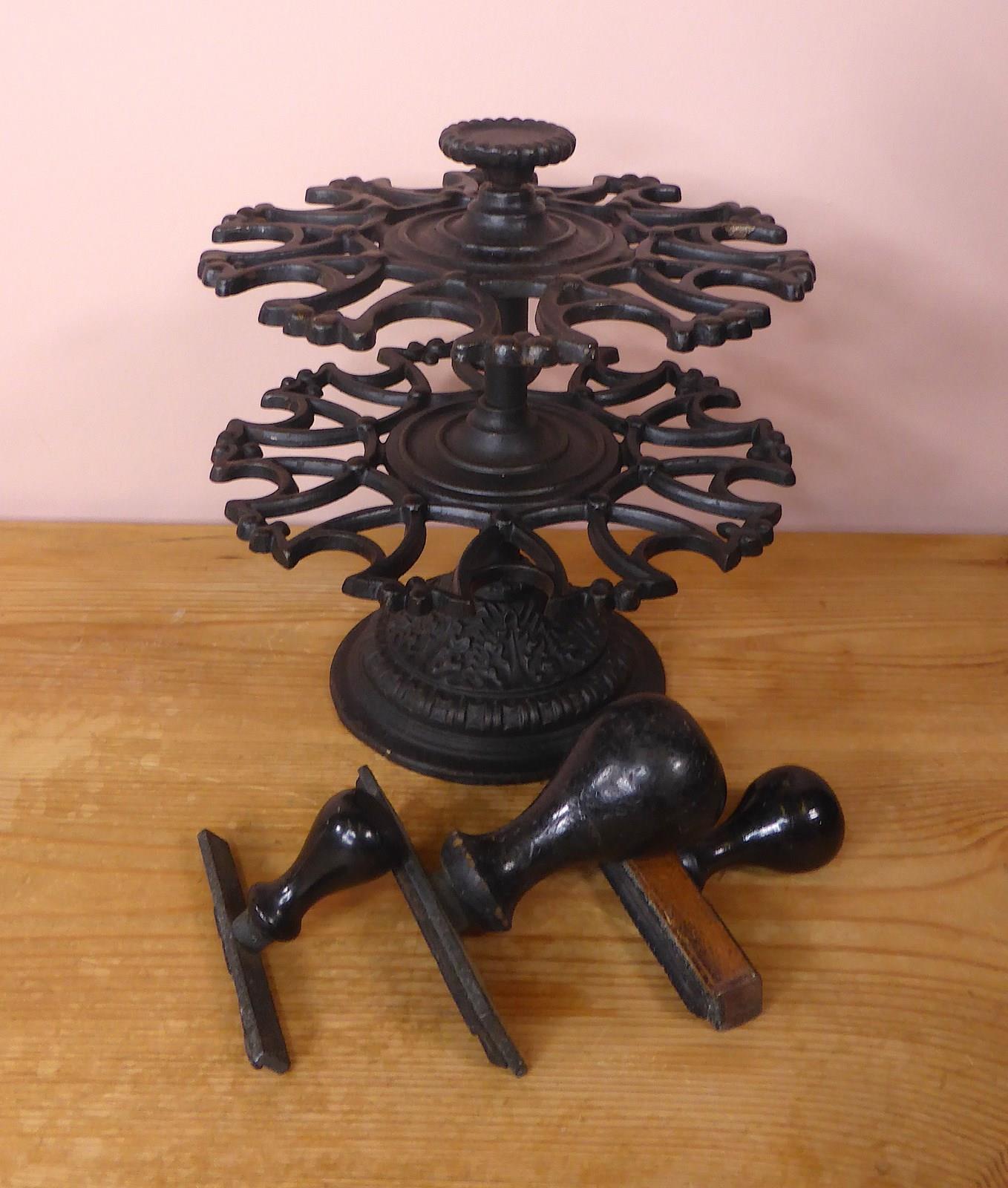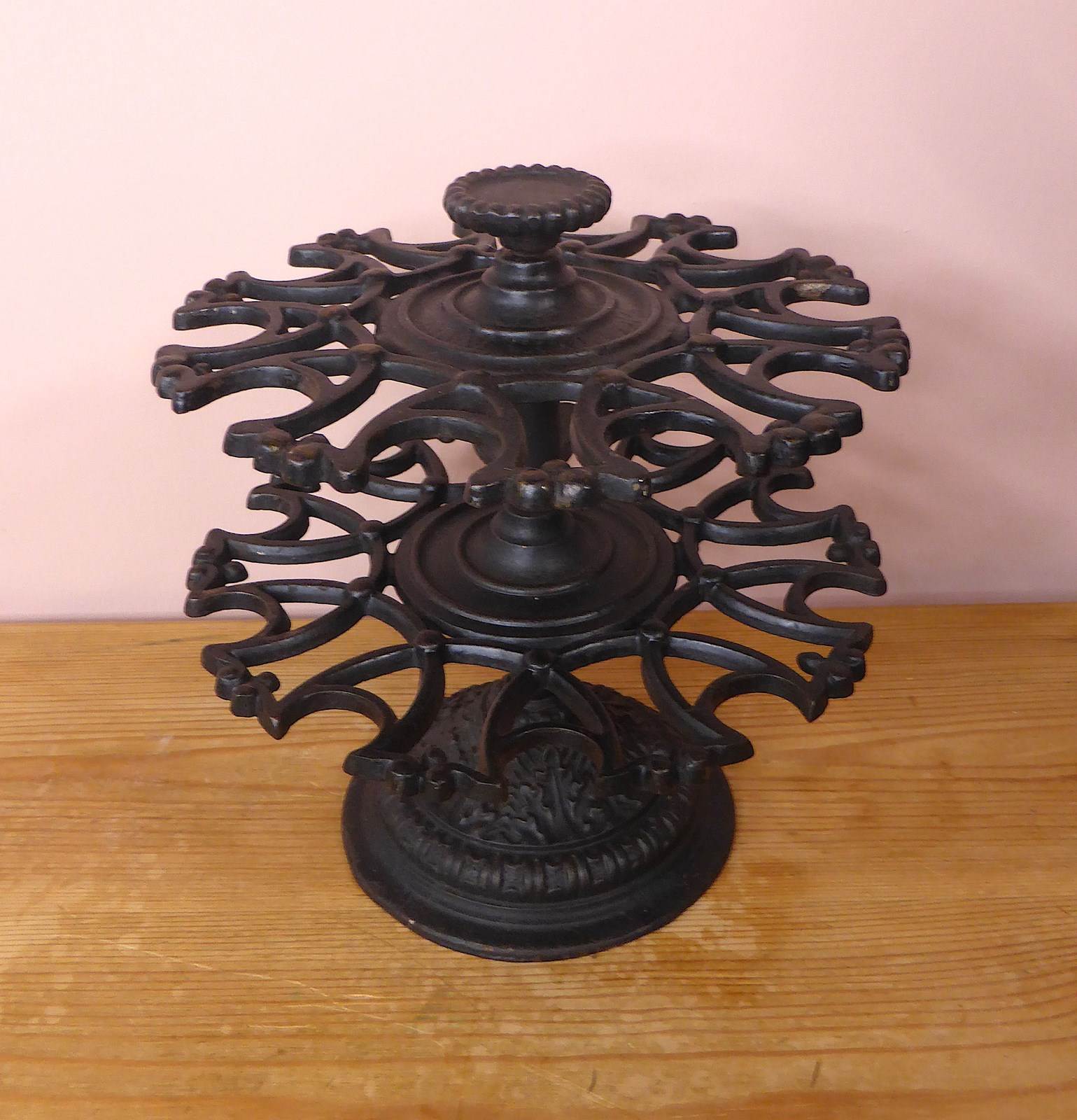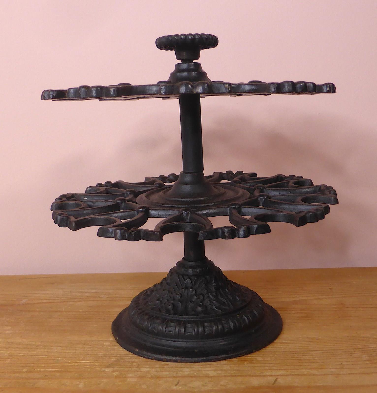 An attractive industrial two-tier rotating stamp holder that would have stood on an office desk in the early 20th century. It is quite an elaborate design with decorative flourishes on the end of each arm, and acanthus leaf relief moulding around the base. It retains its original black paintwork with traces of gold detailing. The two circular tiers hold 10 stamps each, with the top tier having wider apertures than the bottom to hold larger stamps. The two tiers smoothly rotate independently of each other. The base is marked 'Made in England'. This is an interesting and attractive piece of now defunct industrial desk furniture.