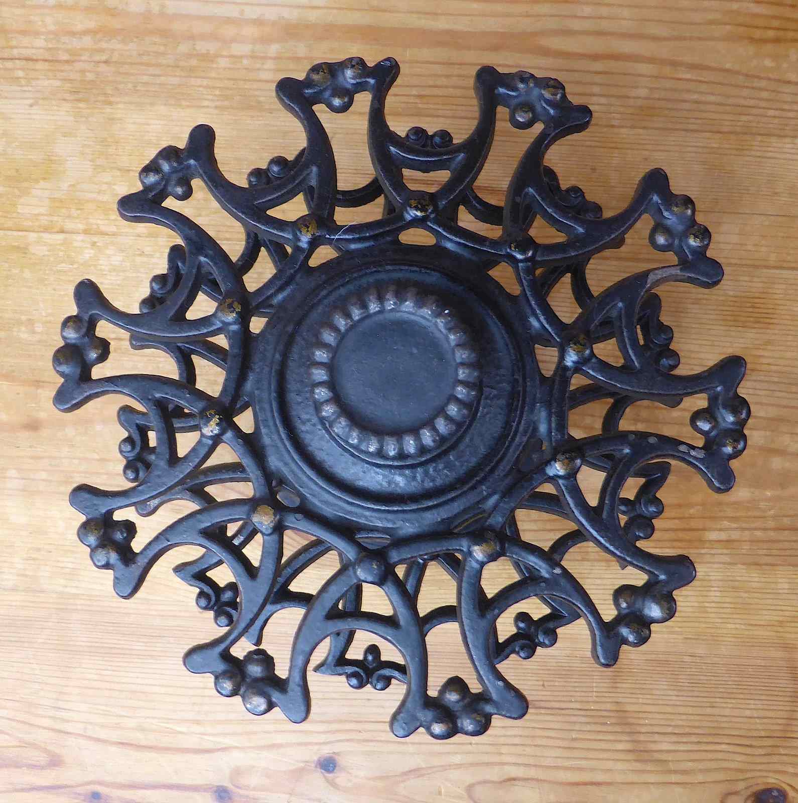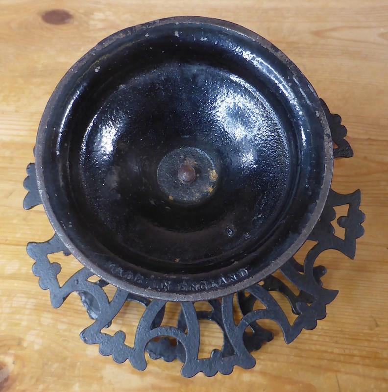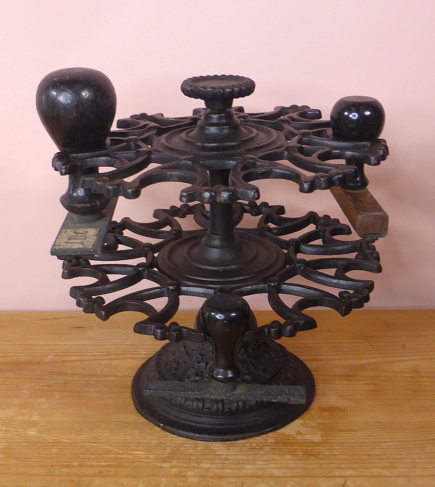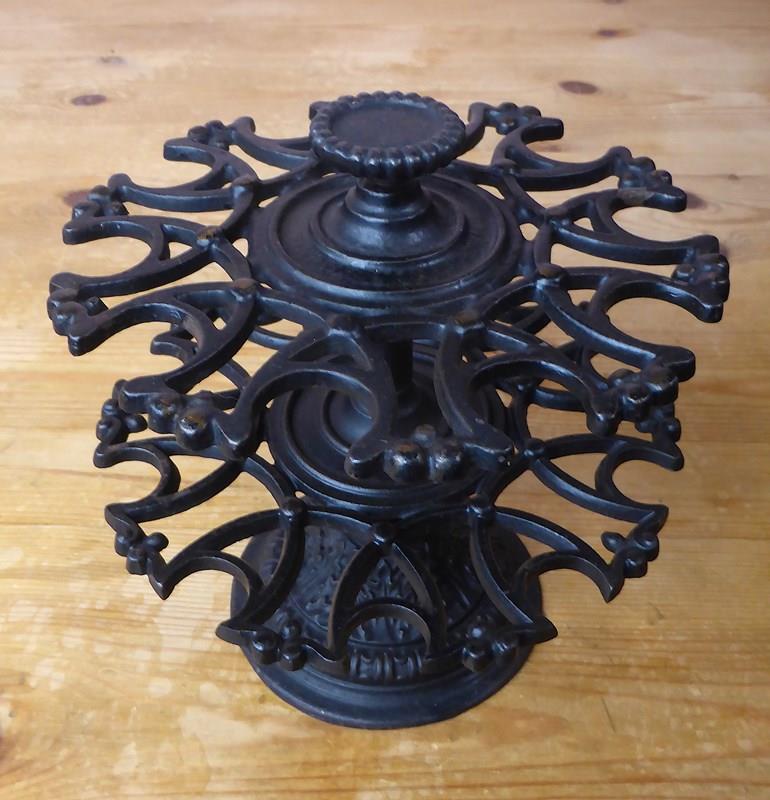 An attractive industrial two-tier rotating stamp holder that would have stood on an office desk in the early 20th century. It is quite an elaborate design with decorative flourishes on the end of each arm, and acanthus leaf relief moulding around the base. It retains its original black paintwork with traces of gold detailing. The two circular tiers hold 10 stamps each, with the top tier having wider apertures than the bottom to hold larger stamps. The two tiers smoothly rotate independently of each other. The base is marked 'Made in England'. This is an interesting and attractive piece of now defunct industrial desk furniture.