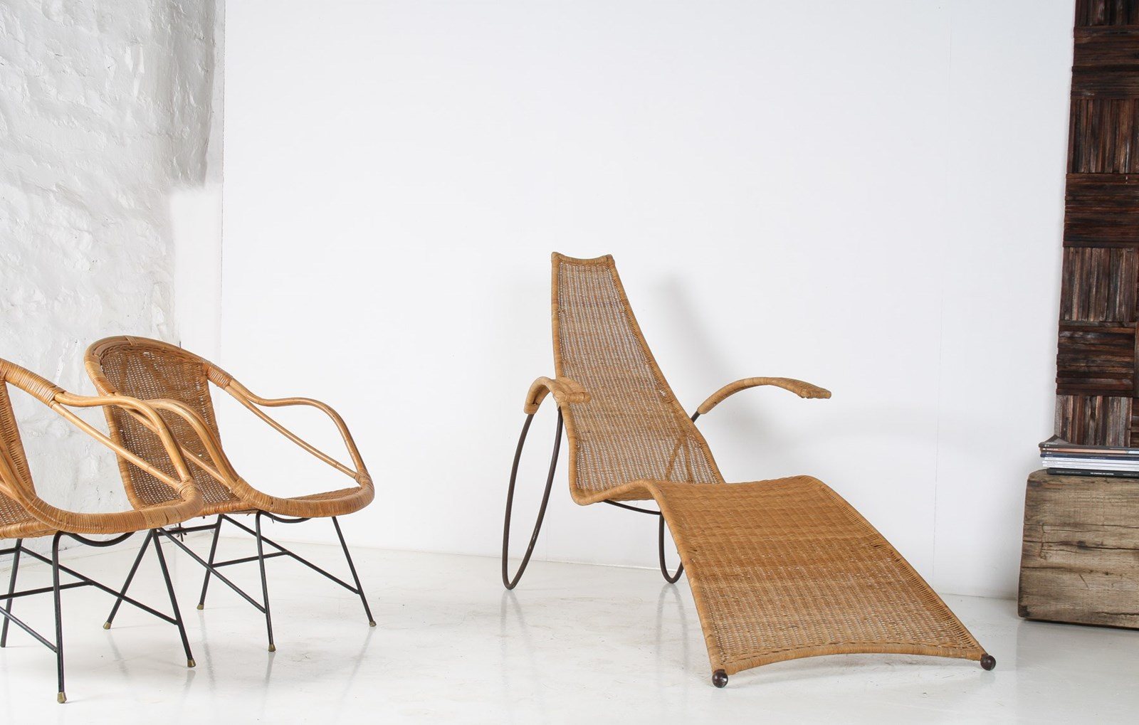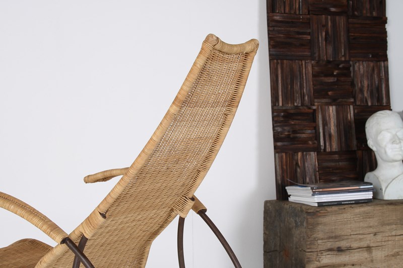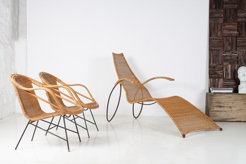 The heavy formed wrought frame is unusual, and formed in one piece with looped leg detail that sweeps to the arms, a design led piece that has wonderful presence. The Wicker is tightly woven and of very high quality, pointing to this being a high quality made piece. Has a mid-century feel although we believe it to be a much earlier piece due to its construction.