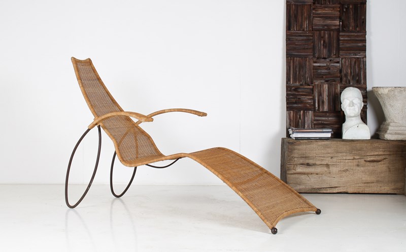 An unusual and beautifully formed, heavy wrought iron framed sun lounger with finely crafted wicker.