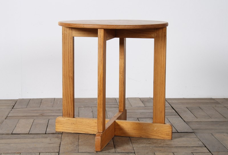 Introducing a Mid-Century Occasional Table in Solid Ash, a perfect blend of modernist simplicity and subtle influences from the Arts and Crafts movement. The piece features a simple single plank round top that rests elegantly on a square geometric cross frame, creating a striking yet understated design.