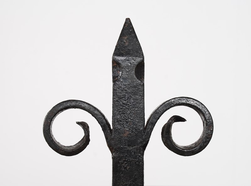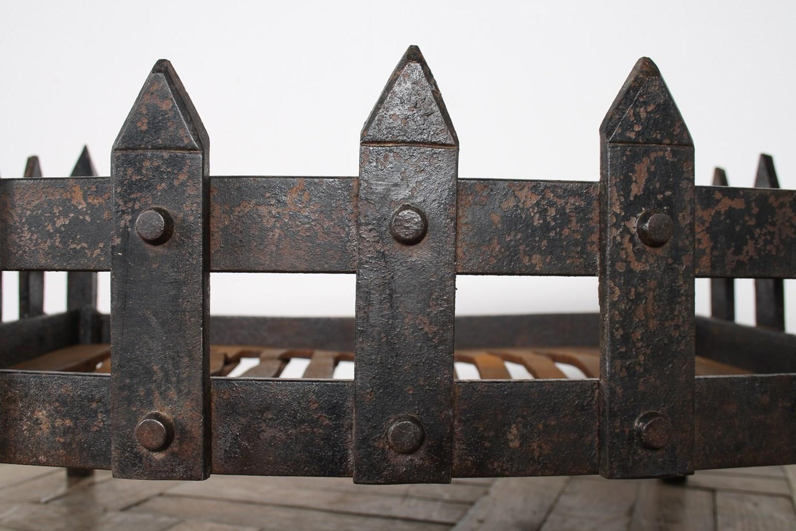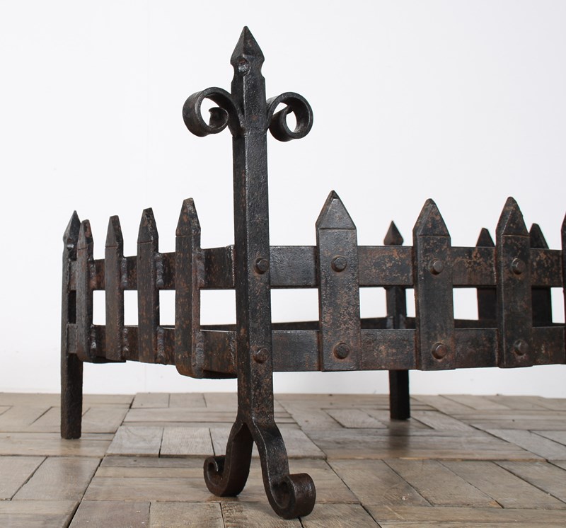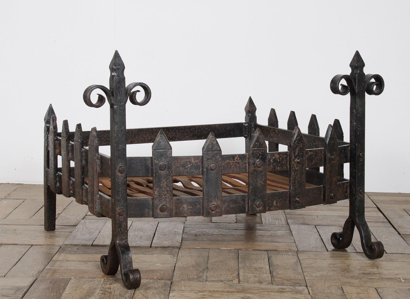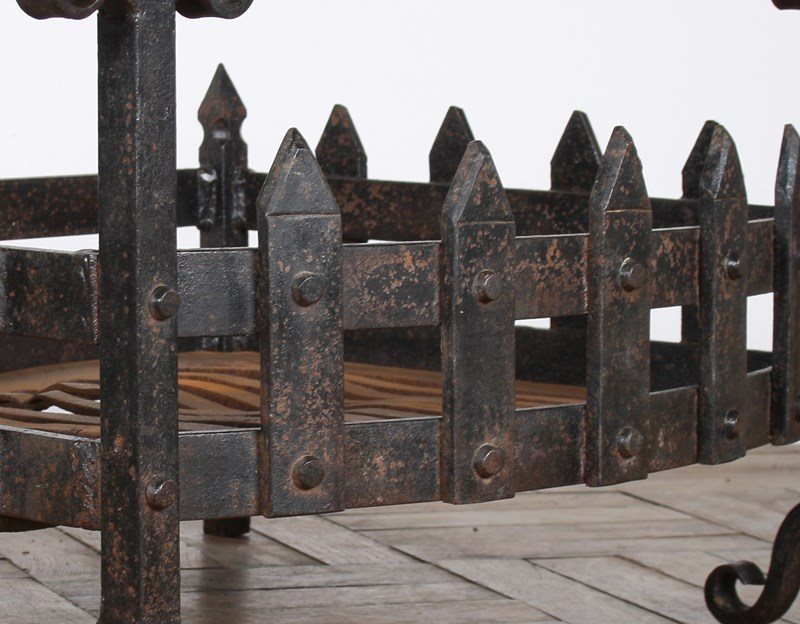 The basket features a gracefully bowed front adorned with castellated spikes, secured with skilfully forged iron rivets. The basket is bolstered on either side by solid iron bar, which is elegantly forged and embellished with a Fleur-de-lis scrolled motif and matching feet, each scroll delicately shaped.