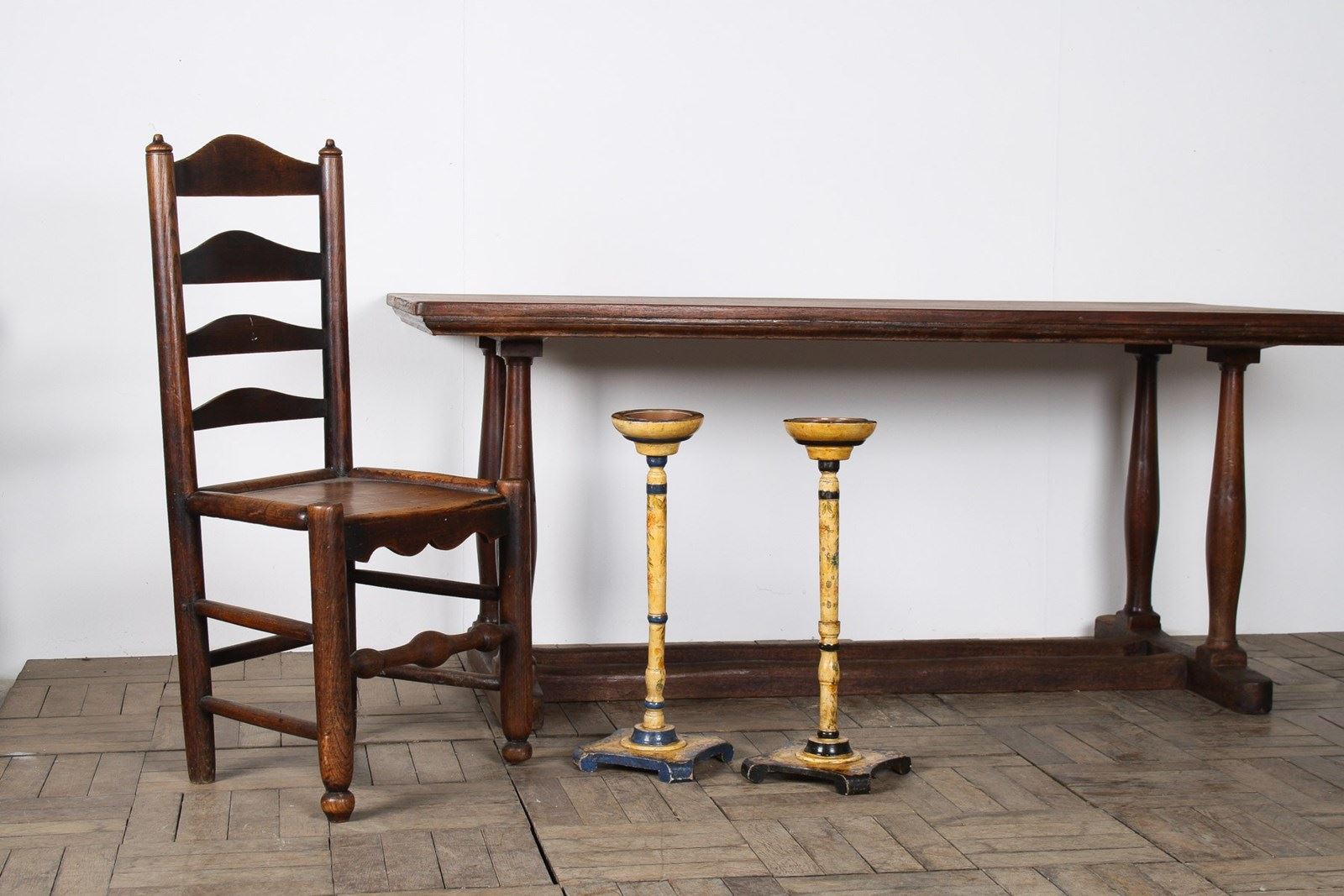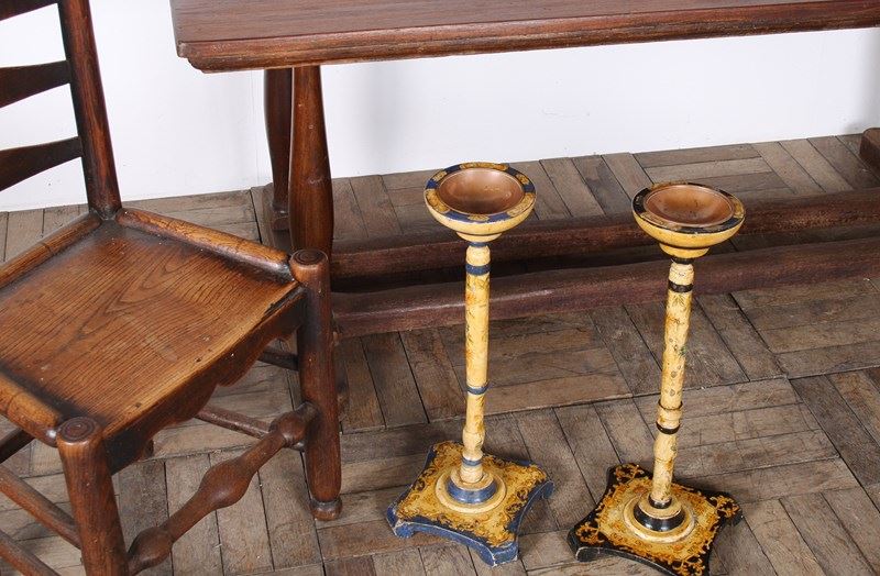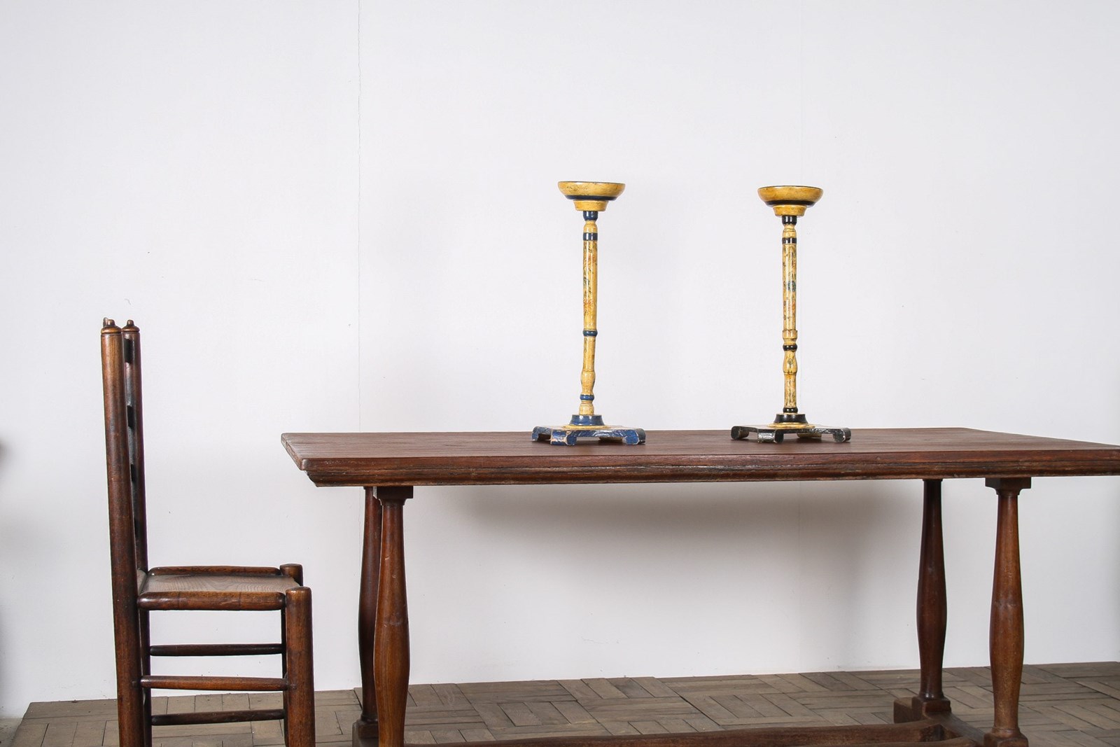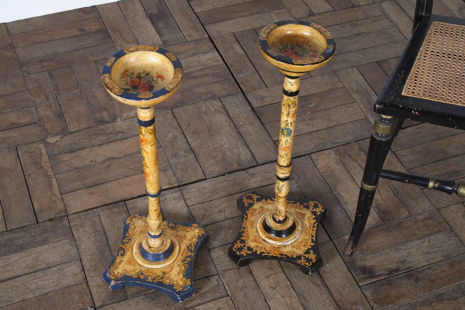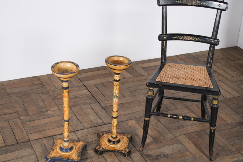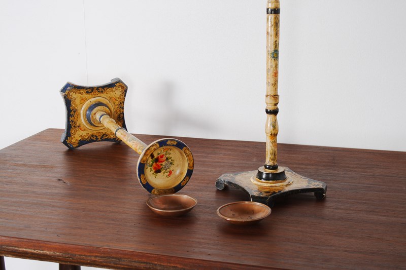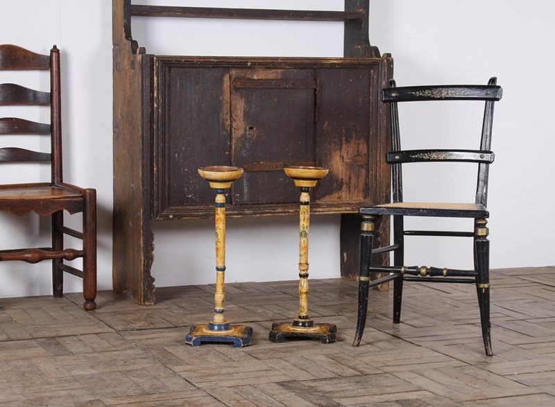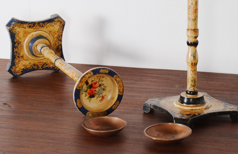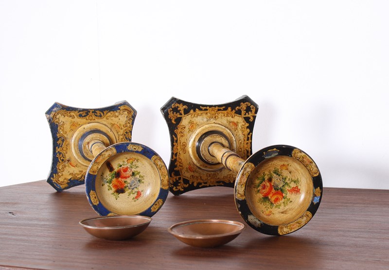 An unusual, rare pair of hand painted decorative candle sticks. Highly decorative with hand painted floral decoration on Gesso. Probably Asian, mid/late 19th Century