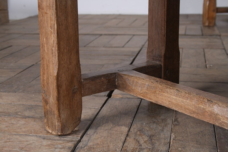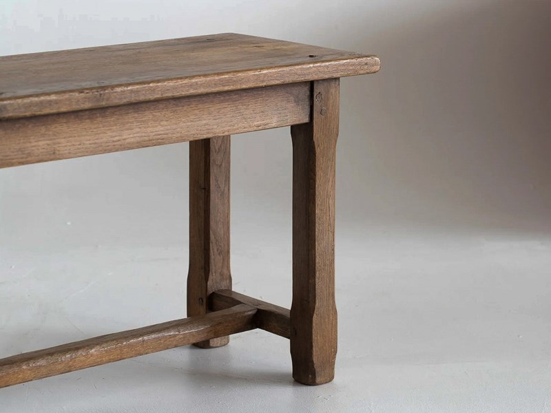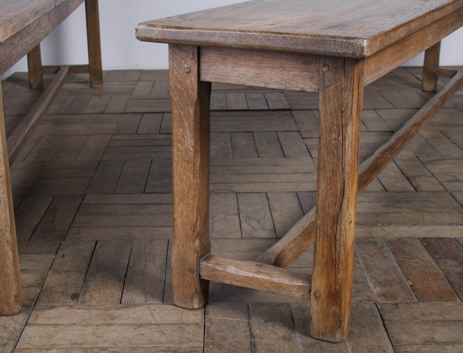 Each bench features a single wide two plank seat, providing generous seating space and a rustic charm. The seats are supported by a sturdy apron and a long stretcher that secures the legs, ensuring stability and strength. The benches are characterised by oak pegged joints, a hallmark of fine craftsmanship, adding to their aesthetic appeal.