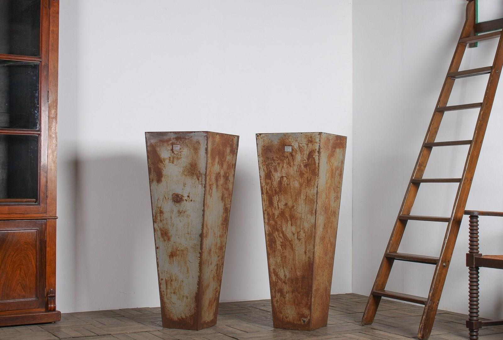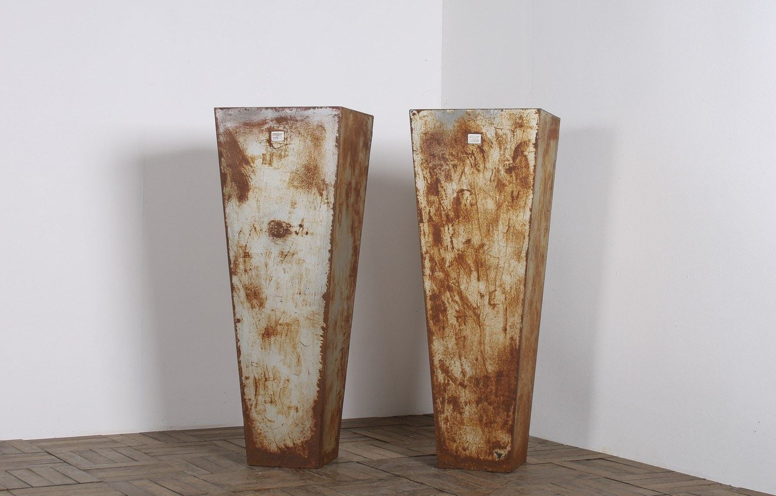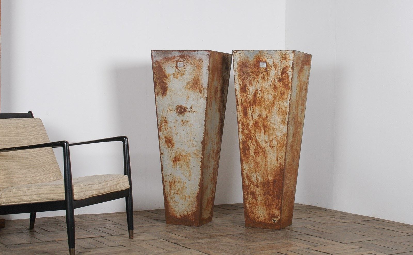 These plant stands feature a heavily rusted patina with remnants of old paint, capturing the essence of industrial spaces. Standing at 110 cm (43 inches) tall, they command attention while providing a robust and functional display. The large top opening measures 16 inches square, tapering down to 9 inches at the base, creating a visually dynamic silhouette.