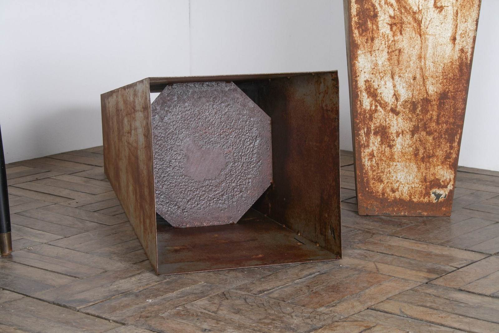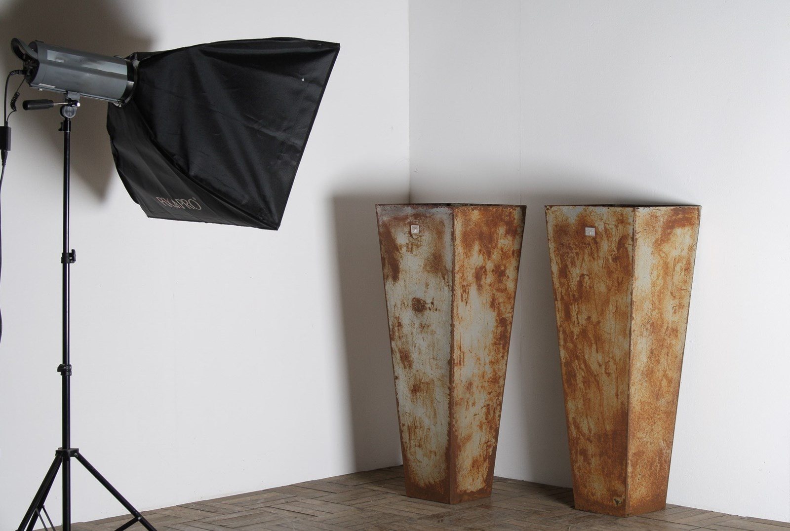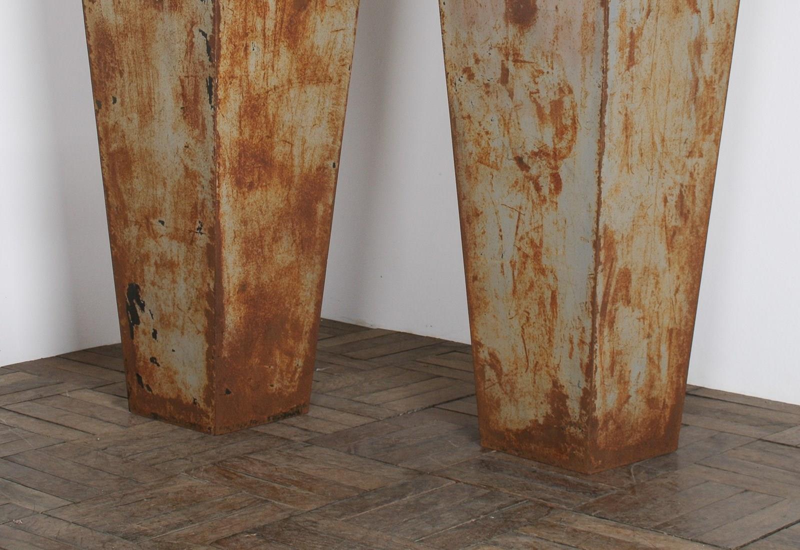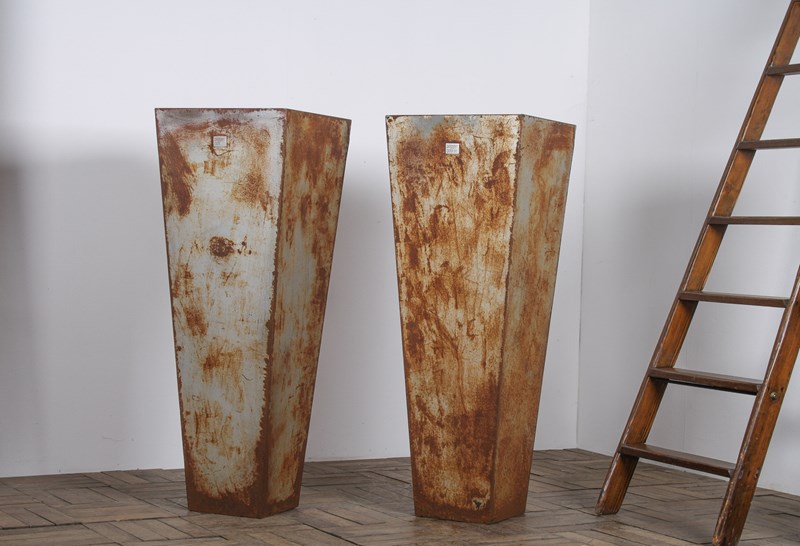 These plant stands feature a heavily rusted patina with remnants of old paint, capturing the essence of industrial spaces. Standing at 110 cm (43 inches) tall, they command attention while providing a robust and functional display. The large top opening measures 16 inches square, tapering down to 9 inches at the base, creating a visually dynamic silhouette.