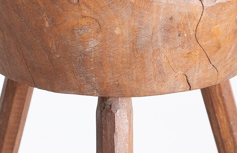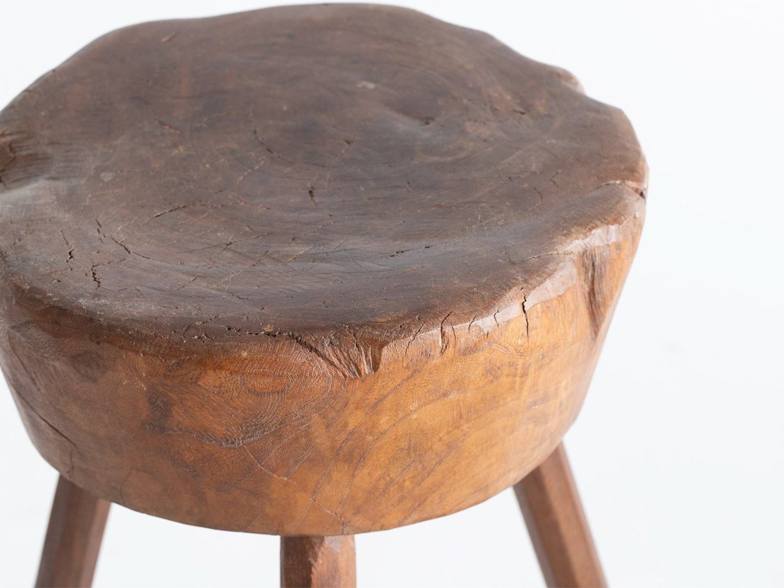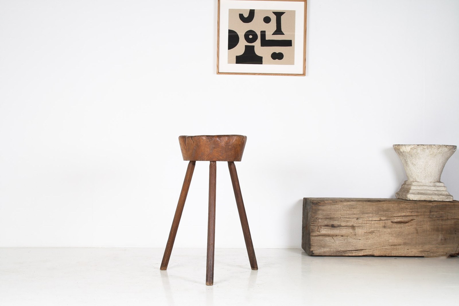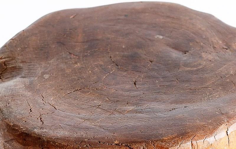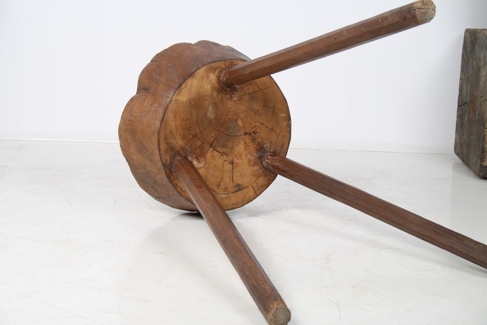 Crafted in France around 1900, this sculptural stand features a distinctive chopping block design, highlighting primitive construction techniques that reflect its rich history. With a generous top diameter of 40 cm (16 inches), it has a worn, uneven finish yet retains a relatively flat surface area.