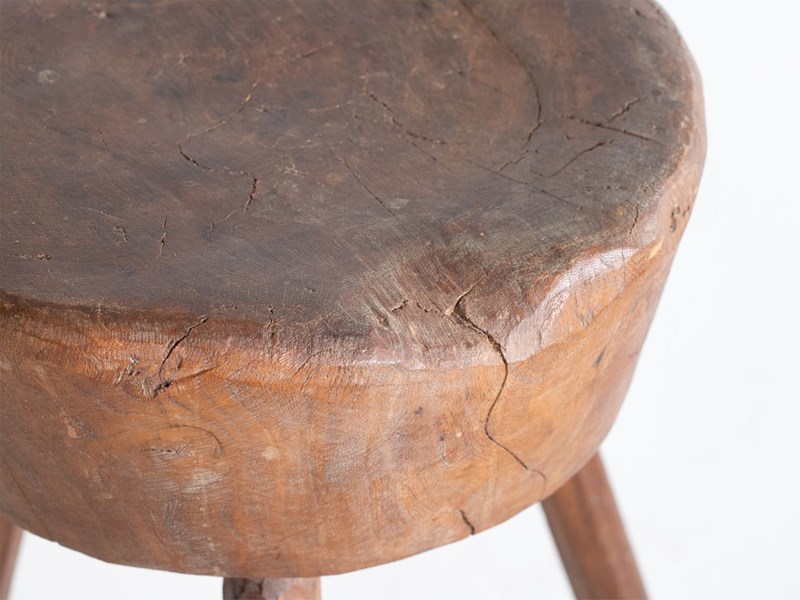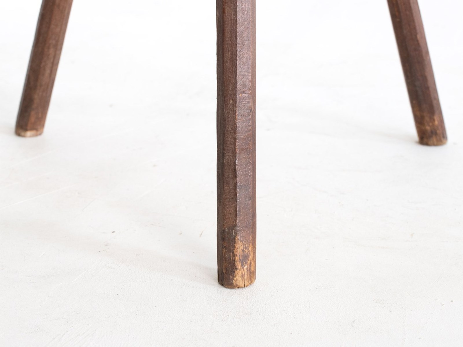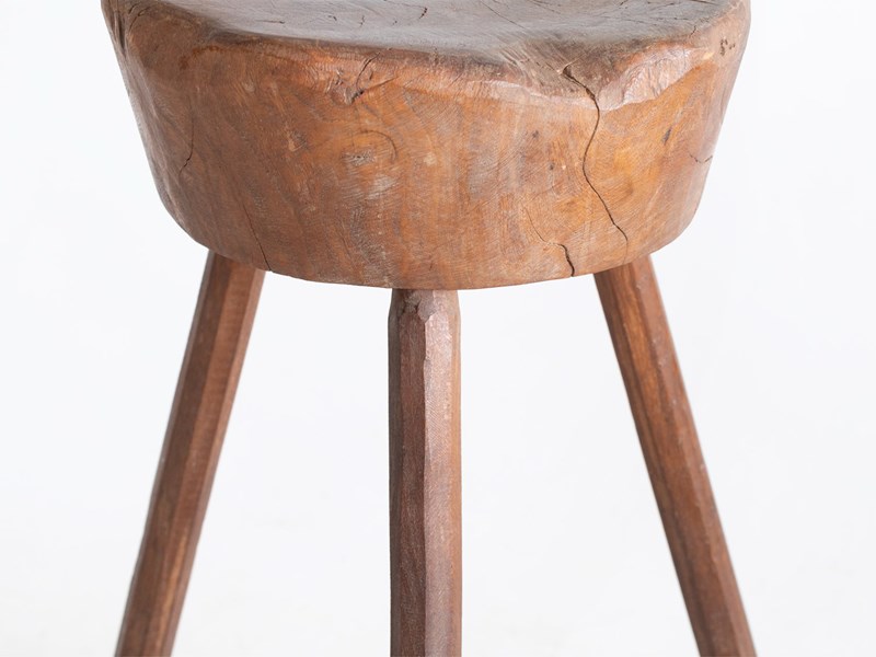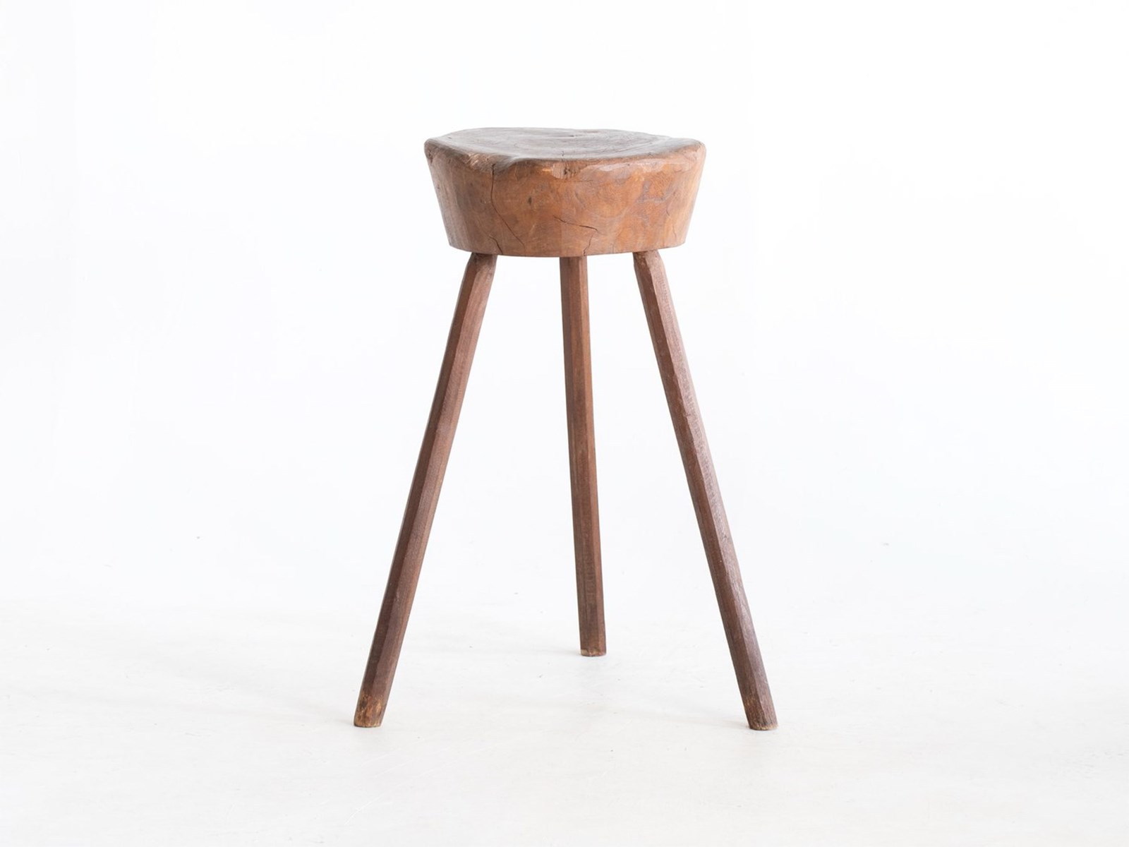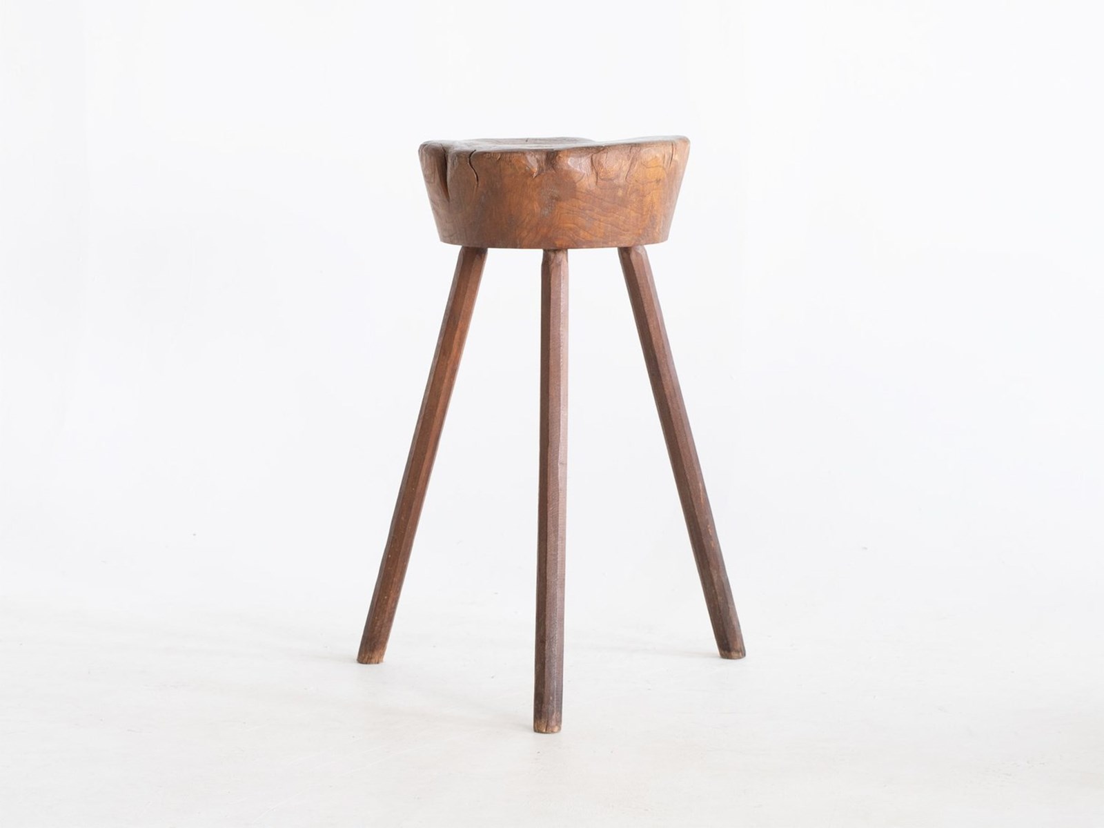 Crafted in France around 1900, this sculptural stand features a distinctive chopping block design, highlighting primitive construction techniques that reflect its rich history. With a generous top diameter of 40 cm (16 inches), it has a worn, uneven finish yet retains a relatively flat surface area.